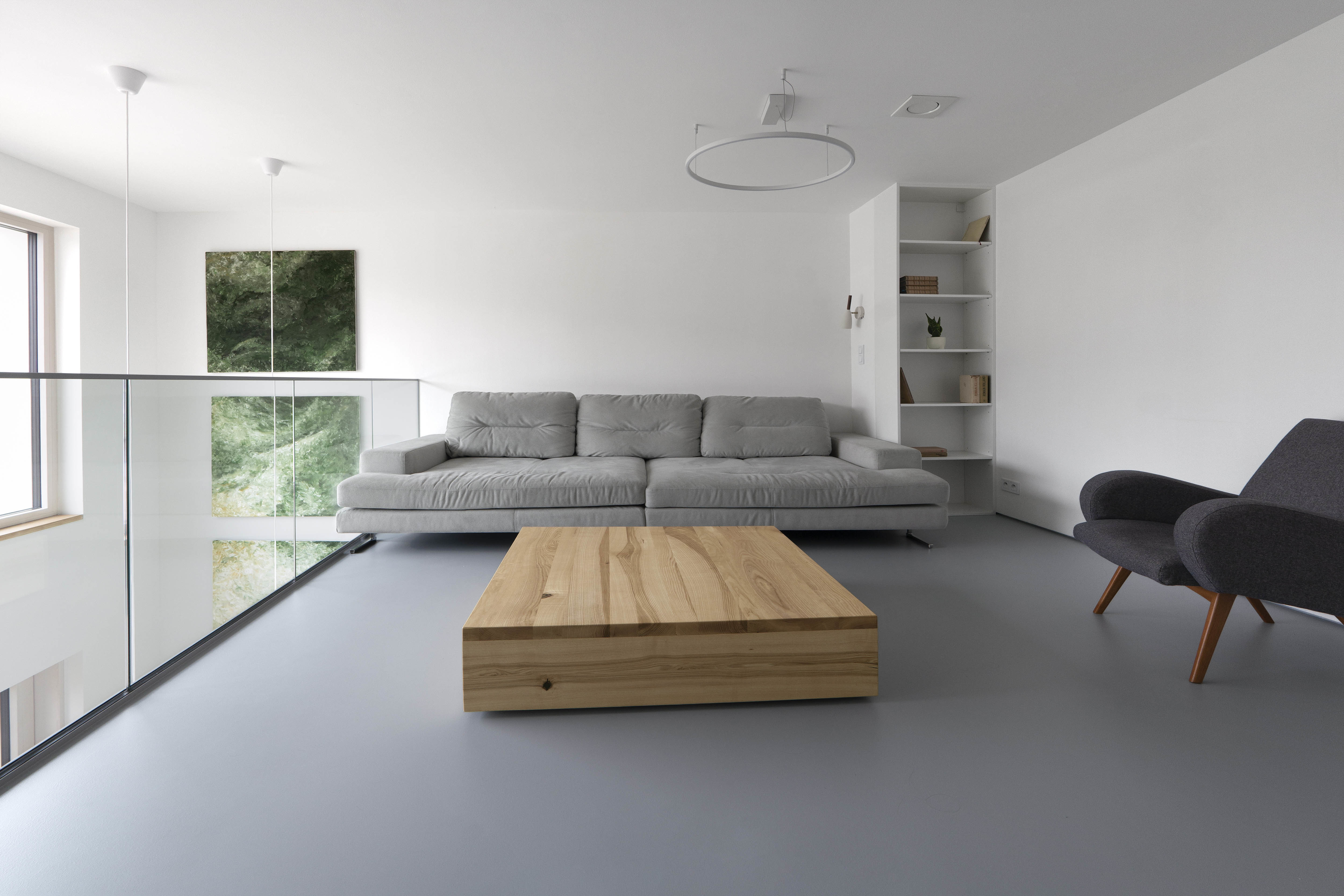 Podlahy jsou odhlučněny kročejovou izolací, na ní je teplovodné podlahové vytápění v betonu a finální vrstva je polyuretan.