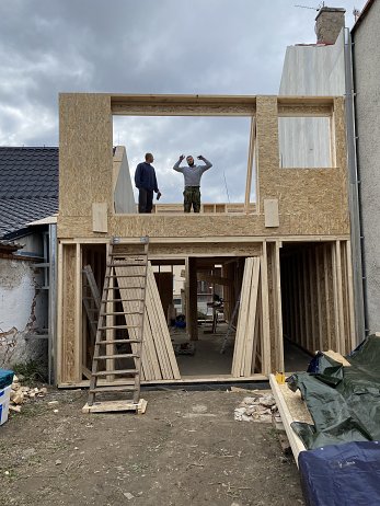 Atipicky se jedná o dřevostavbu v proluce. Nosný systém je sestaven z Palco nosníků a KVH řeziva. Konstrukce je difuzně uzavřená a byla zateplena PUR pěnou a z obou stran opláštěna OSB deskami. Zvenčí bylo přidáno fasádní zateplení a jemná točená fasádní omyvatelná omítka. Z vnitřní strany byla sestavena samostatná konstrukce z SDK profilů, ve které jsou vedeny instalace a která je vyplněna protihlukovou vatou a následně dvouplášť SDK a interiérová barva s hrubozrnnou strukturou.