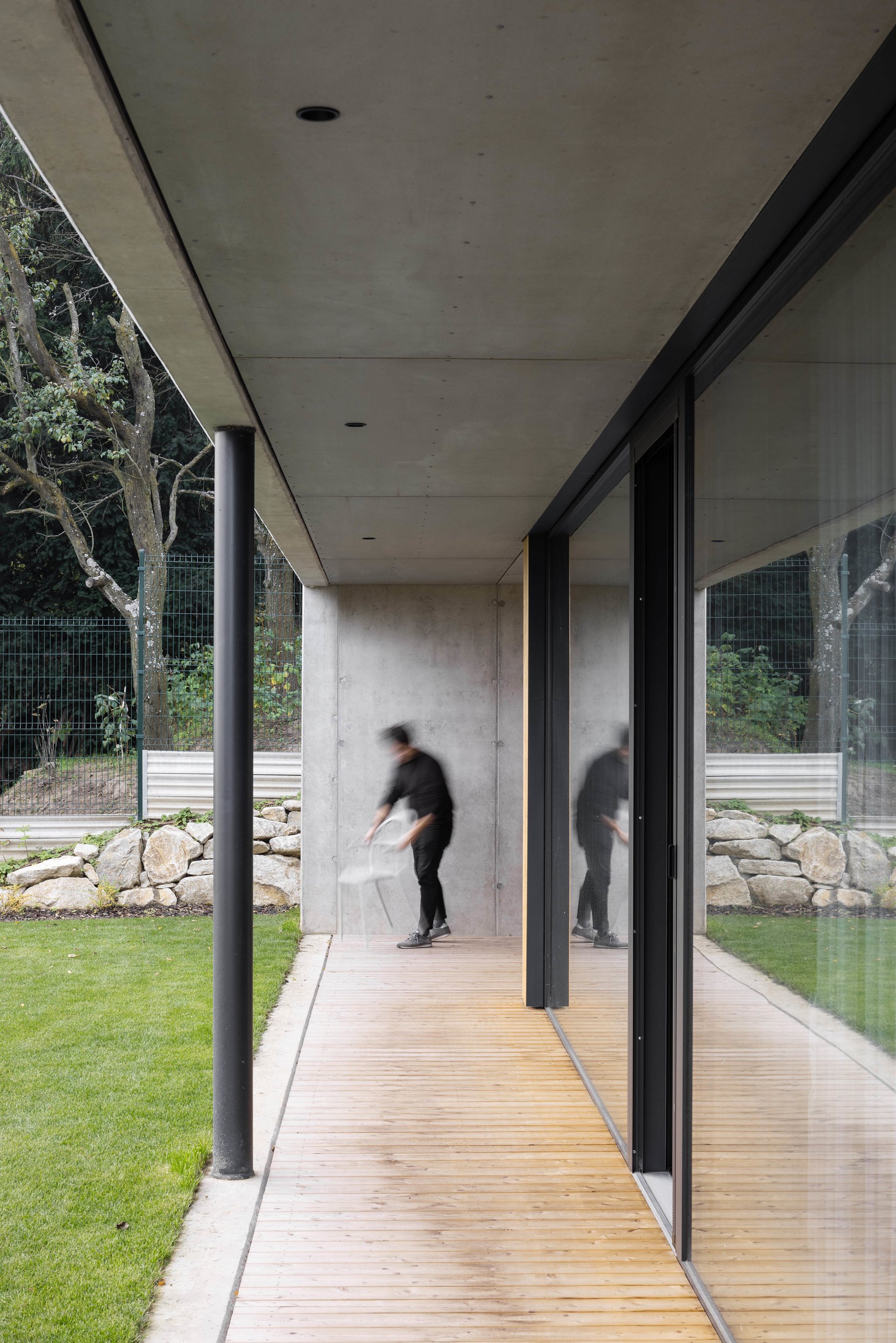 Konštrukčne je objekt riešený ako železobetónová základová vaňa, priečne uložená v teréne. V nej je osadený montovaný blok z CLT panelov. Asymetrické osadenie objektu v rámci vane vyčleňuje plochy terasy a carportu so skladom. Tieto plochy sú pozdĺžne prepojené ochodzou s prestrešením, ktoré rámujú celý objekt.
