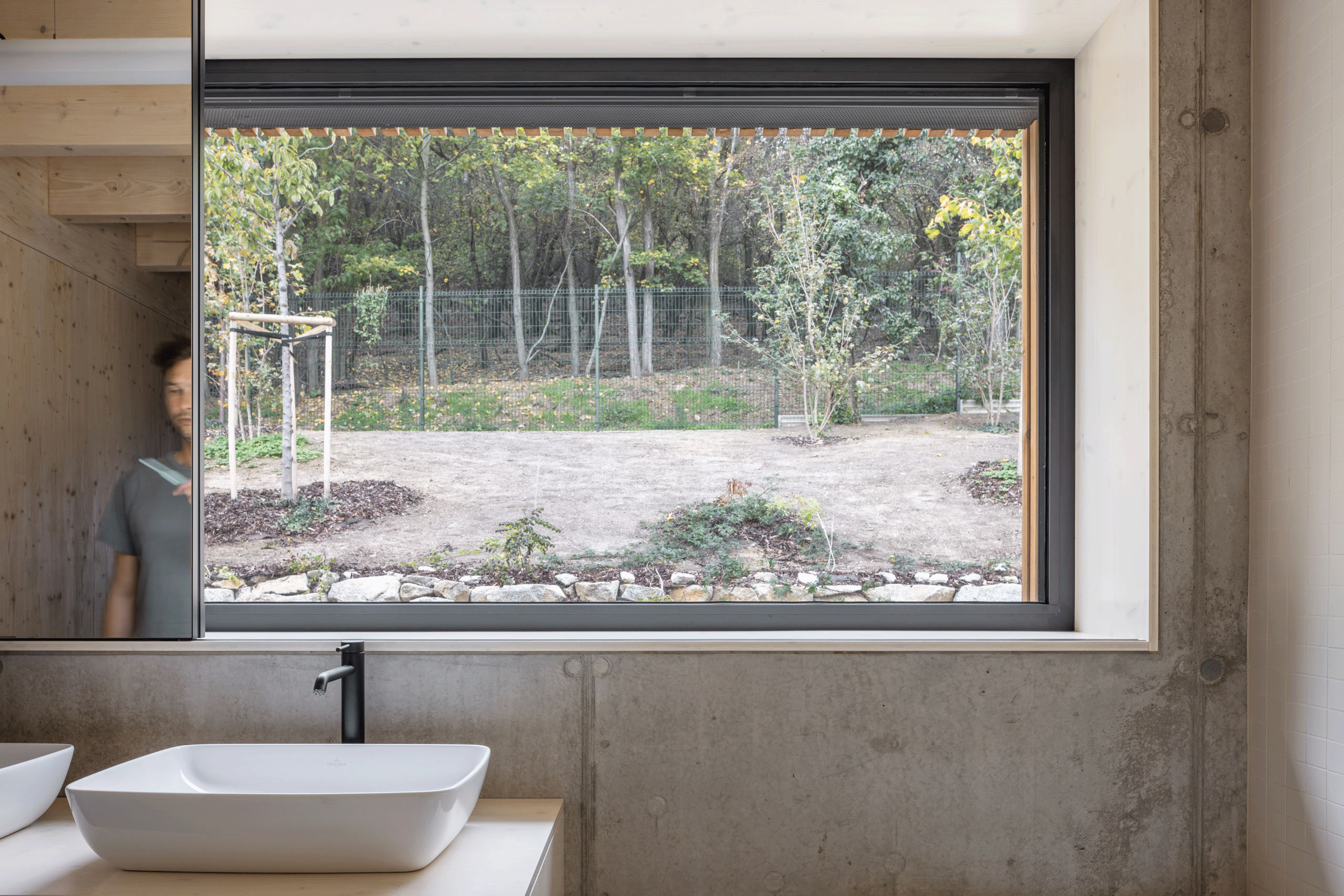 Hliníkové okná so skrytým krídlom sú z profilového systému heroal W72i, pre posuvné dvere bol zvolený heroal HST 77SL a pre vchodové dvere heroal D72, všetko v obojstrannej štruktúrovanej farbe 7021. Najväčšie izolačné sklo váži 520 kg a je vsadené vo fixnom krídle posuvného portálu. Všetky sklá sú bezpečnostné s Ug = 0,6 W/(m2K).
