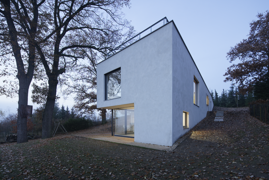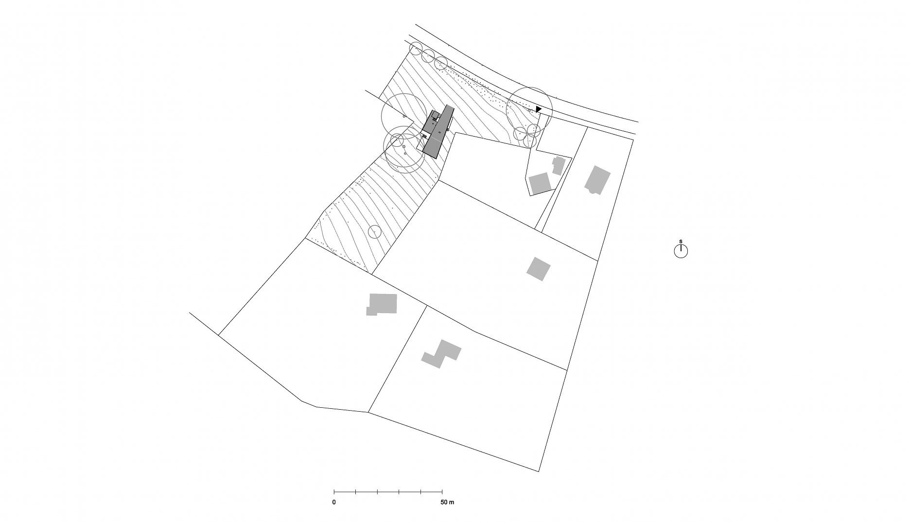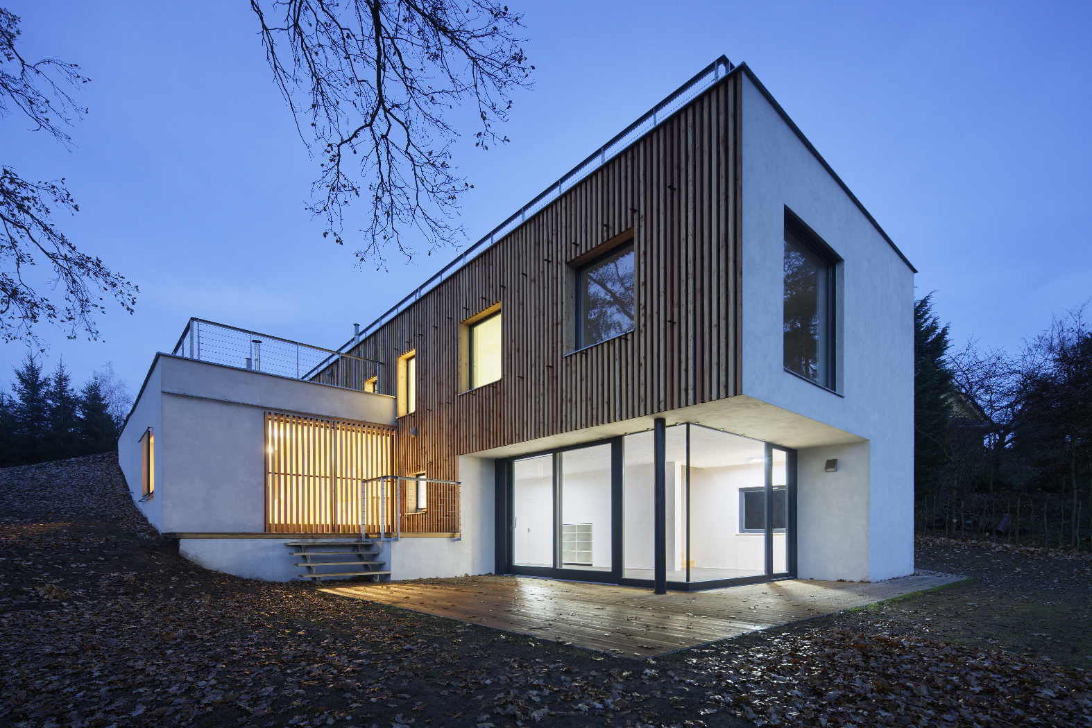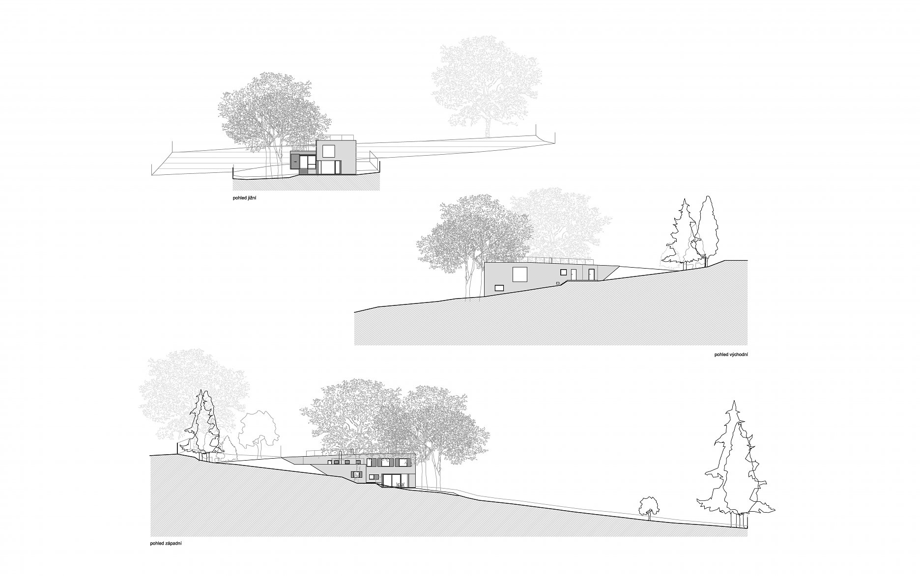 Umiestnenie domu vychádza z tvaru terénu a prístupu na pozemok zo severnej strany. Určujúcim prvkom sa stala aj poloha starých dubov. Návrh využíva kvality prostredia, ktoré stromy dotvárajú. Zvažujúci sa terén otvára výhľady na krajinu. Na južnej strane pozemku ostala zachovaná rozsiahla lúka.