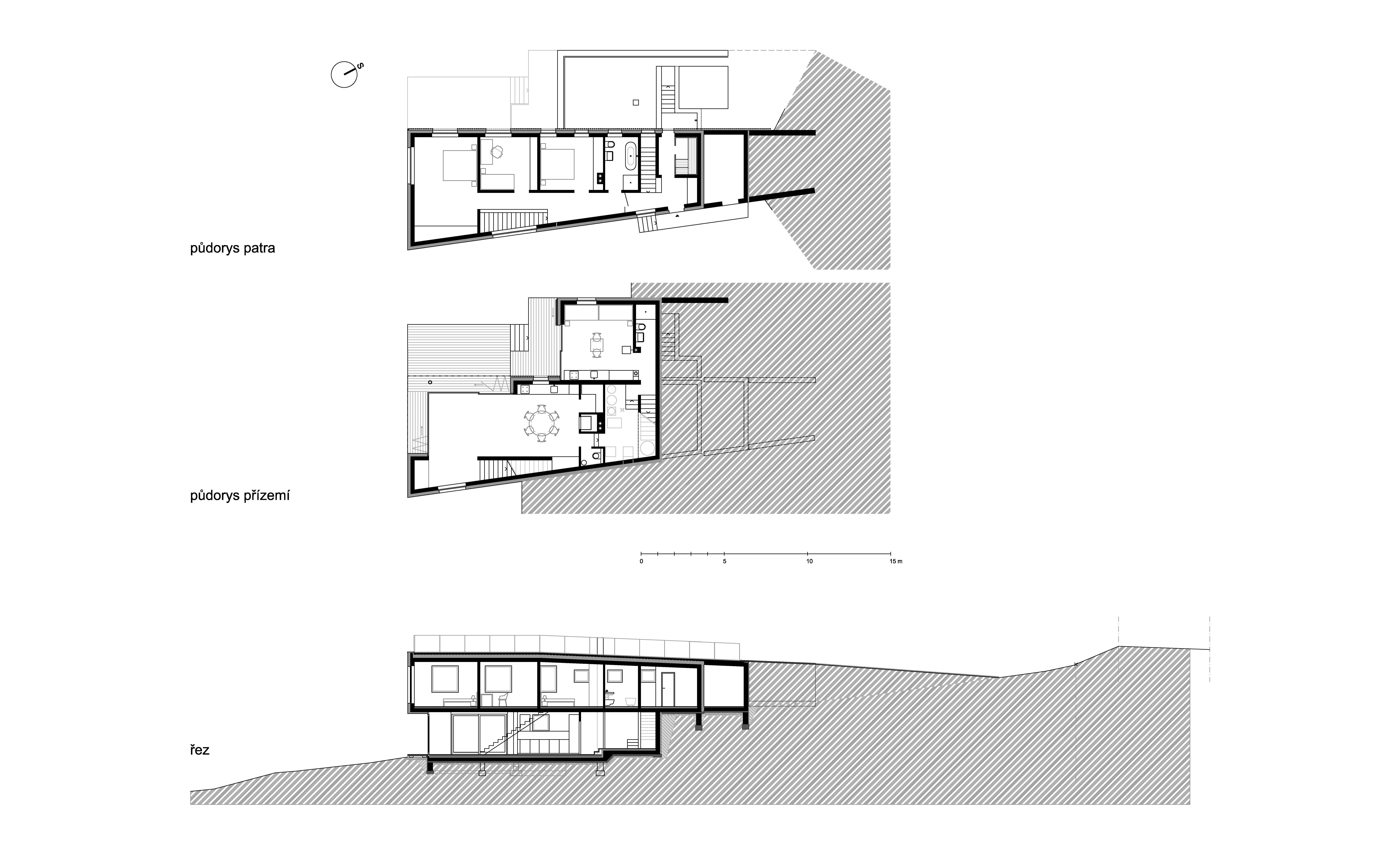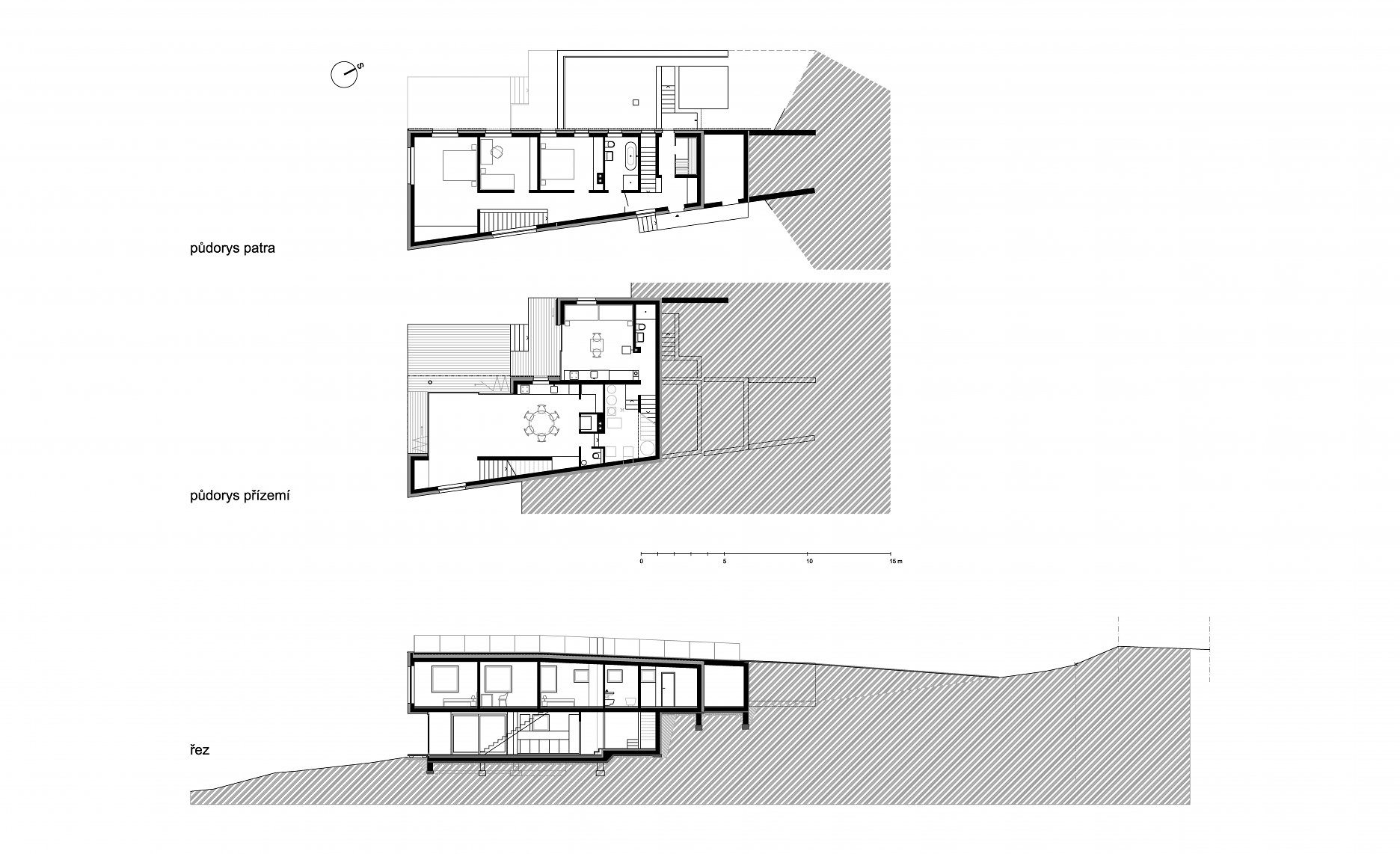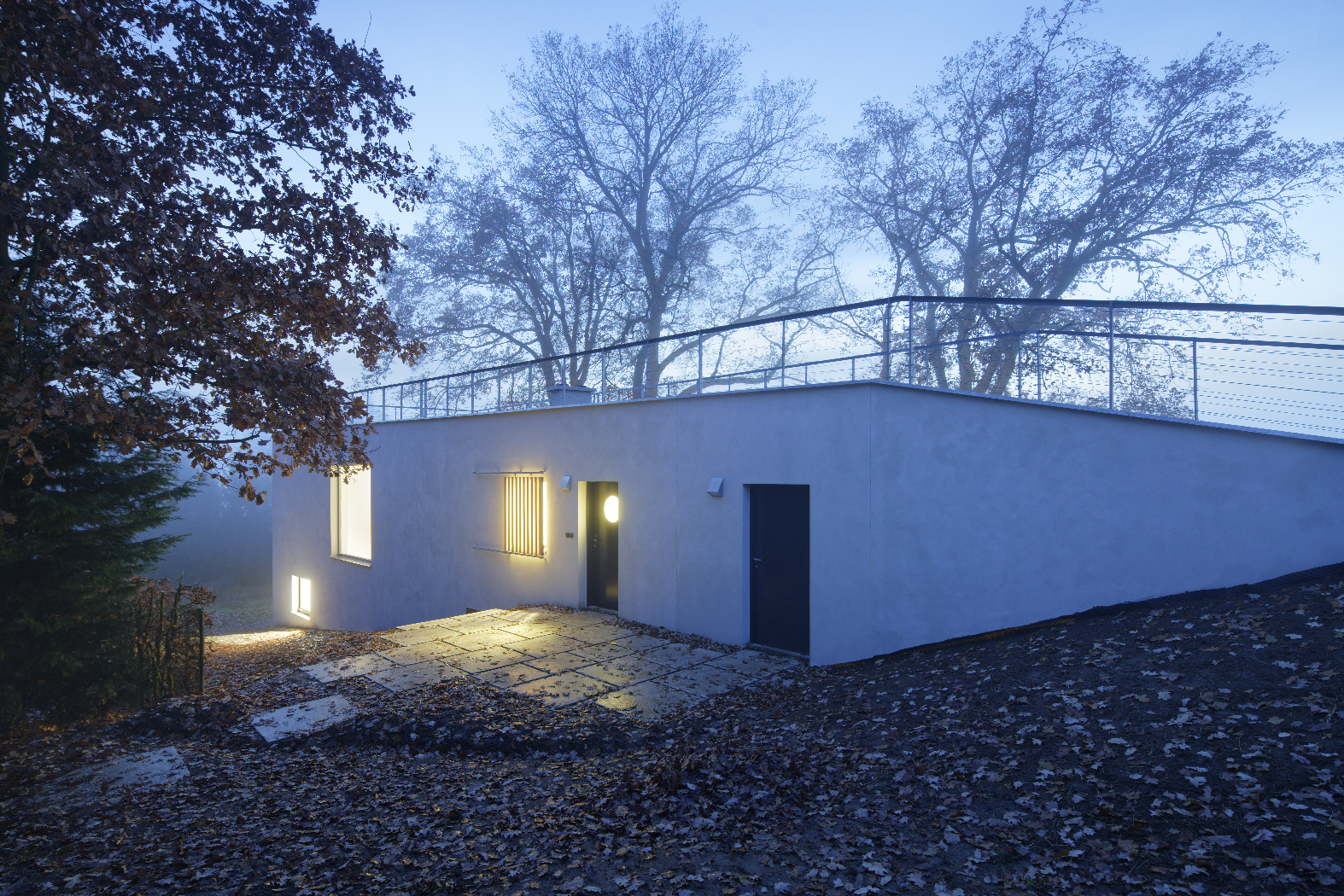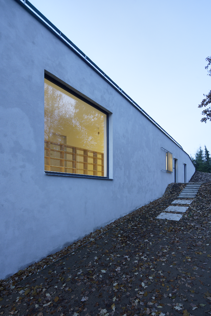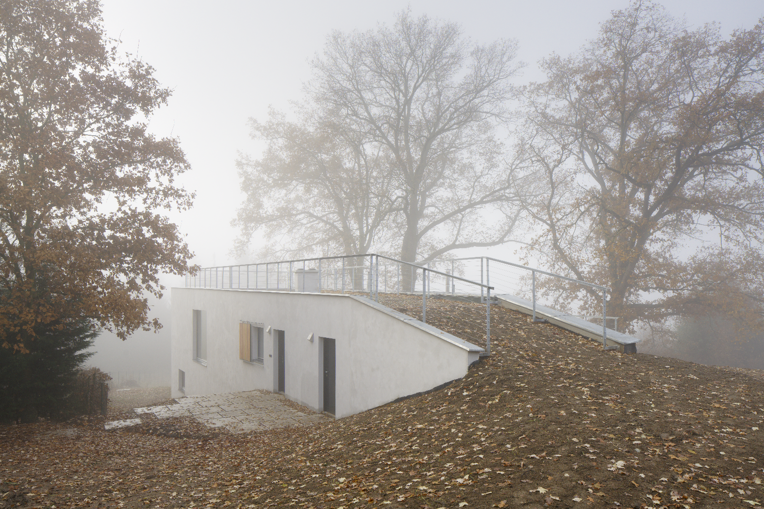 Objekt svojou výškou nepresahuje domy v susedstve. Strecha je prístupná z terénu. Z hornej hranice pozemku sú viditeľné iba zelené plochy strechy, ktoré plynulo nadväzujú na severný svah.