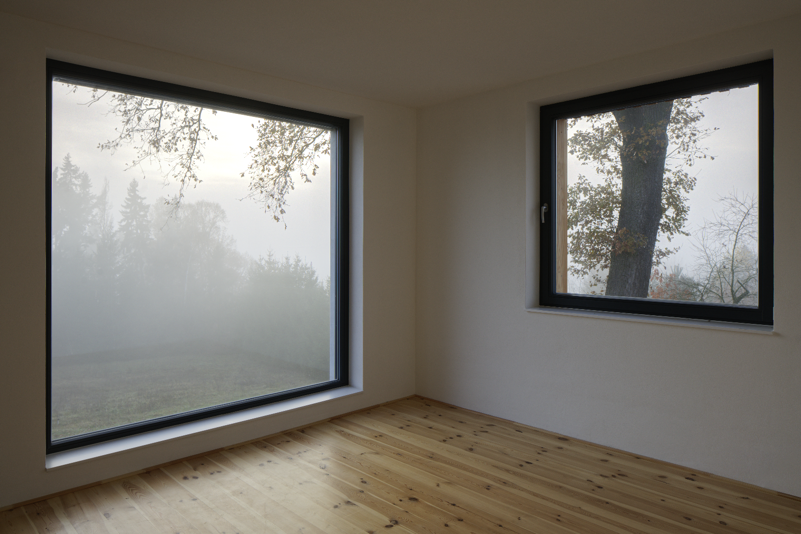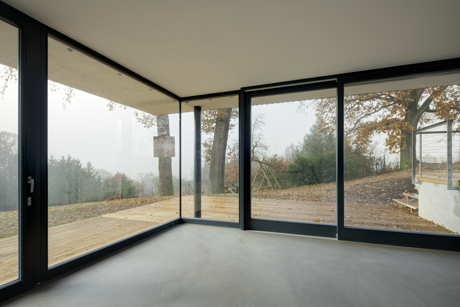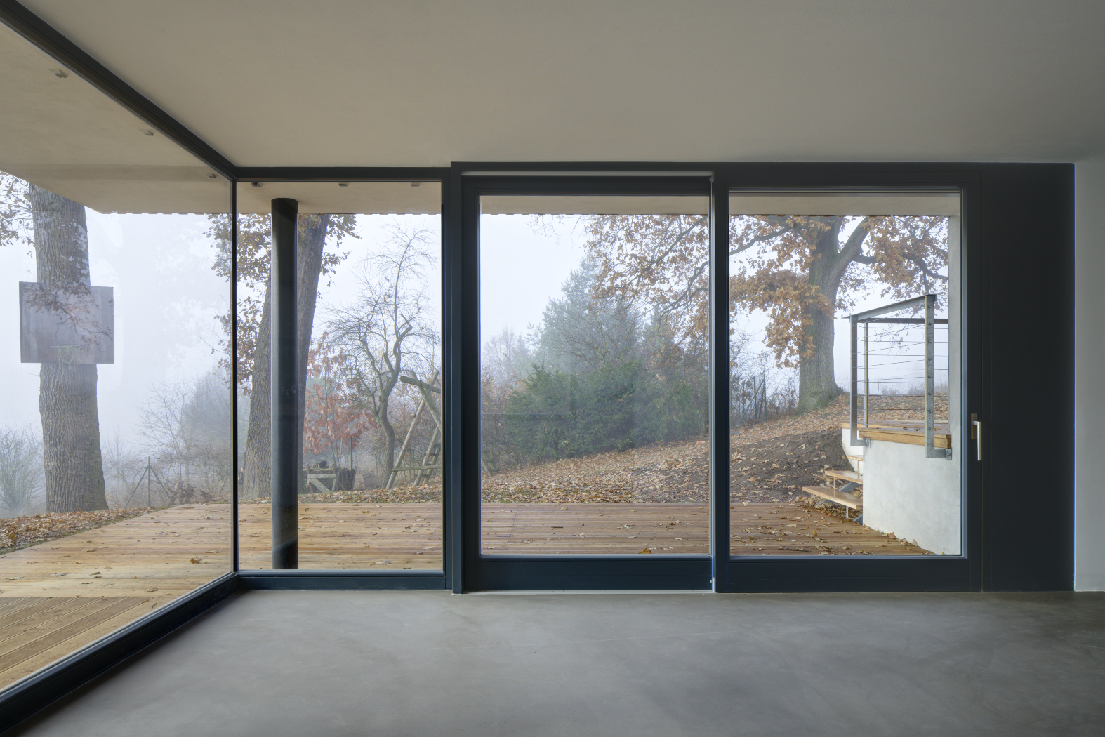 Presklené fasády opticky prepájajú vnútorné priestory s vonkajšími. Umožňujú široký výhľad do okolitej krajiny. Stromy prirodzene tienia terasy aj fasádu pred priamym juhozápadným slnkom. Zároveň zachovávajú intimitu miesta.