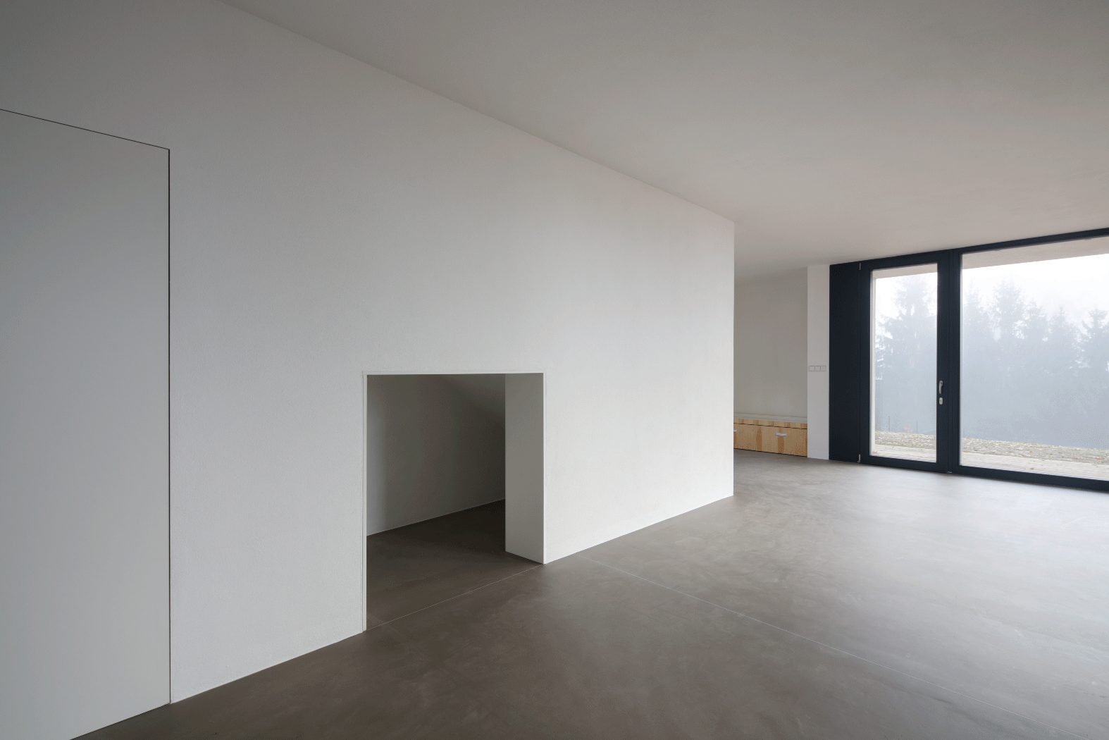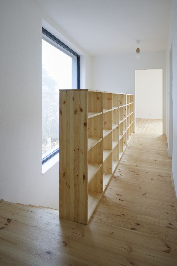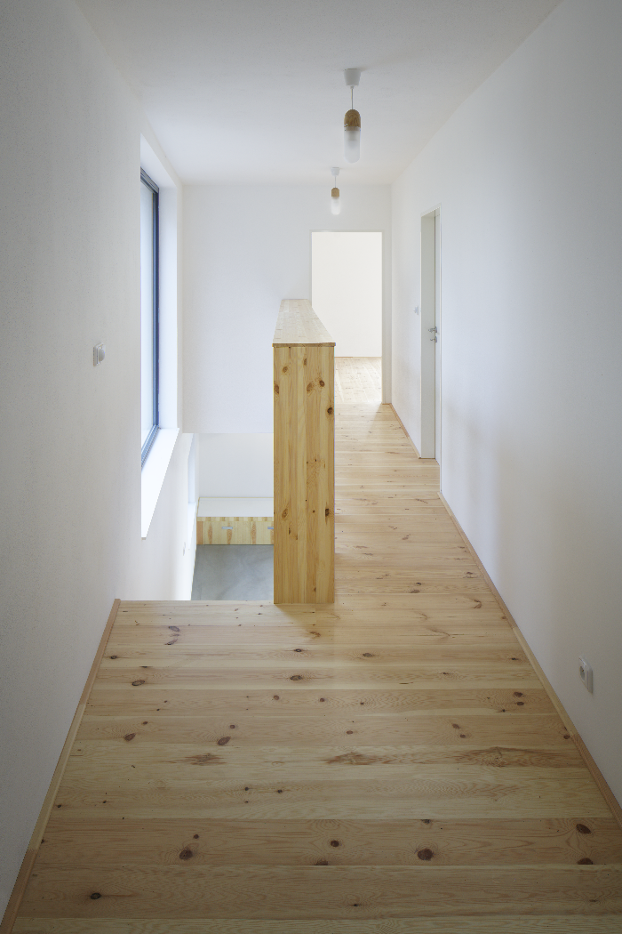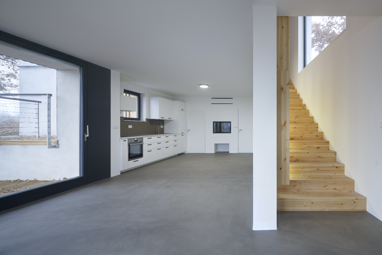Vo vstupnom podlaží sú tri spálne pre členov rodiny, spoločná kúpeľňa a sauna. Zo spálňového poschodia vedie schodisko na prízemie - do hlavnej obytnej miestnosti s kuchyňou a jedálňou. Veľkou presklenou plochou južnej a západnej fasády nadväzuje priestor na vonkajšiu terasu. V severnej časti prízemia sú prevádzkové priestory (špajza, wc a technická miestnosť)