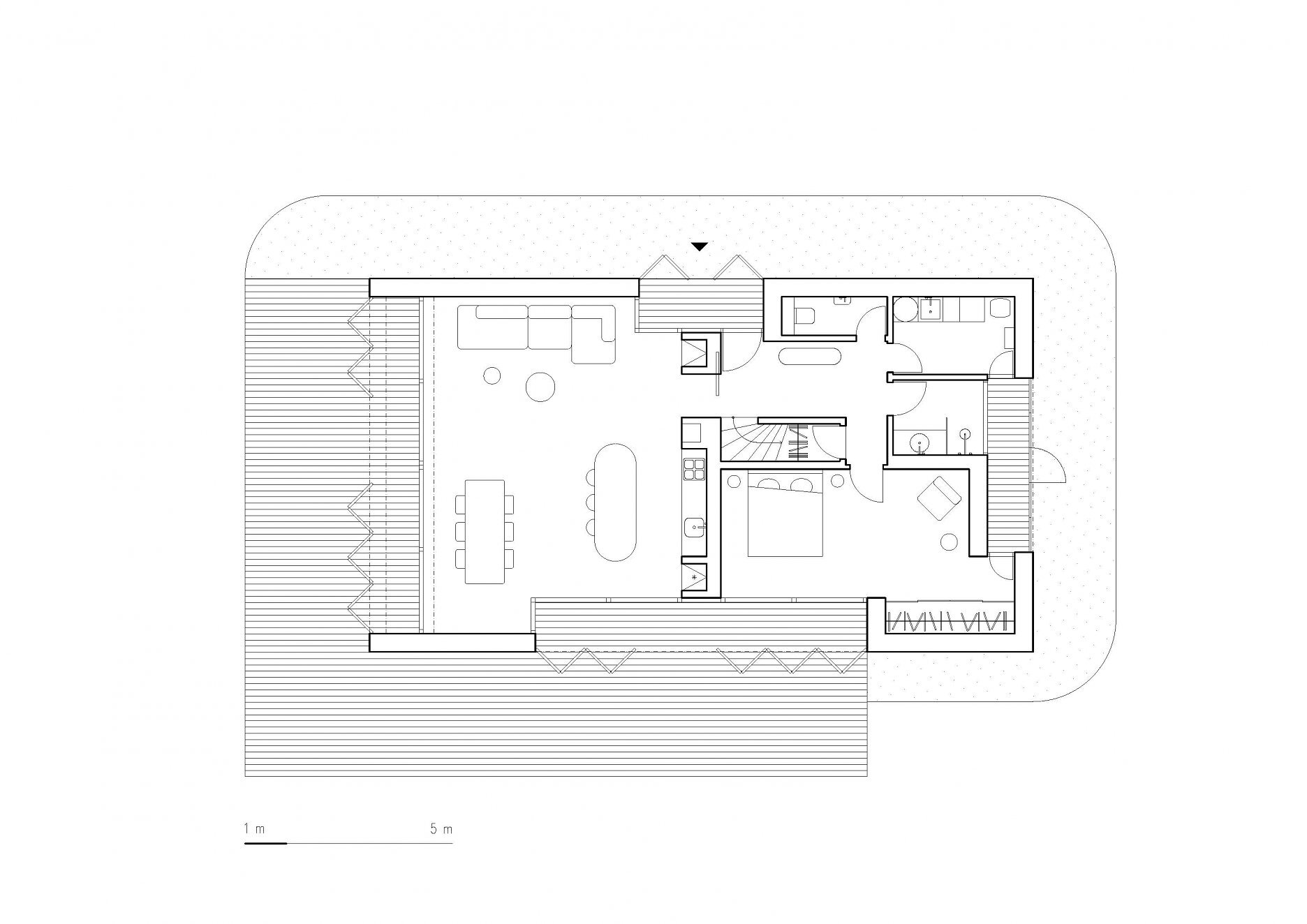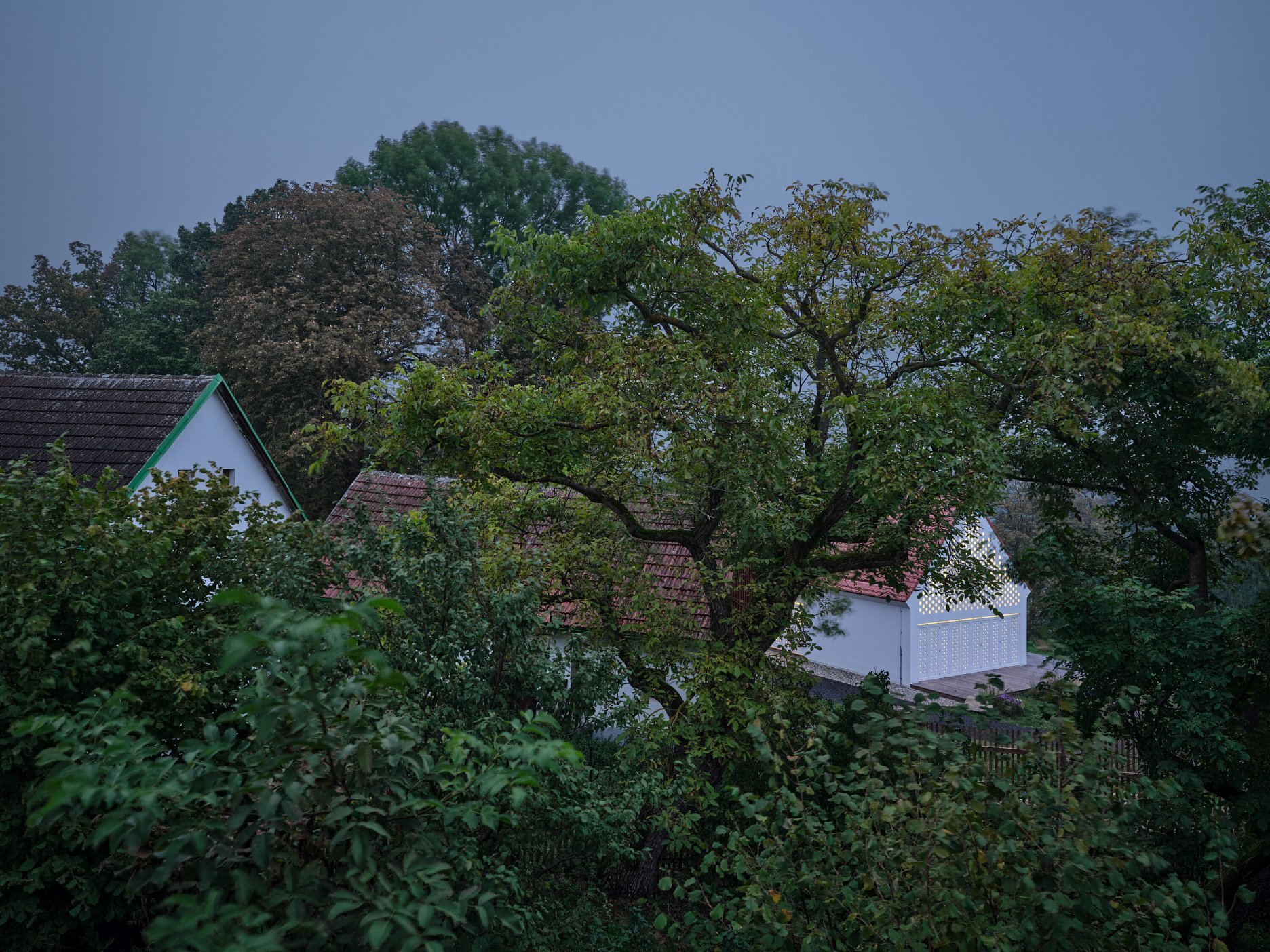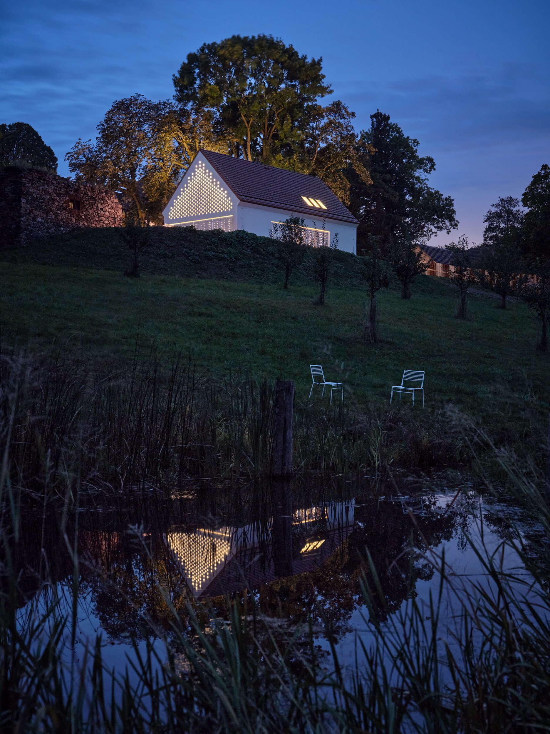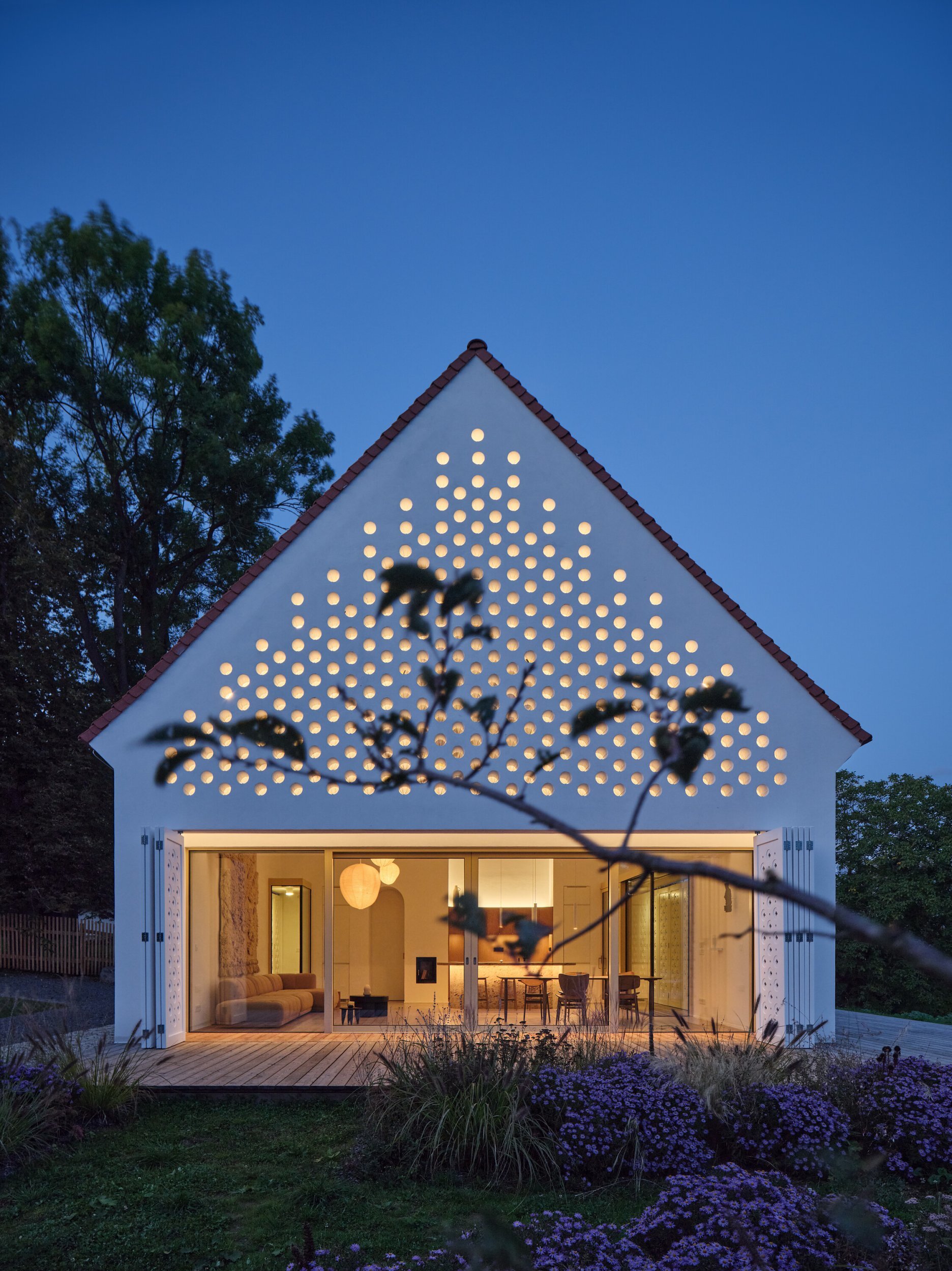 Návrh rešpektuje miestny archetyp lineárneho domu so sedlovou strechou. Perforované murivo ktoré možno nájsť v okolitých historických stavbách je pri tom hlavným výrazovým prostriedkom. Slúži ako slnolam v južnej štítovej stene aj ako vzor drevených tieniacich panelov na ostatných fasádach. Kompaktné fasády na každej strane prerušujú niky, parafrázujúce barokové tvaroslovie. Zapustené časti vytvárajú vstupné zádverie a pobytové lodžie s možnosťou tienenia. Dom sa môže podľa potreby otvoriť do krajiny, alebo uzavrieť pre chvíle súkromia a sústredenia.