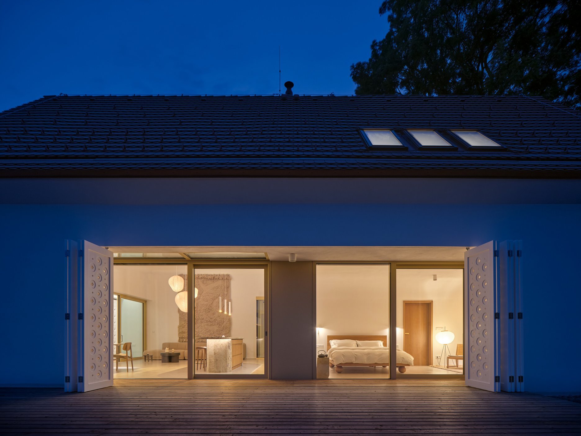 Život v dome je prepojený s prírodnými cyklami. Zo spálne a hlavného spoločenského priestoru, odkiaľ sa otvára panoramatický výhľad do ovocnej záhrady, je možné pozorovať východy slnka a mesiaca. Južná fasáda s perforovaným štítovým murivom a kruhovým oknom sprostredkúva kontakt spoločenského priestoru s dvorom a ruinou stodoly. Posuvné presklené plochy prepájajú bývanie s exteriérom – drevenými terasami, vegetáciou a chladivými historickými múrmi.