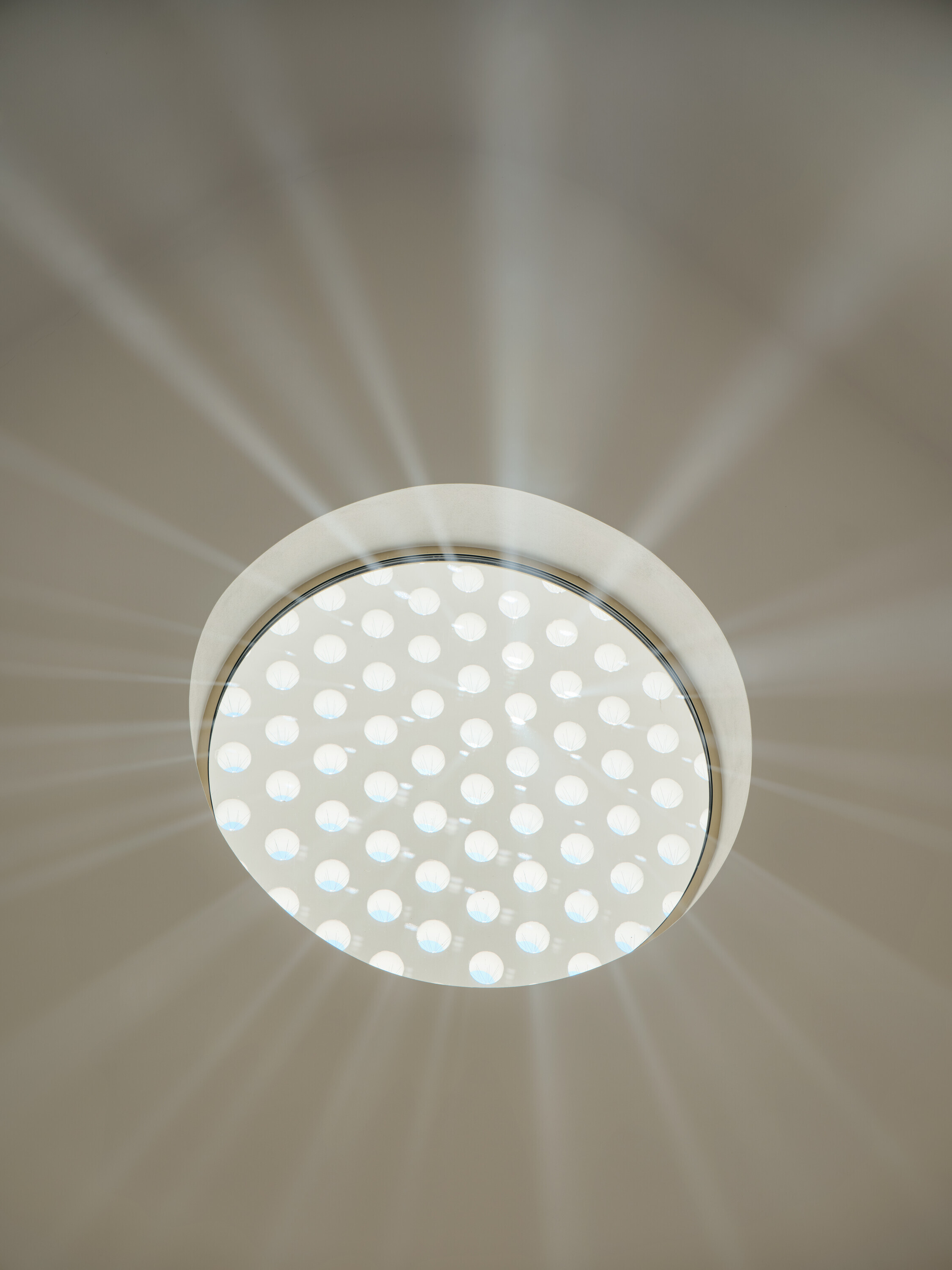 Prestup slnečného svetla do interiéru je možné počas dňa regulovať prostredníctvom bielych tieniacich panelov. Izba zaliata priamym slnečným svetlom sa tak behom chvíle môže zmeniť na uzavretý priestor.