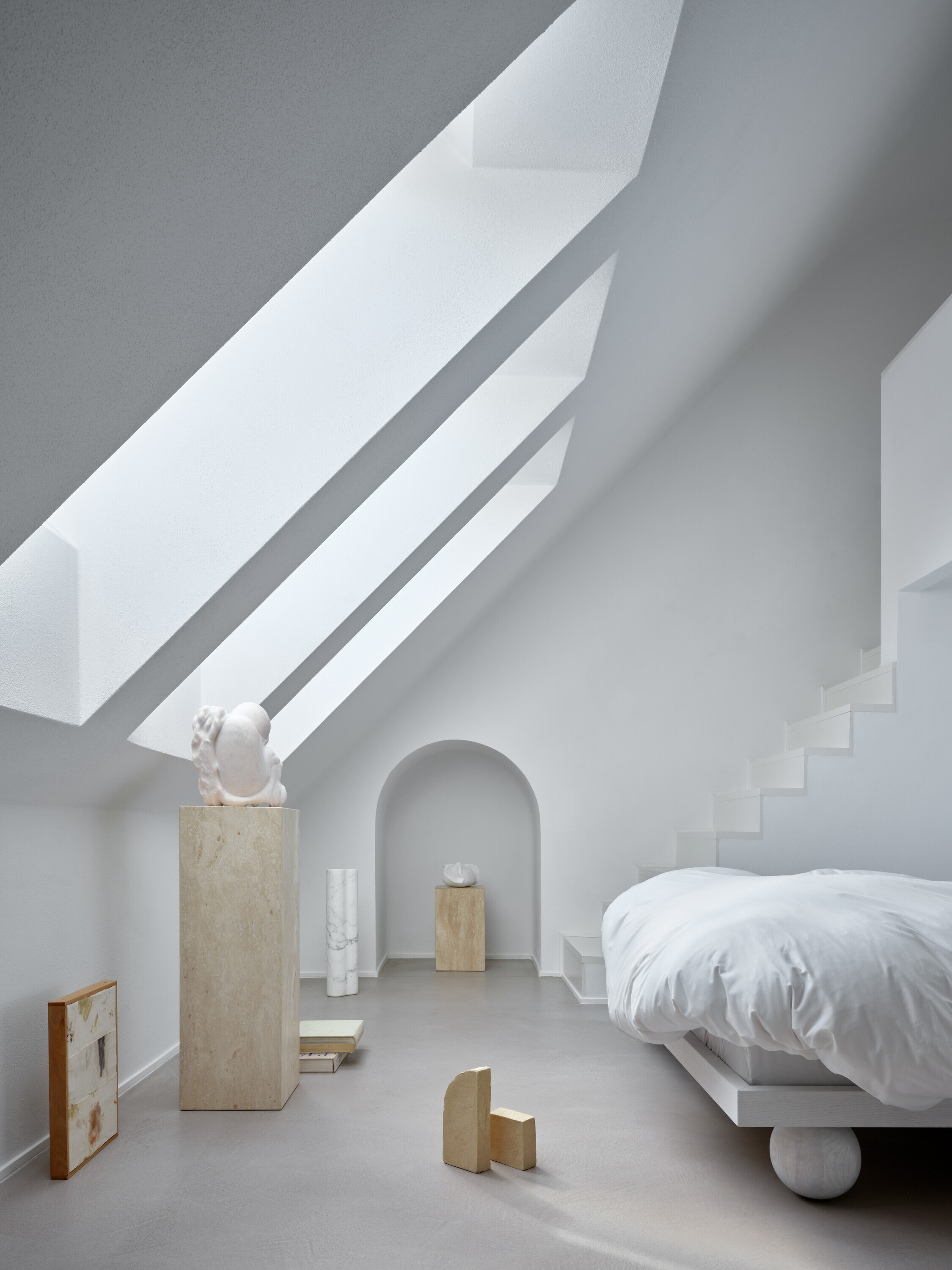 Dôležitou súčasťou diela je všadeprítomné umenie, ktoré zohráva v živote rodiny kľúčovú úlohu. Ich zbierka obsahuje diela od českej moderny po súčasnú tvorbu. Spálňu zdobí japonské panneau z 19. storočia, veľkoformátový obraz Antonie Stanovej a sochárske objekty Michala Janigu. V podkroví sa na travertínových podstavcoch vynímajú kamenné sochy Vandy Hvízdalovej. Kurátorský výber majiteľov je viditeľný v každom detaile.