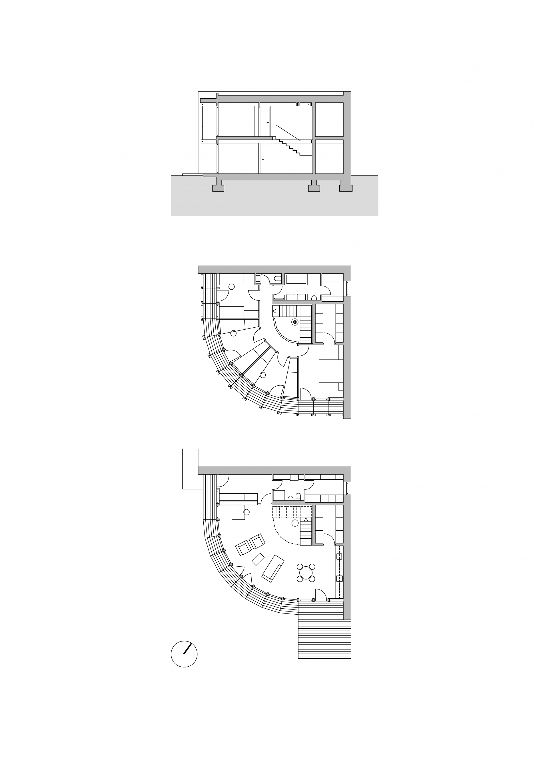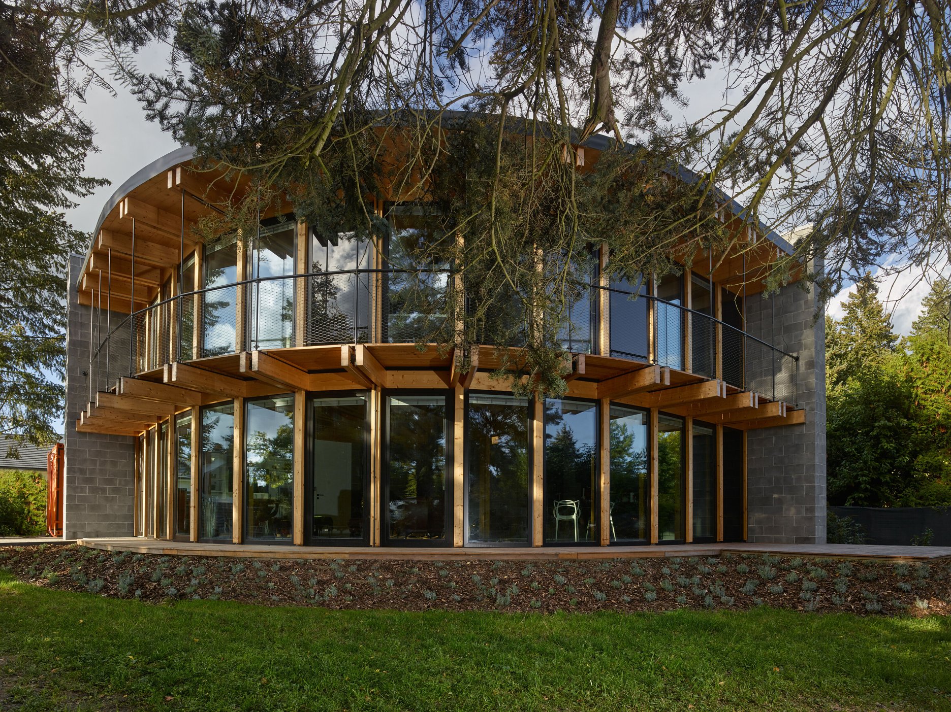 Južná časť českej obce Malé Kyšice, na okraji lesov CHKO Křivoklátsko, bola pôvodne zastavaná rekreačnými objektmi. Jednu z chát na rovinatom pozemku nahradila novostavba pasívneho domu. Pôdorys sa blíži tvaru štvrťkruhu, vymedzeného múrmi z pohľadových betónových tvárnic. Pre zaoblenú časť domu, ktorá sa otvára do záhrady, zvolili autori ako hlavný konštrukčný materiál drevo. Presklenú fasádu tienia presahujúce kryté ochodze a exteriérové žalúzie. Kontrast betónových a drevených konštrukcií sa uplatňuje aj v interiéri. Prízemie využíva obývacia izba s kuchyňou a jedálňou, otvorené schodisko vedie na poschodie so štyrmi spálňami. Pozdĺž betónových stien sú situované kúpeľne a ďalšie technické a skladovacie priestory.