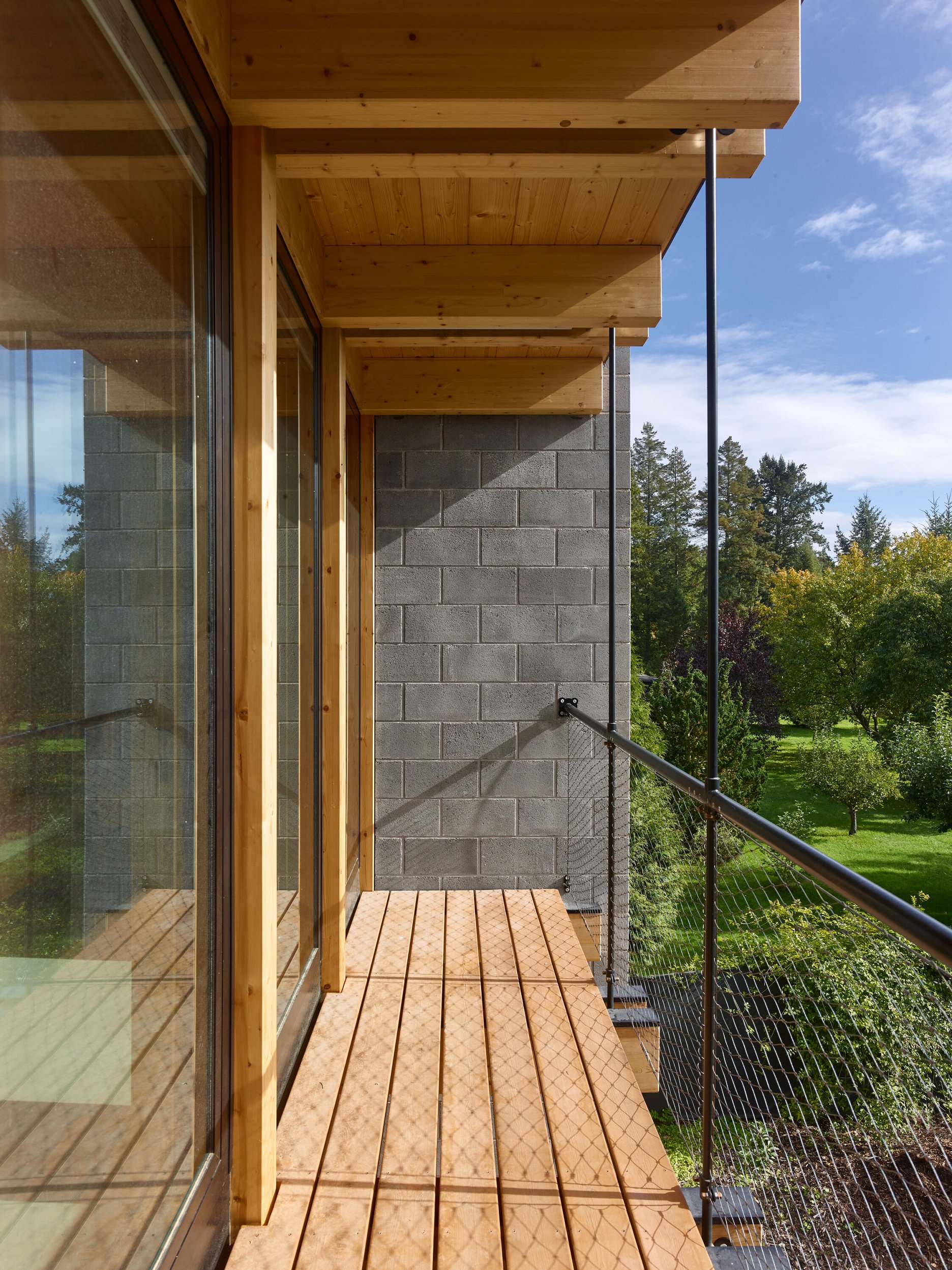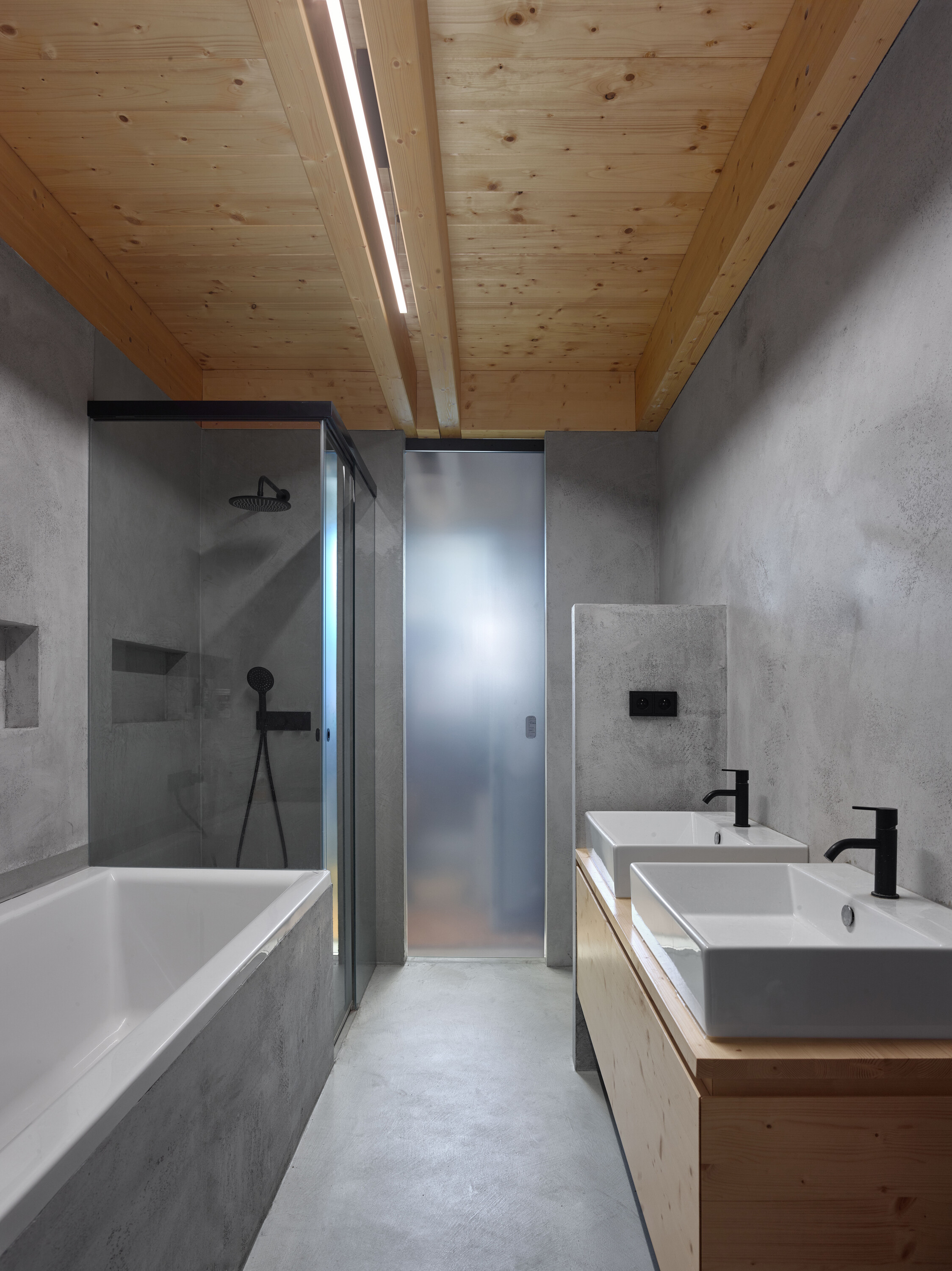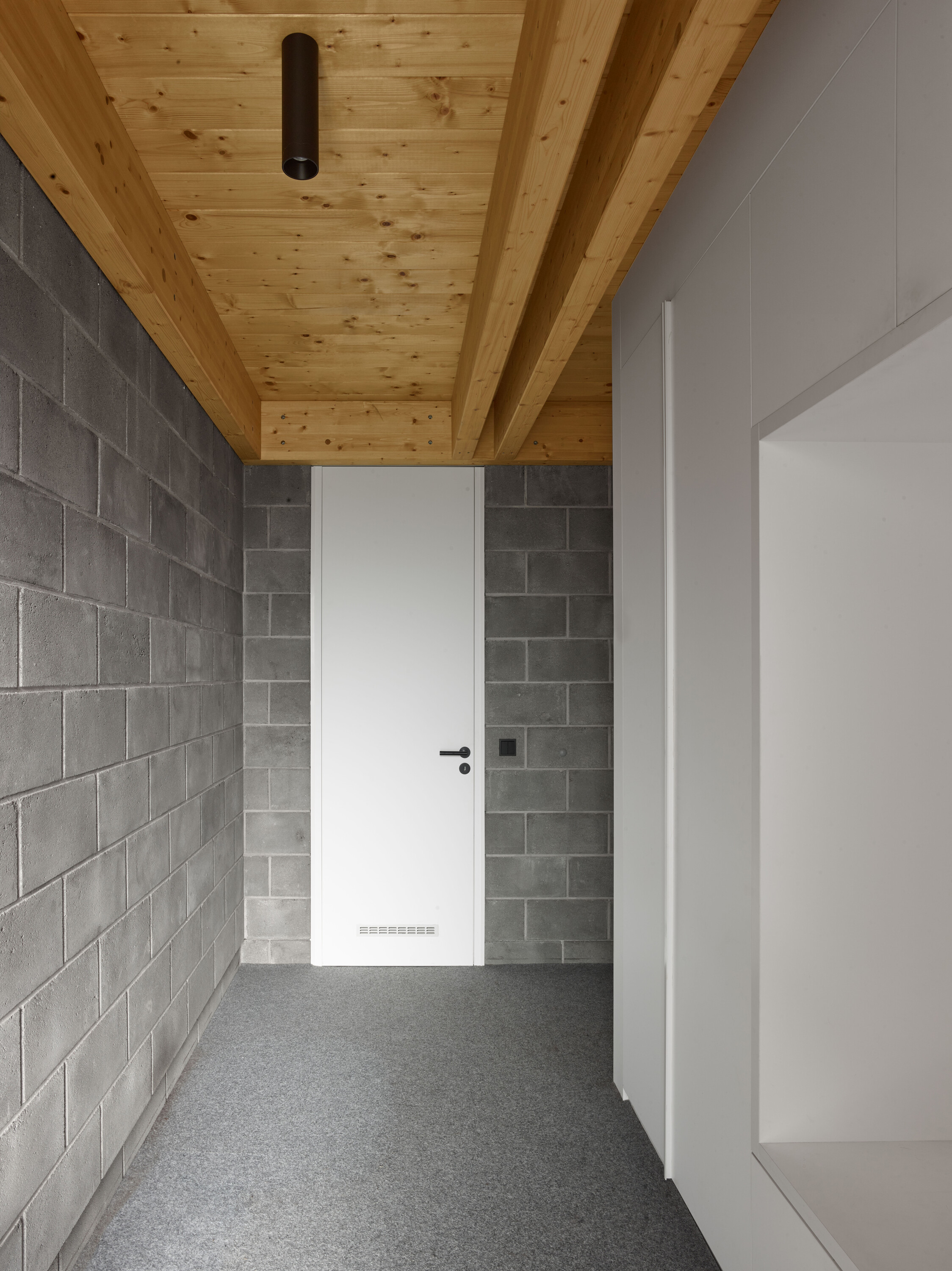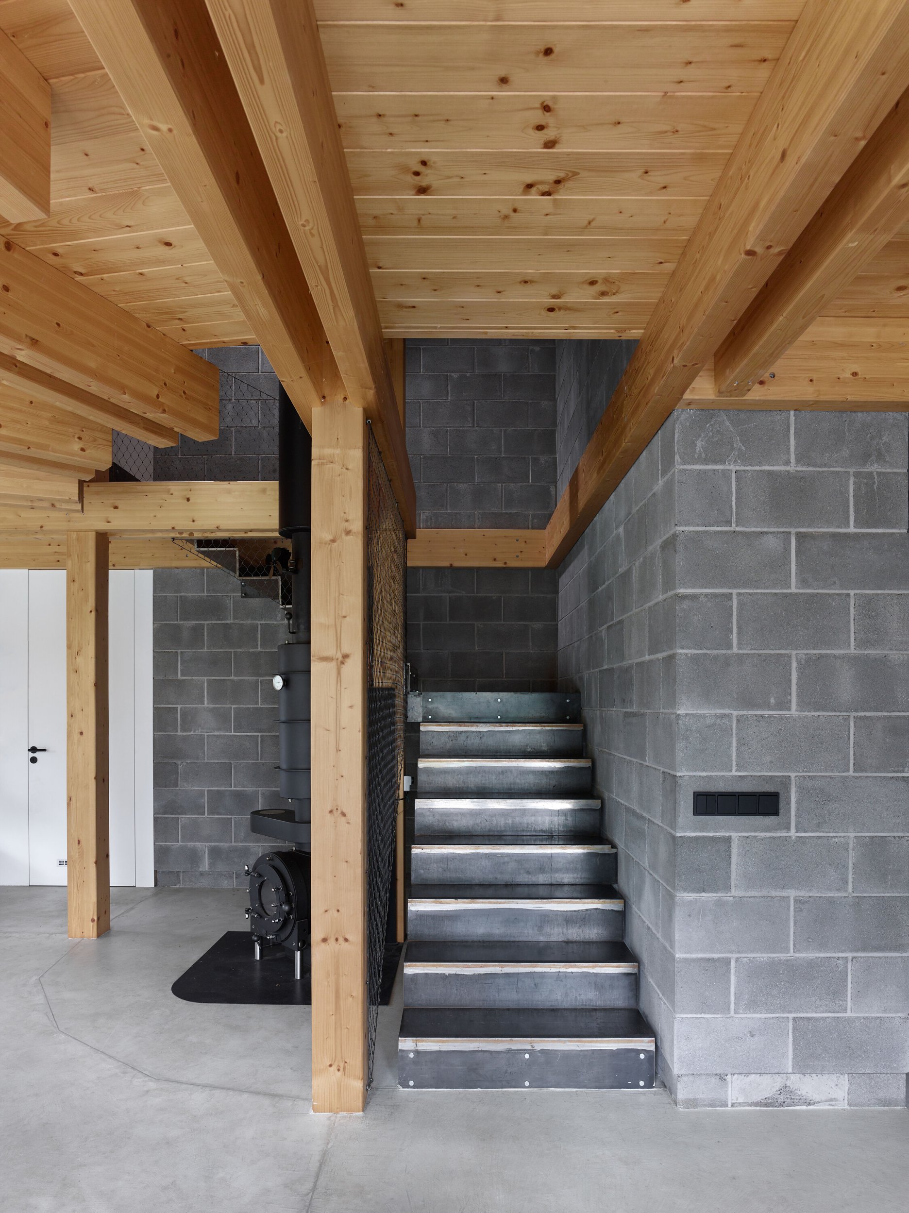 Pro udržitelný přístup je ale důležité dbát i na trvanlivost a životnost. Proto z návětrných stran chrání dům stěny s betonových tvárnic. Sendvičová stěna s tepelnou izolací pomáhá i přirozené akumulaci tepla a tím i stabilitě domu. Veškeré technické zázemí a koupelny jsou soustředěny právě u těchto pevných a stabilních stěn a tvoří jakousi vyrovnávací zónu mezi jižní a severní stranou.