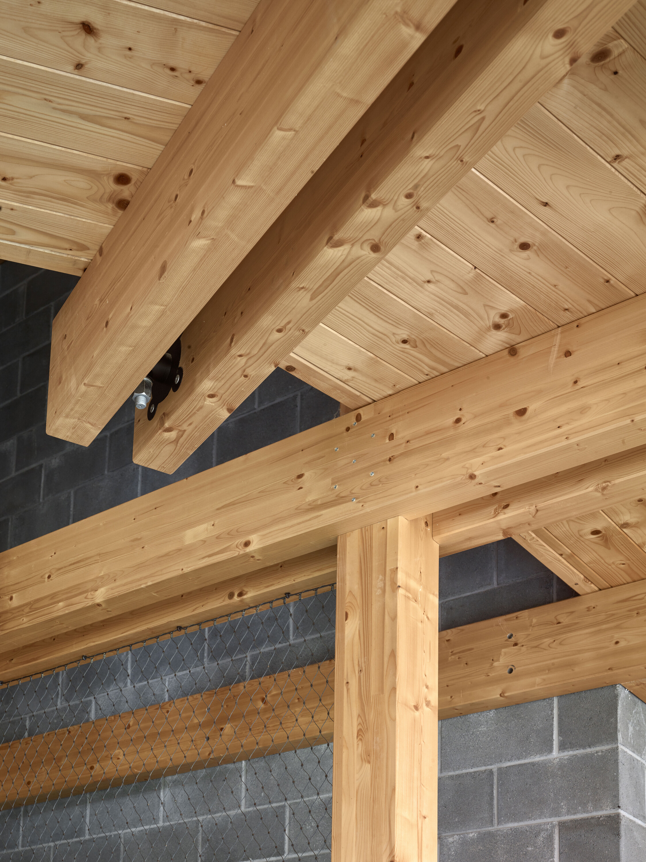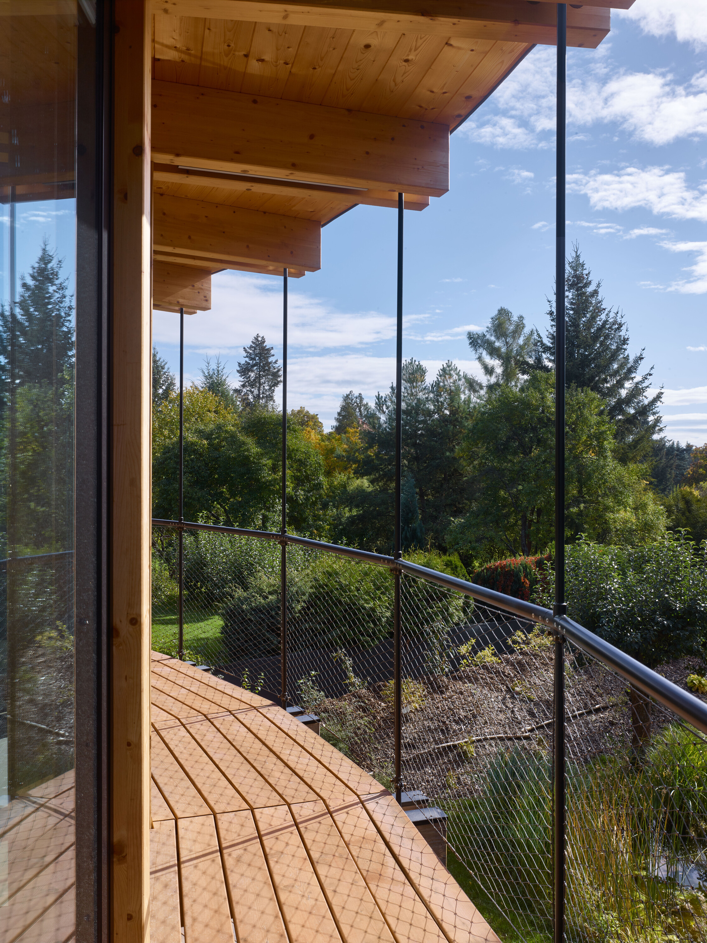 Hlavní konstrukce stavby je z obnovitelného materiálu – dřeva. Trámová konstrukce respektuje tvar domu a odhaluje konstrukční principy doslova do posledního detailu, včetně ocelových spojů a táhel, která dotvářejí charakter interiéru i exteriéru. Mezi trámy je pak vestavěn nábytek tak, že jednotlivé pokoje evokují kajuty.