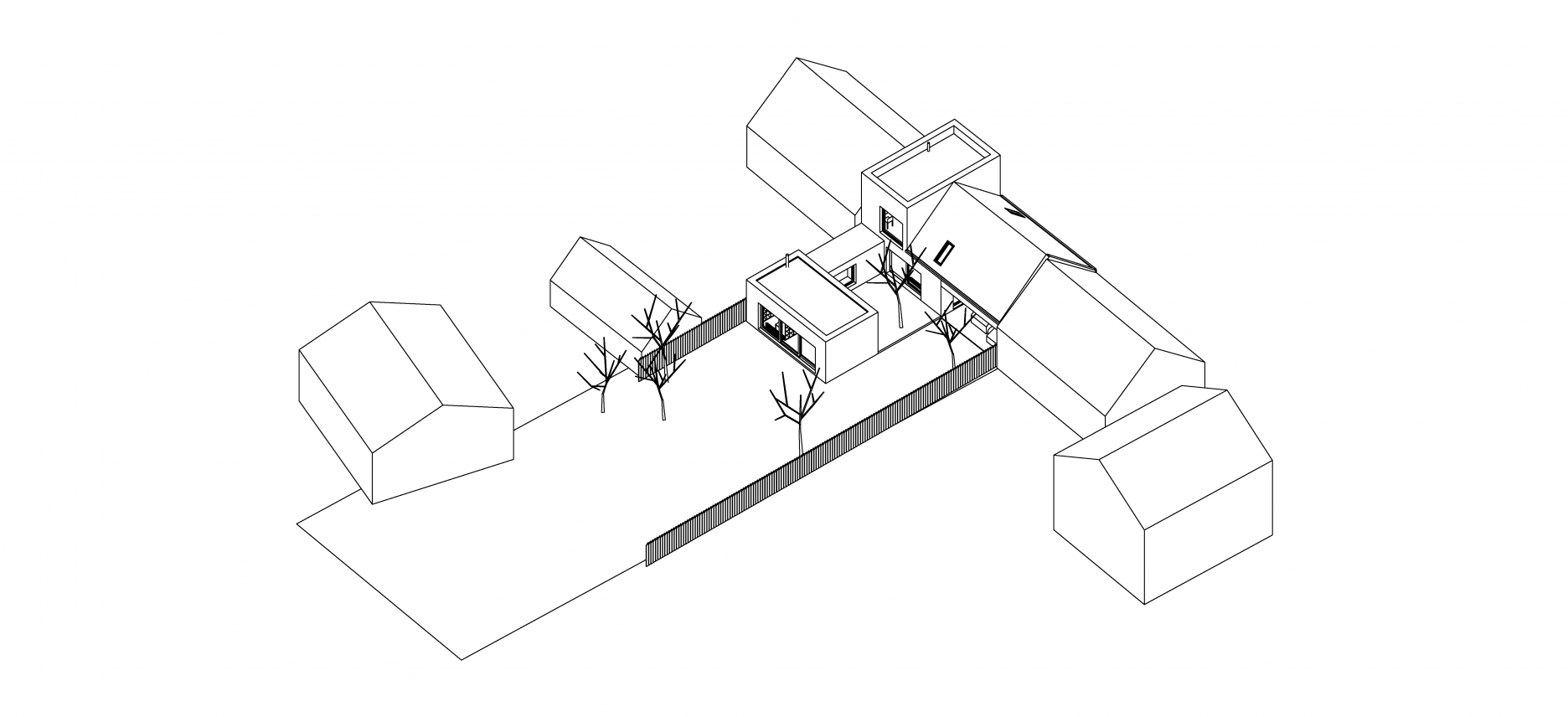 Pôvodný dom bol v zlom technickom stave. Novostavba kopíruje kvality starého - dom s podjazdom a s výškou okolia. Otázna bola orientácia voči slnku. Južná fasáda na ulici nedávala veľa možností. V podkroví vzniká „vikier“ s oknom k slnku a na ulicu. Vysunutie obývačky s pracovňou na sever pridalo južné okno. Vytvorilo sa intímne átrium, výhľad do záhrady a späť je viacvrstvový.