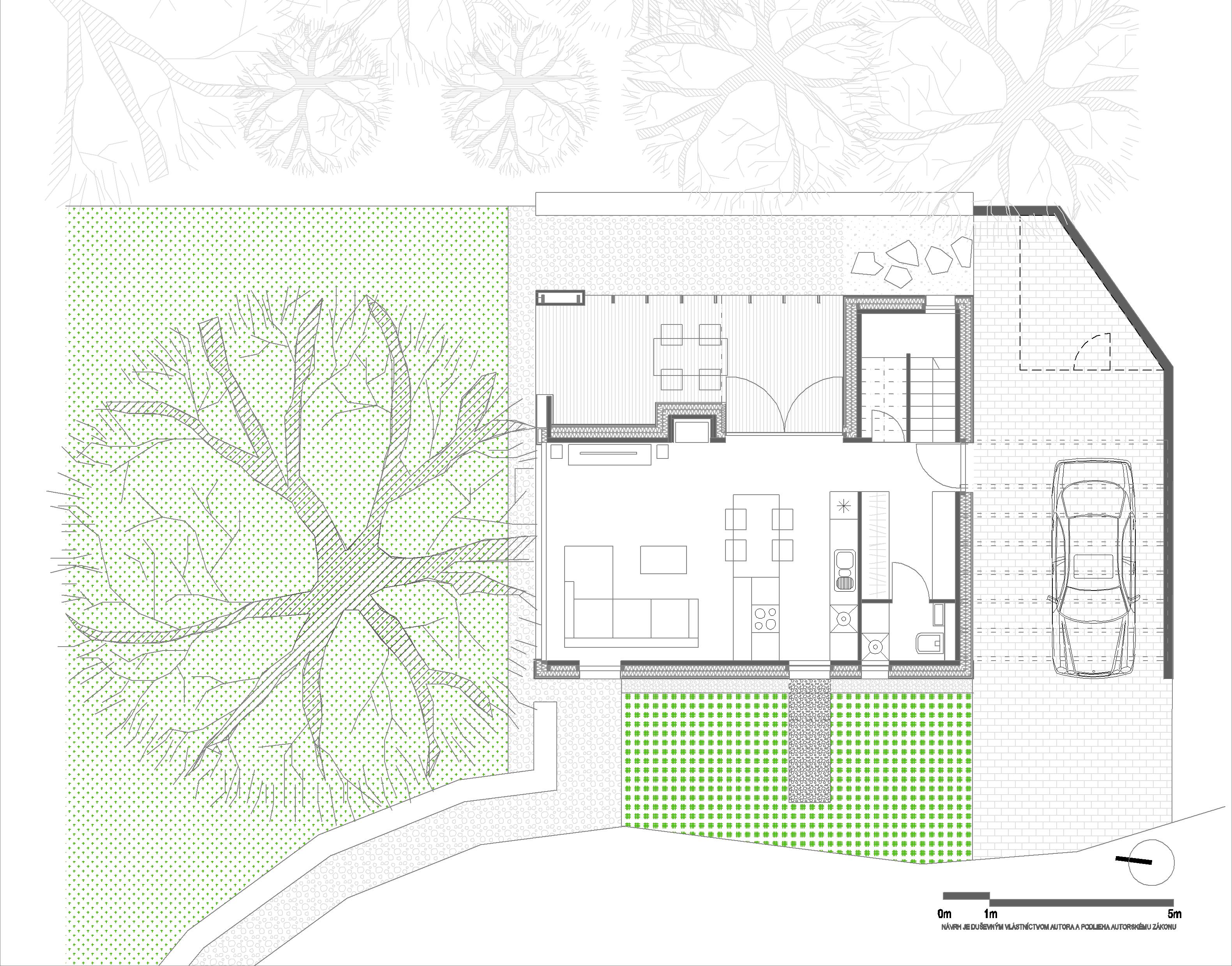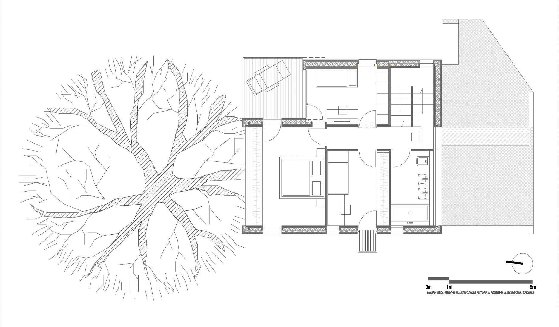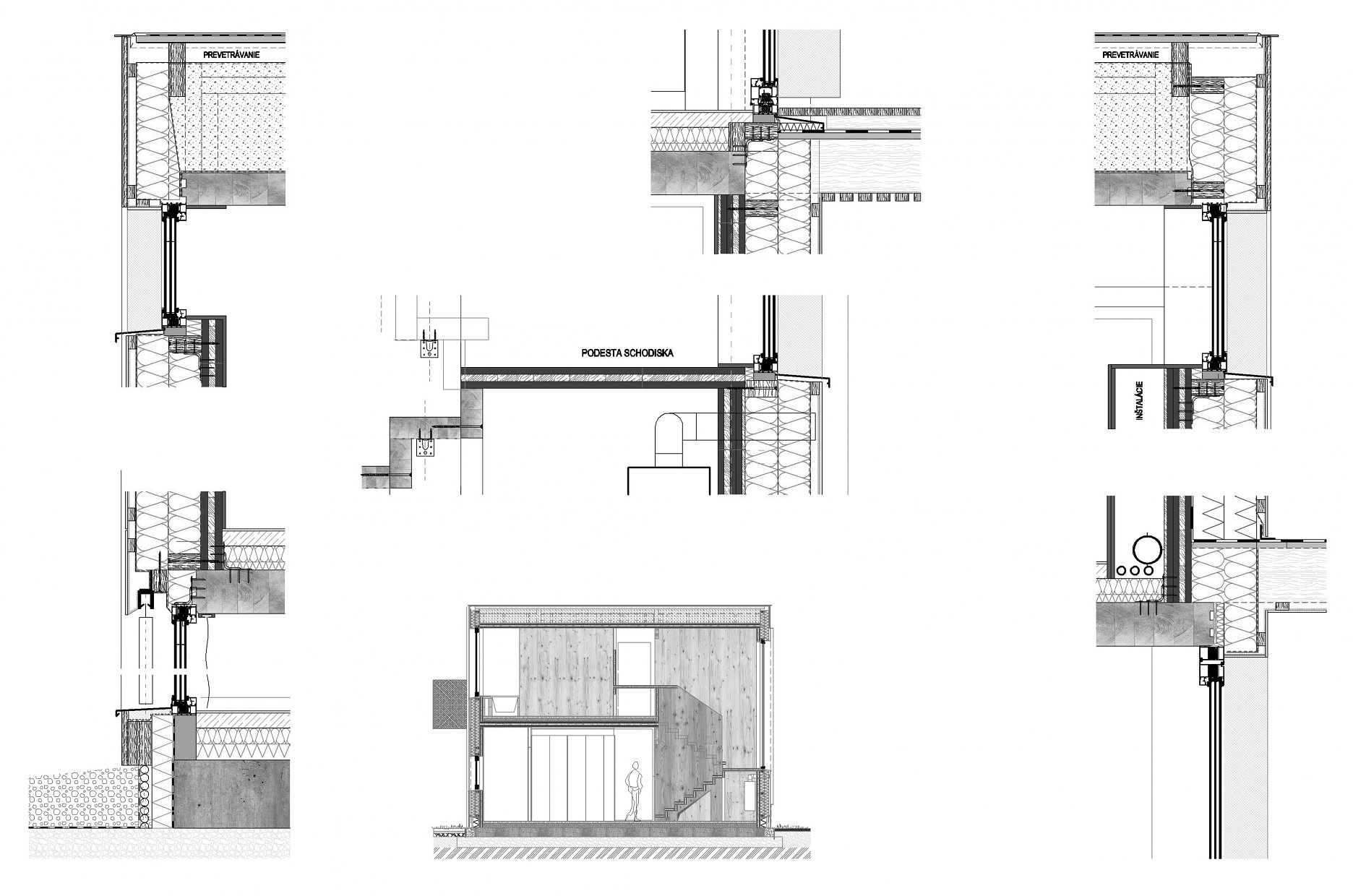 Architektonické riešenie rešpektuje okolité prostredie. Osadenie domu zohľadňuje charakter a tvar okolitých parciel rešpektujúc ich budúce využitie. Prevádzkovo dispozičné riešenie rodinného domu je rozvrhnuté do dvoch výškových úrovní, pričom obe majú vizuálny kontakt so záhradou a lesom v pozadí. Na kryté závetrie vstupu nadväzuje vstupná hala so šatníkom pohotovostným WC. Na vstup priamo nadväzuje schodisko vedúce do nočnej časti. Denný priestor tvorí jednotný objemný celok s obytnou kuchyňou nadväzujúci na terasu. Na poschodí sú dve spálne, pracovný kút, kúpelňa a strešná terasa.