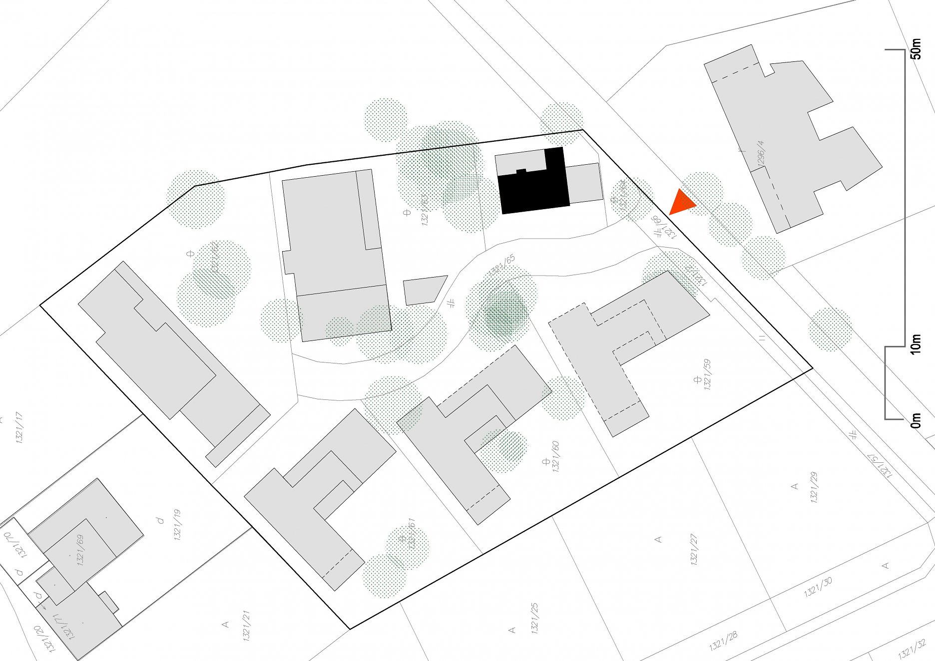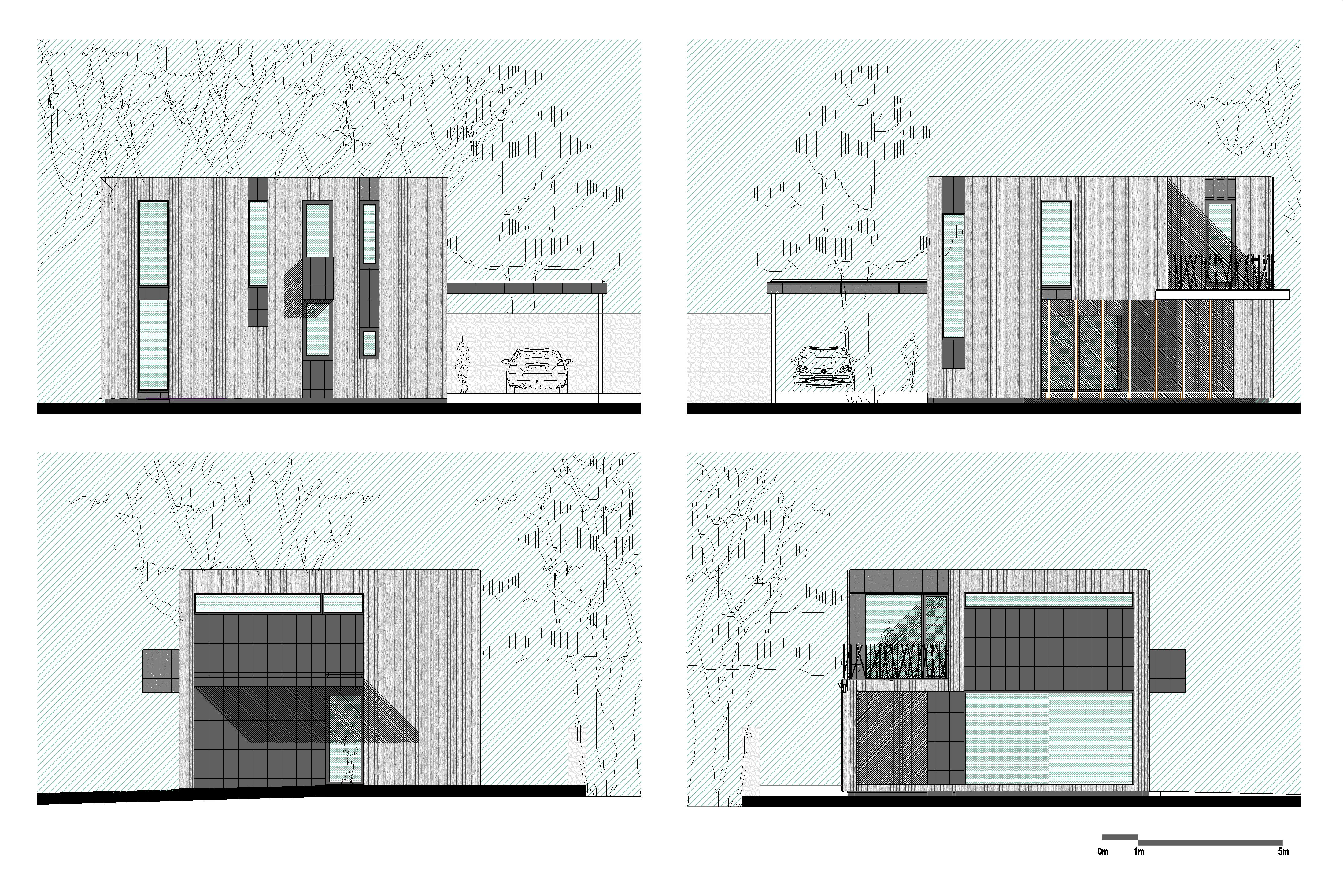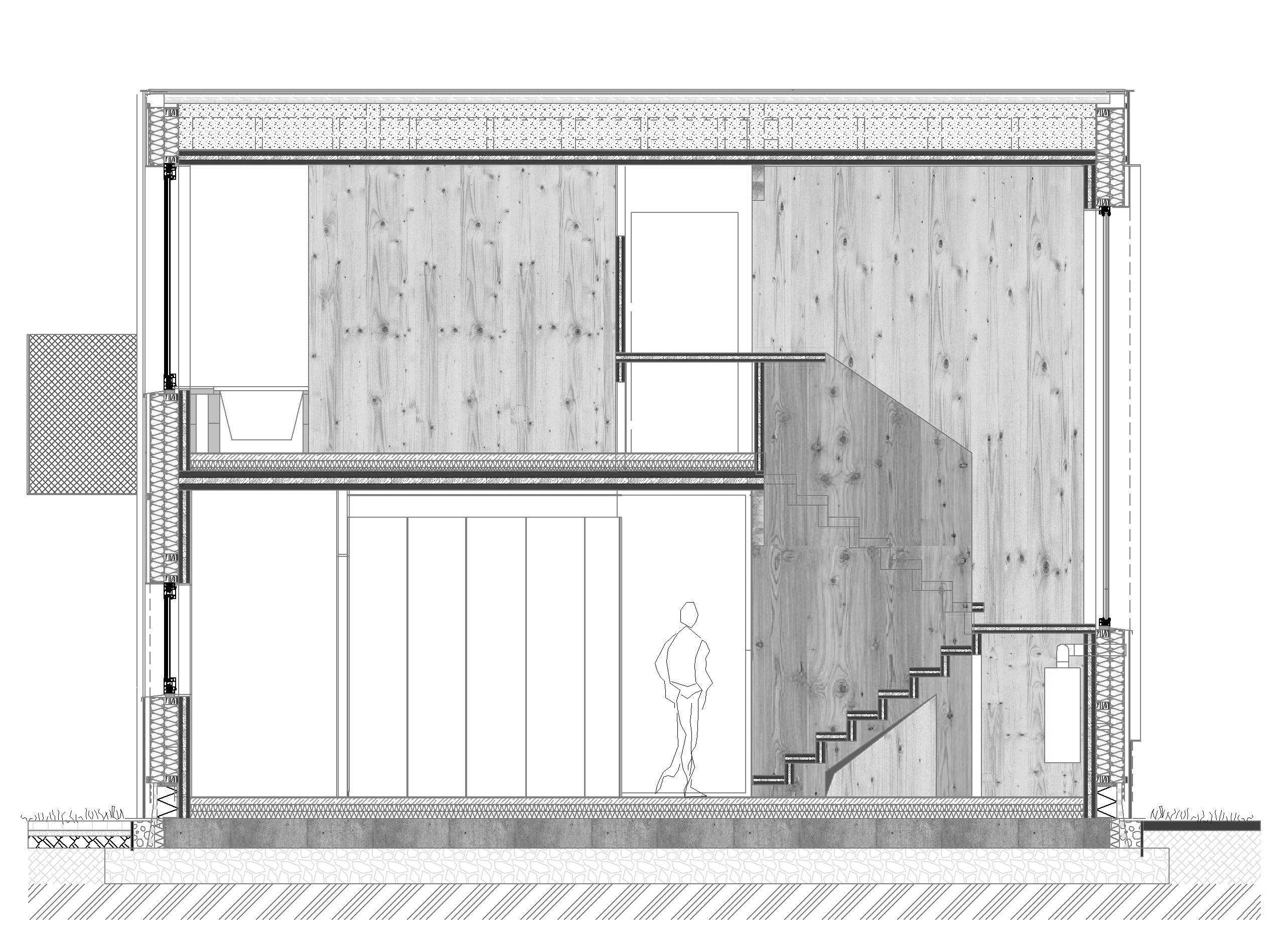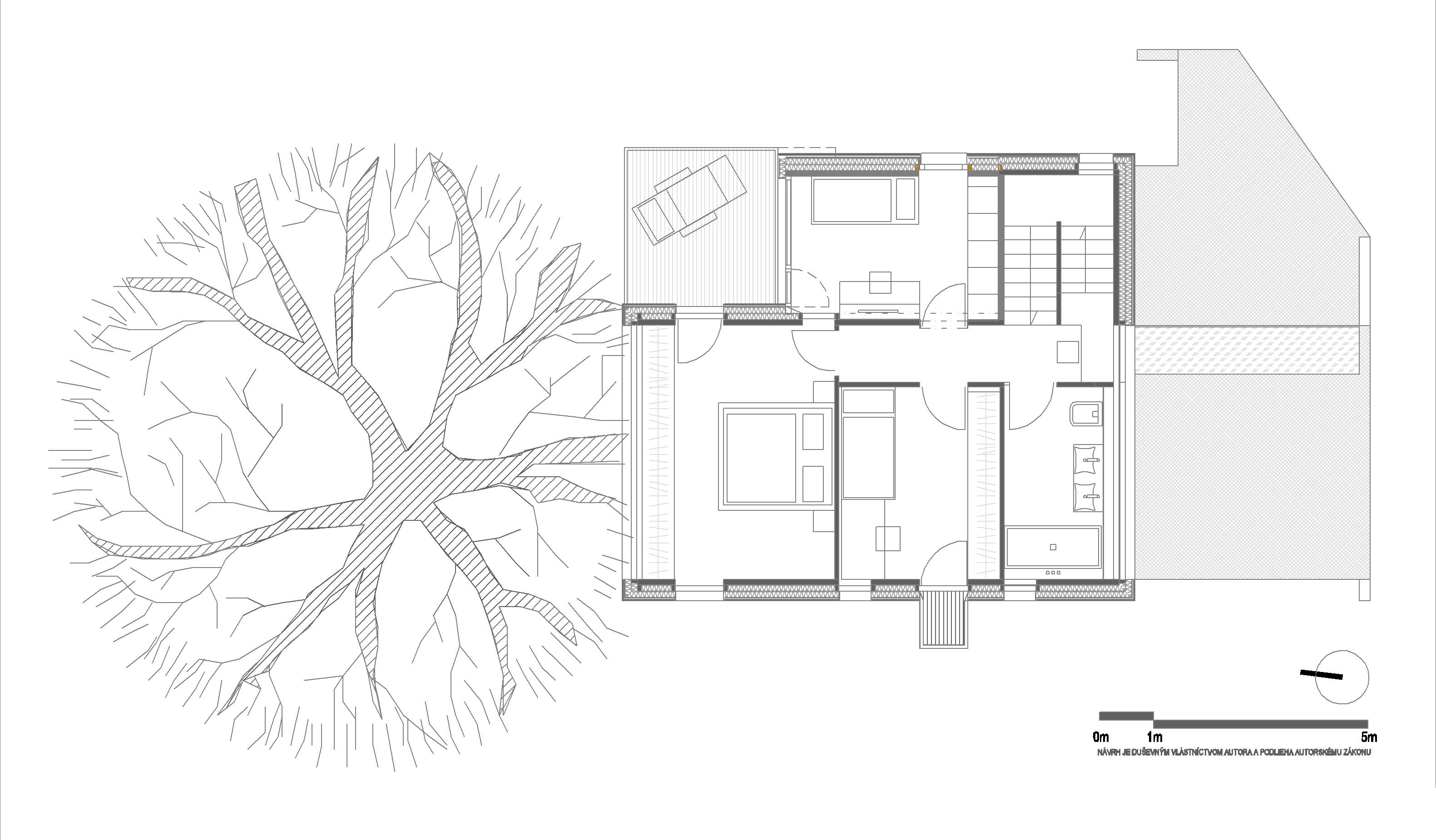 Architektonické riešenie rešpektuje okolité prostredie. Osadenie domu zohľadňuje charakter a tvar okolitých parciel rešpektujúc ich budúce využitie. Prevádzkovo dispozičné riešenie rodinného domu je rozvrhnuté do dvoch výškových úrovní, pričom obe majú vizuálny kontakt so záhradou a lesom v pozadí. Na kryté závetrie vstupu nadväzuje vstupná hala so šatníkom pohotovostným WC. Na vstup priamo nadväzuje schodisko vedúce do nočnej časti. Denný priestor tvorí jednotný objemný celok s obytnou kuchyňou nadväzujúci na terasu. Na poschodí sú dve spálne, pracovný kút, kúpelňa a strešná terasa.