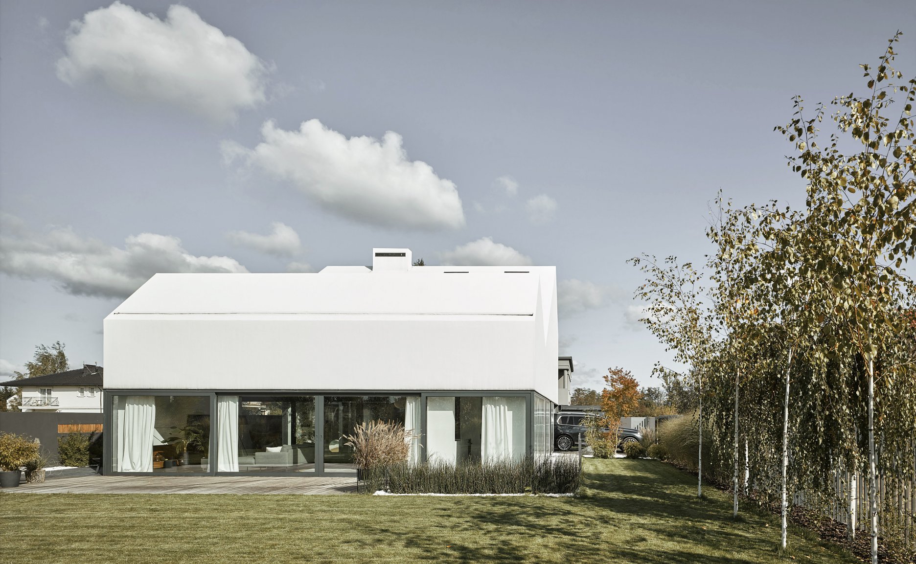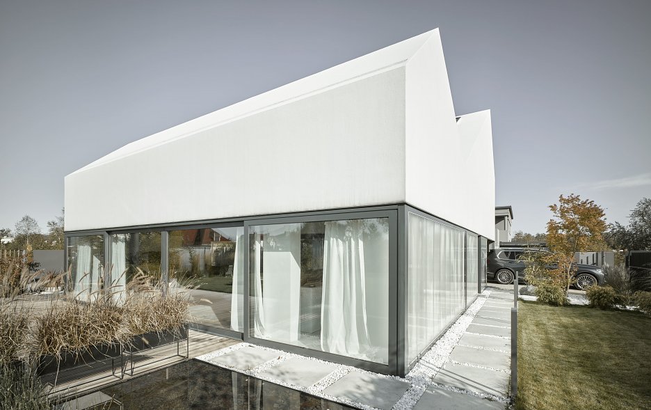 Za čistou formou sa ukrýva množstvo komplikovaných technických riešení a detailov. Neobvyklá je napríklad priesvitná garážová brána z polykarbonátu, alebo strecha bez akýchkoľvek rušivých prvkov splývajúca s fasádami domu.