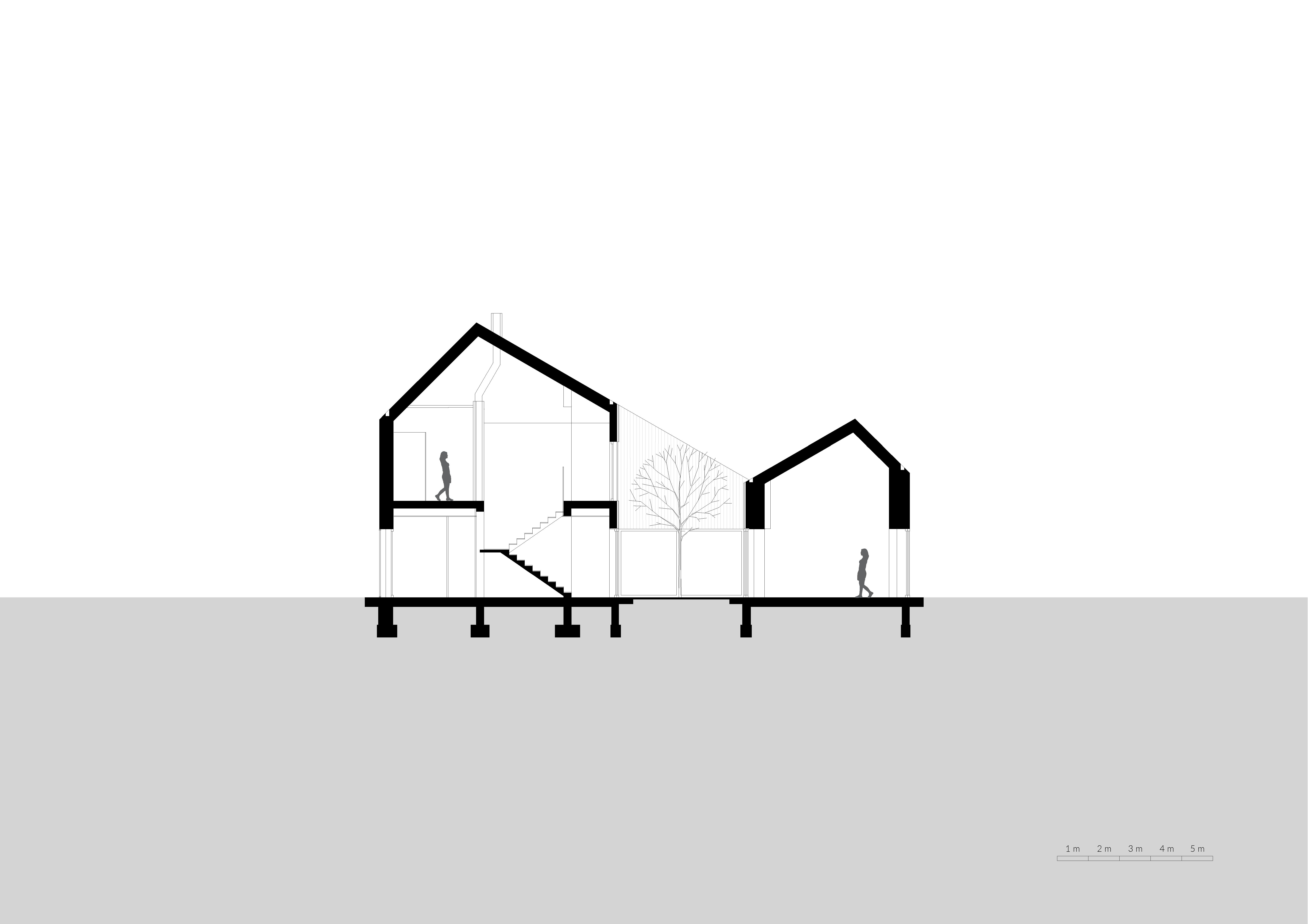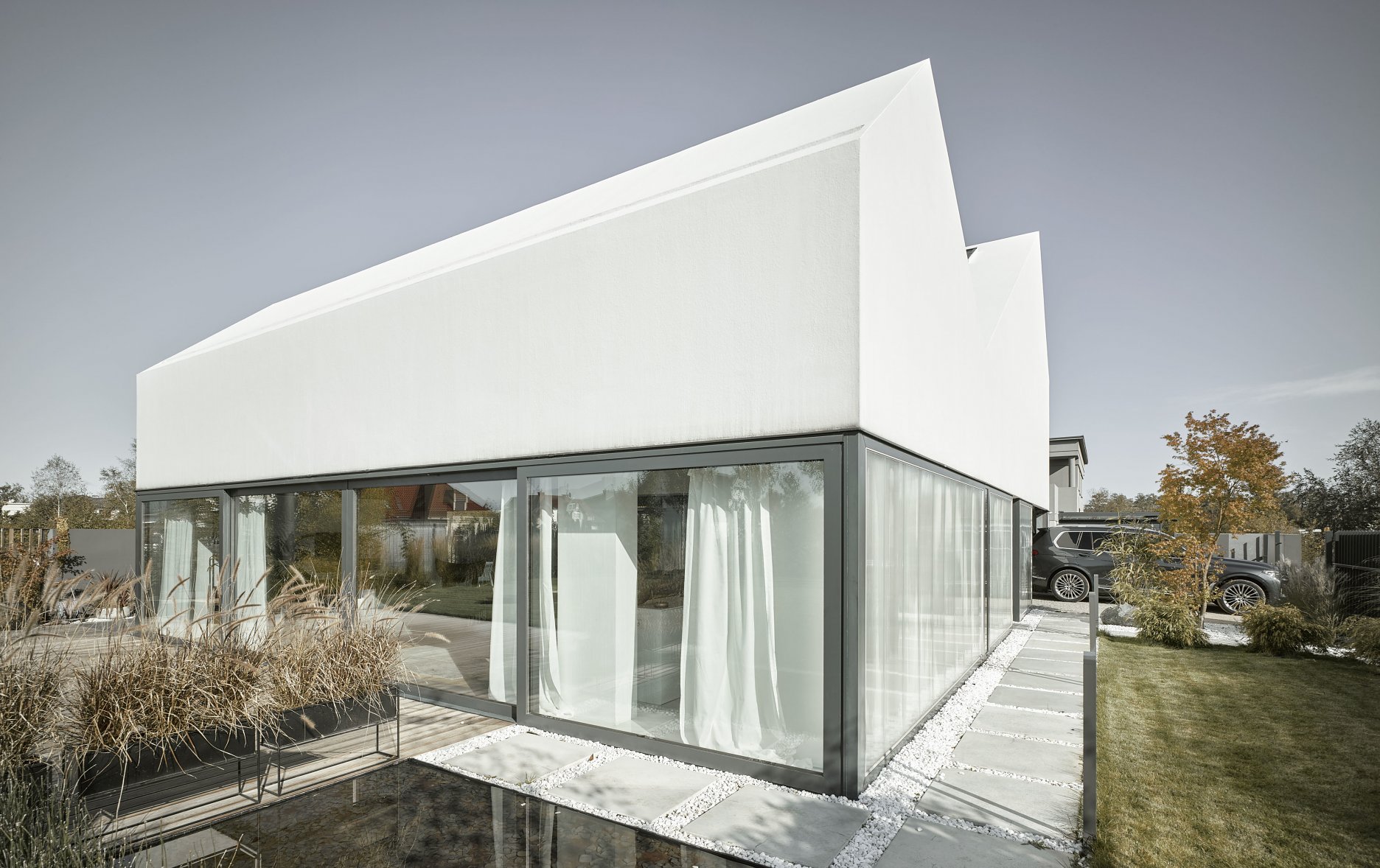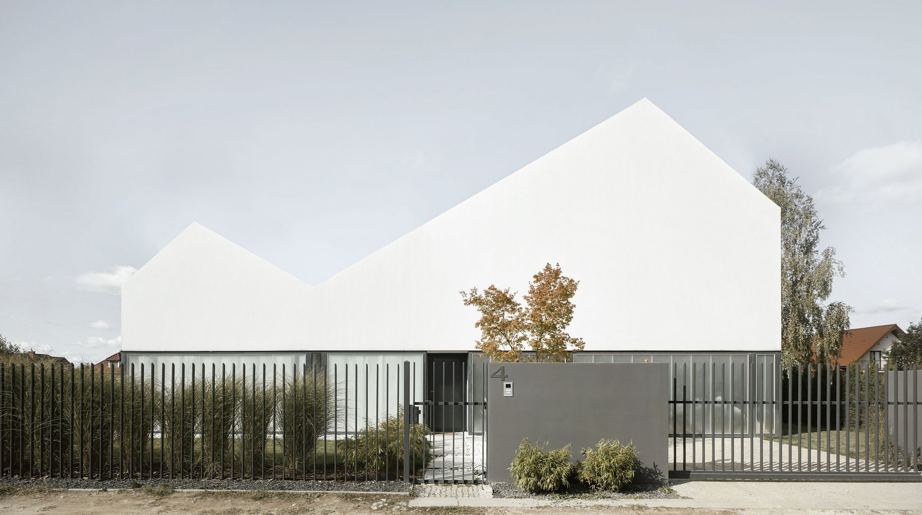 Relatívne malý pozemok a požiadavka na súkromie v hustej prímestskej zástavbe viedli ku konceptu, ktorého ústredným prvkom je malé átrium. Práve centrálny otvorený priestor a využitie sklonu dvojitej sedlovej strechy na presvetlenie miestností na poschodí umožnili architektom dosiahnuť minimalistickú kompozíciu, založenú na kontraste transparentného parteru a hmoty poschodia.