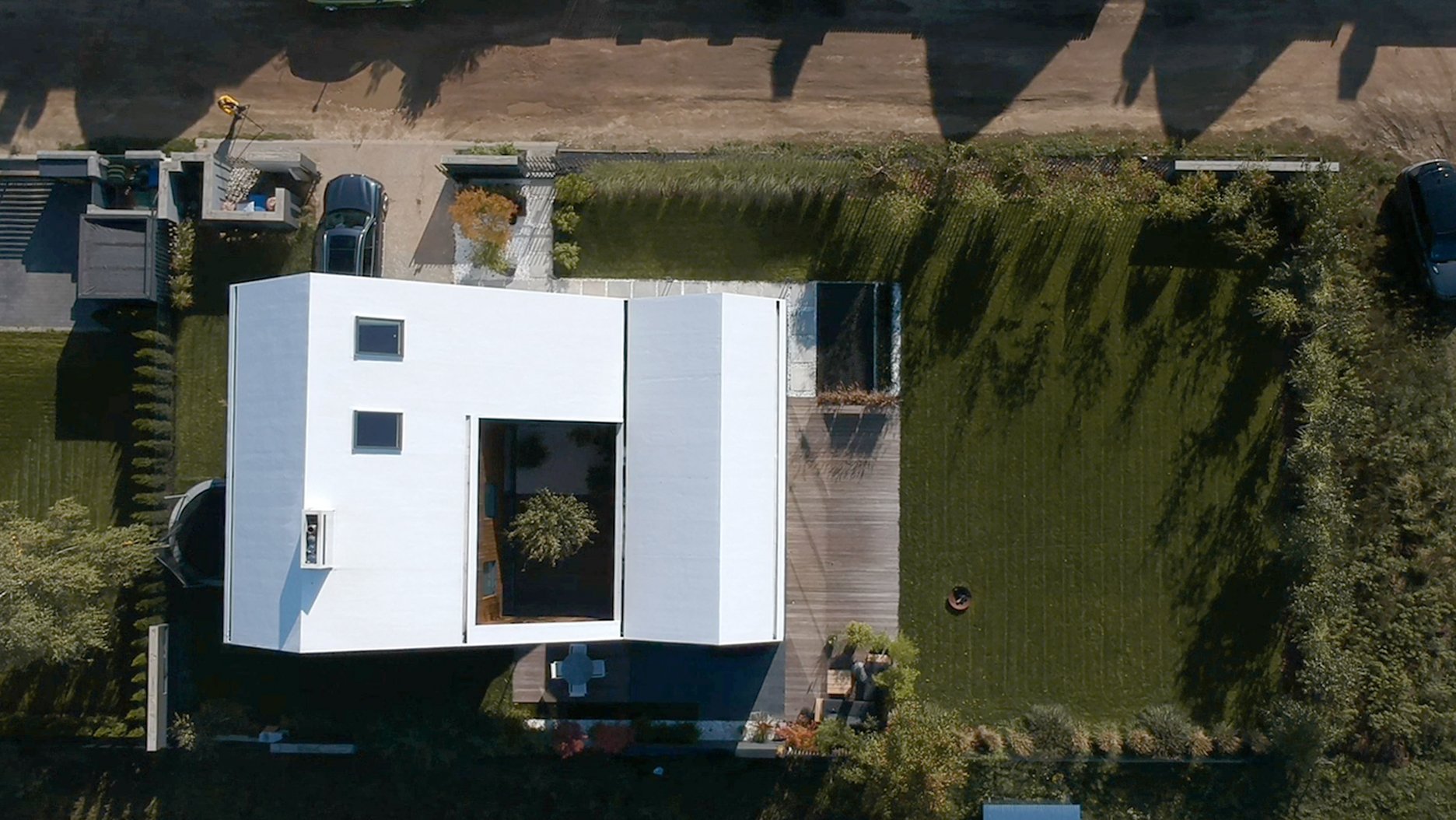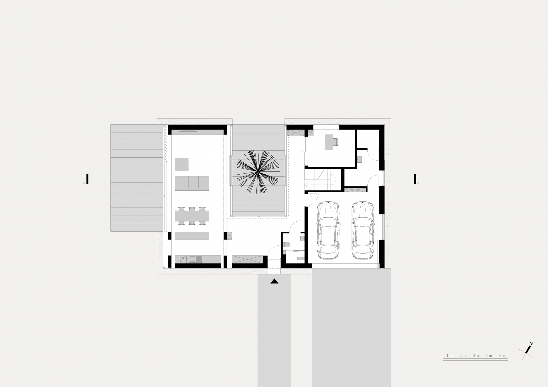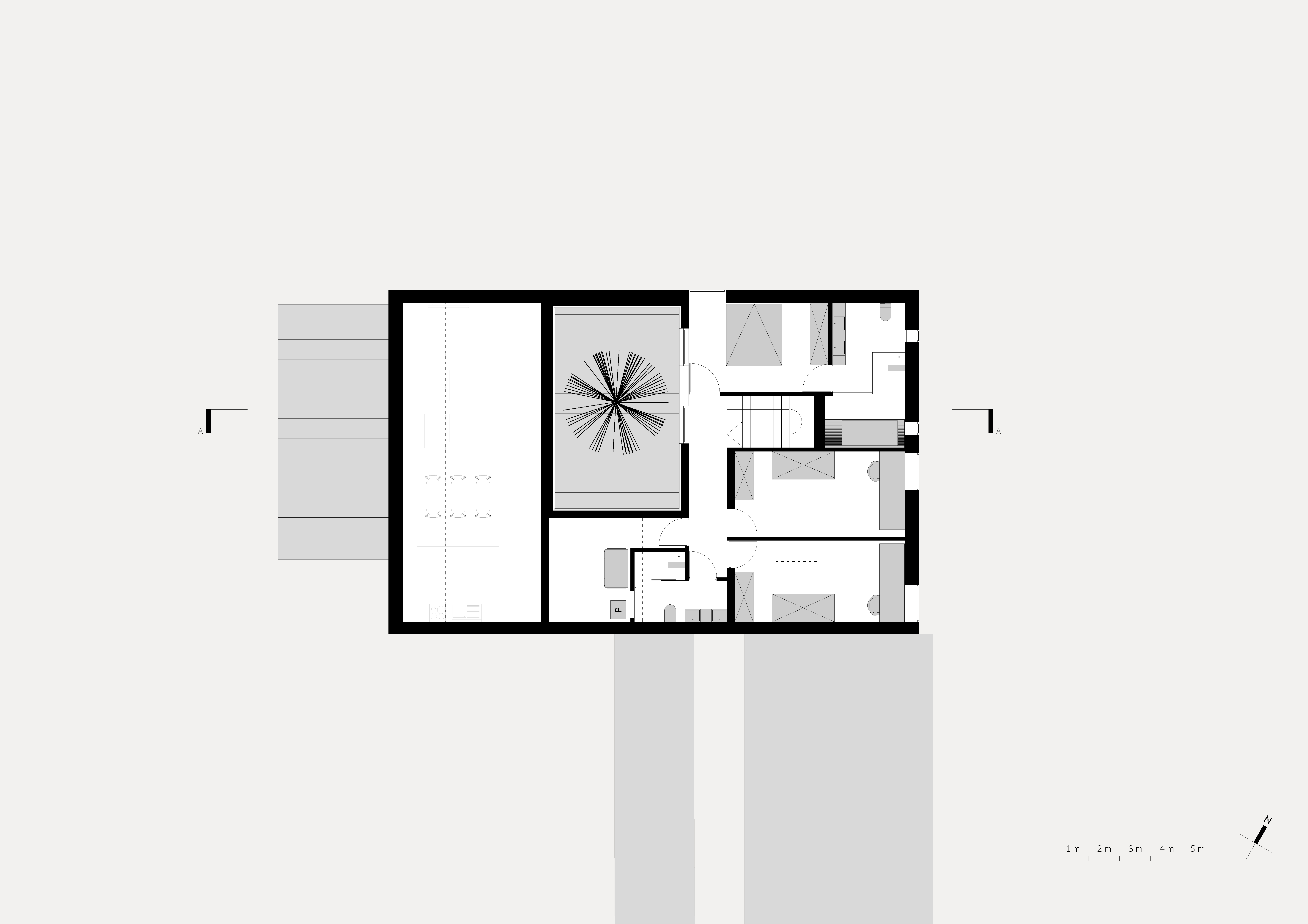 Architekti sa zamerali na hľadanie riešení, ktoré by vyťažili maximum z povolenej zastavanej plochy. Átrium tvorí v letných mesiacoch ďalšiu obytnú miestnosť, ktorá je prepojená s interiérom prostredníctvom celopresklených fasád a rozmerných posuvných dverí. Toto riešenie vyhovuje najmä v situácii, keď si práca z domu nevyžaduje najvyššiu koncentráciu. Rodičia majú neustály vizuálny kontakt s deťmi, pre ktorých sa átrium stalo miestom pre hry a rôznorodé aktivity. V prípade potreby stačí zavrieť posuvné dvere, zatiahnuť rolety a oddeliť pracovisko od zvyšku domu.