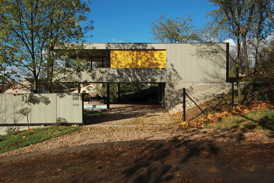 Využitie prirodzeného reliéfu svahovitého pozemku - jednoduchý drevený hranol posadený na betónovom sokli, zapustenom do svahu. Koncová časť nesená štyrmi stĺpmi. Priestor pod domom využitý ako rozsiahla terasa s bazénom. Orientácia miestností na juh a západ - panoramatický pohľad do krajiny a korún stromov. Prísna modulárnosť domu, vychádzajúca z výrobného formátu obkladových dosiek - definuje systém a prevádzku.