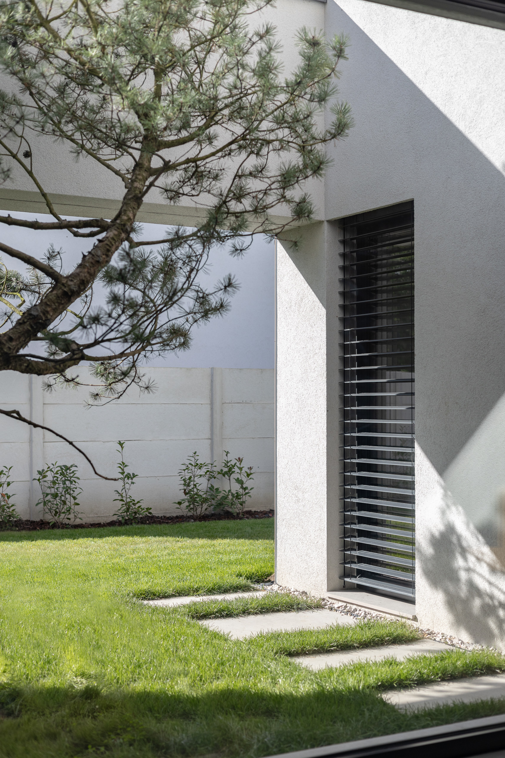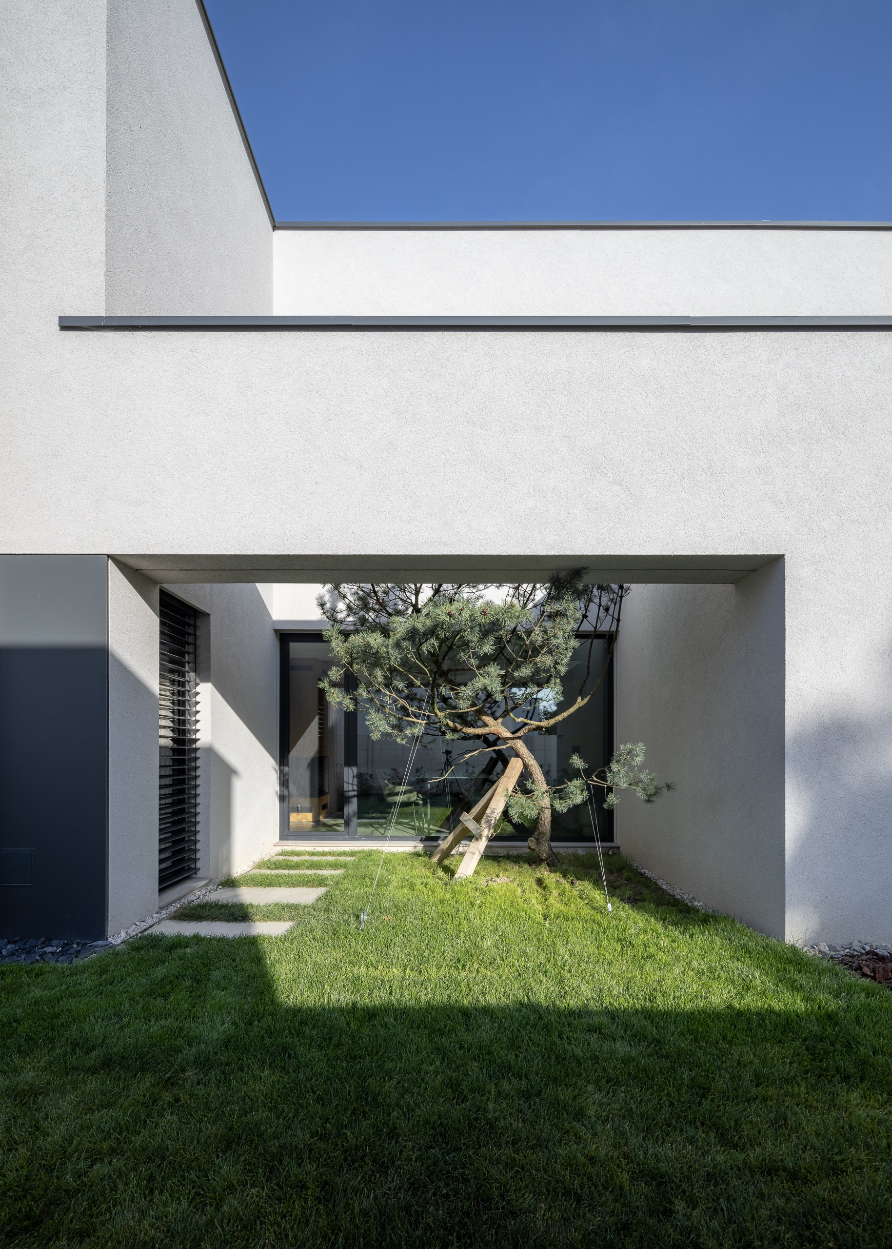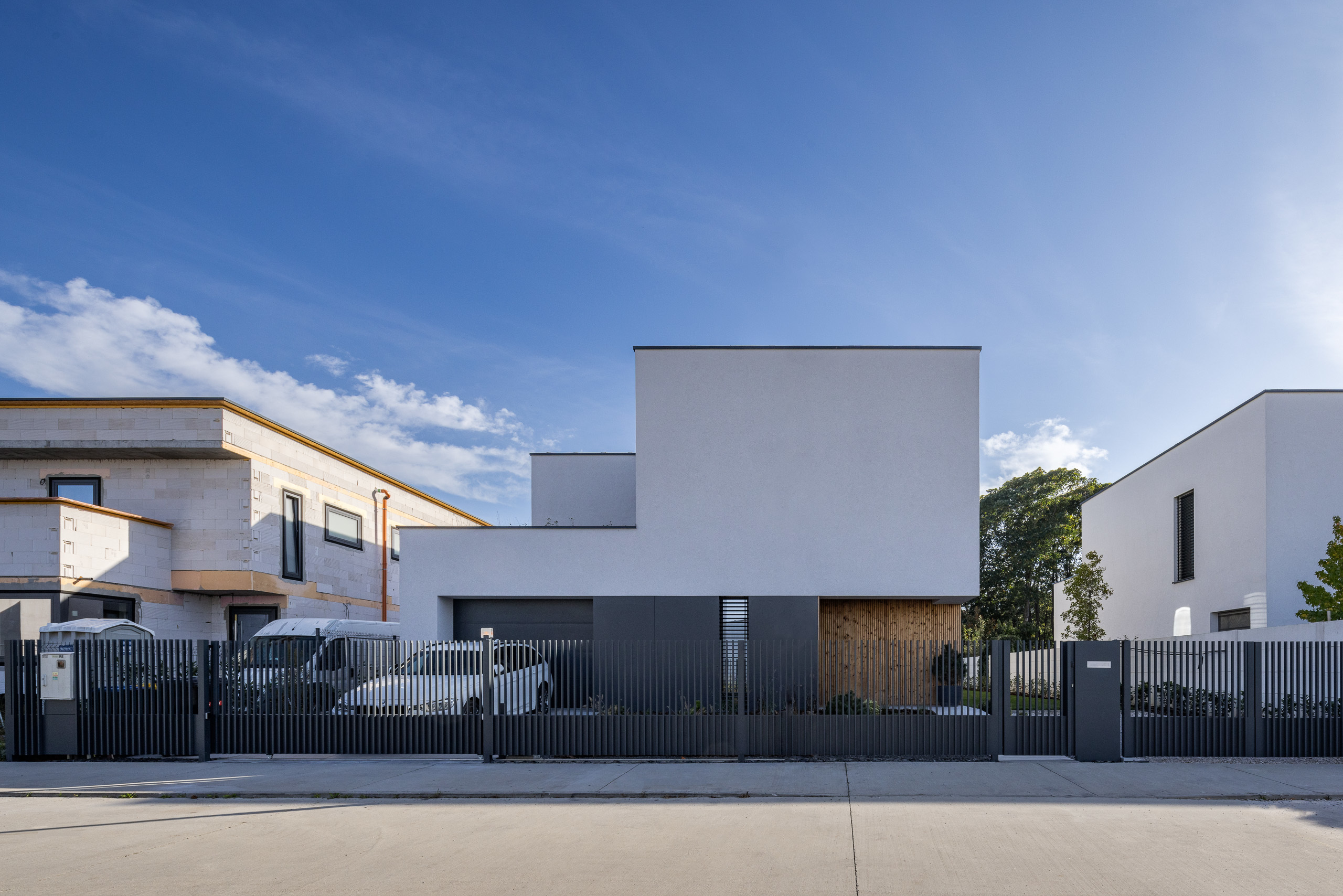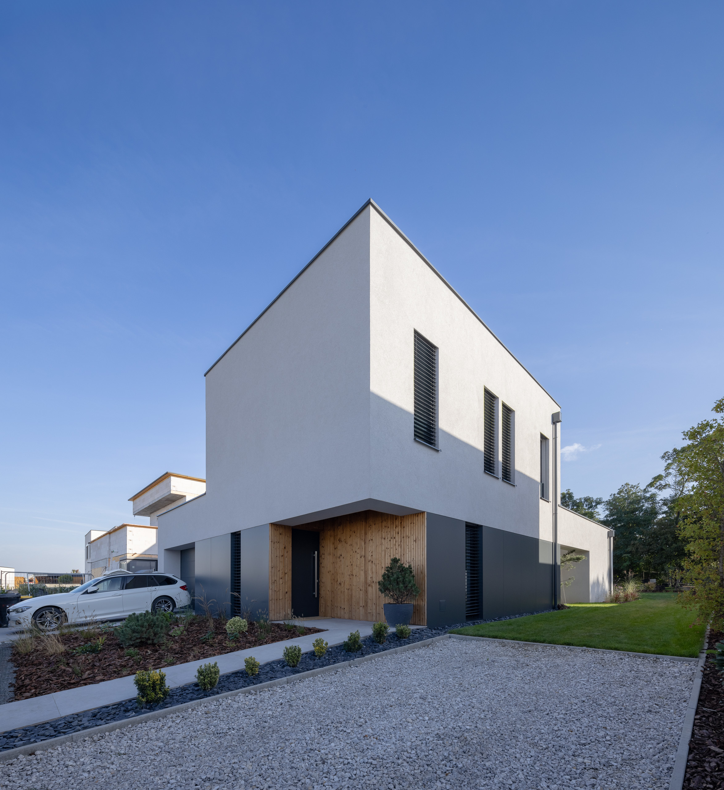 Základný tvar domu tvorí kváder osadený pozdĺžne na pozemku. Vybratím hmôt v nárožiach a perforovaním bočných stien sme vytvorili kompozíciu, ktorá zabezpečila otvorenosť a presvetlenie celého domu. Do ulice je orientované len jedno okno - kontrolný bod vo vstupnej chodbe. Vstup do domu je zapustený a podporený akcentom v podobe dreveného obkladu, ktorý sa opakuje aj v priestore terasy zo strany záhrady. Uličná kompozícia domu je podporená antracitovým obkladom Fundermax. Ten prechádza horizontálne na bočnú západnú stenu domu až do pátia s borovicou. Veľké presklenia na južnej a západnej fasáde vnášajú do interiéru rodinného domu ľahkosť a vymazávajú hranicu medzi interiérom a exteriérom.