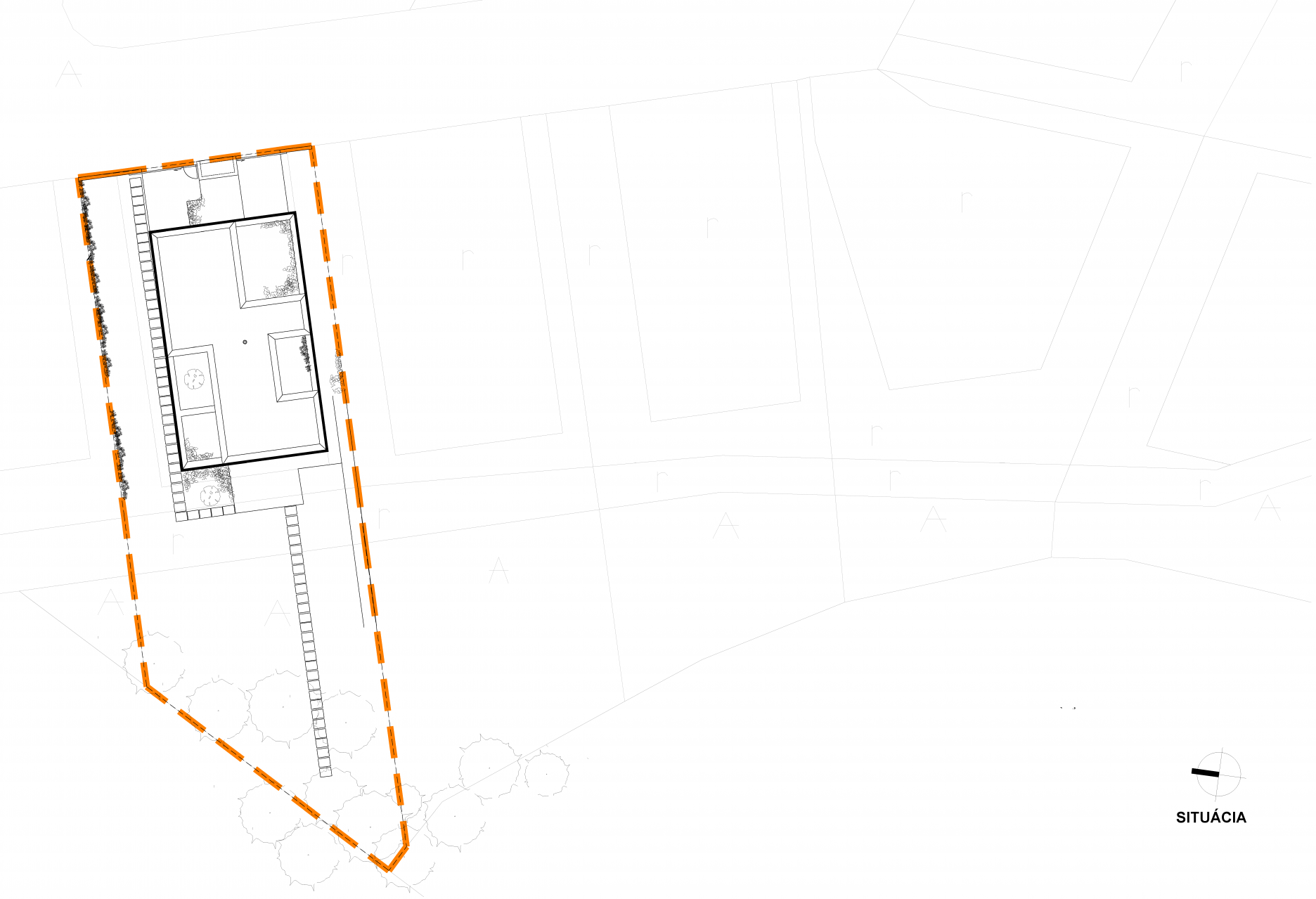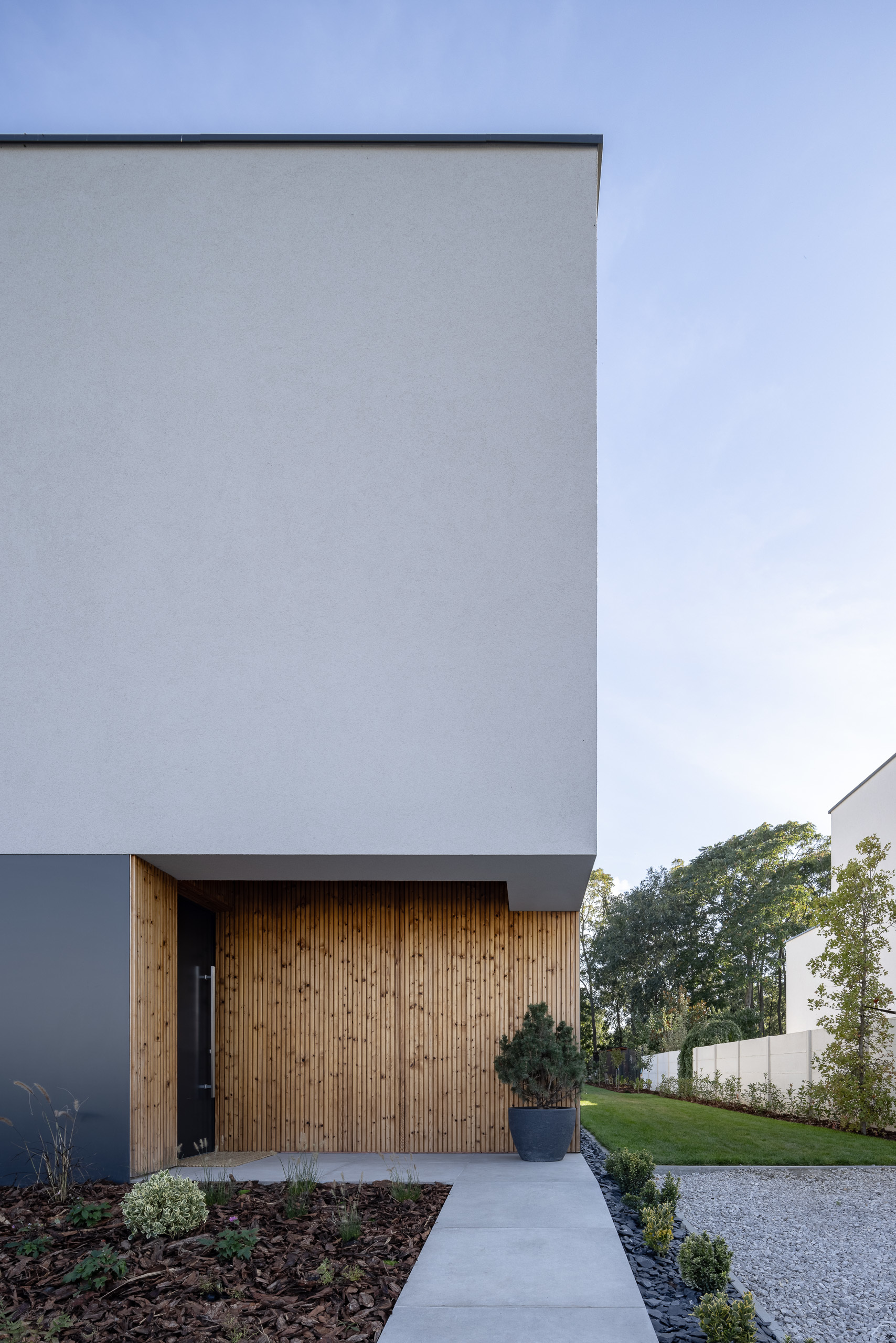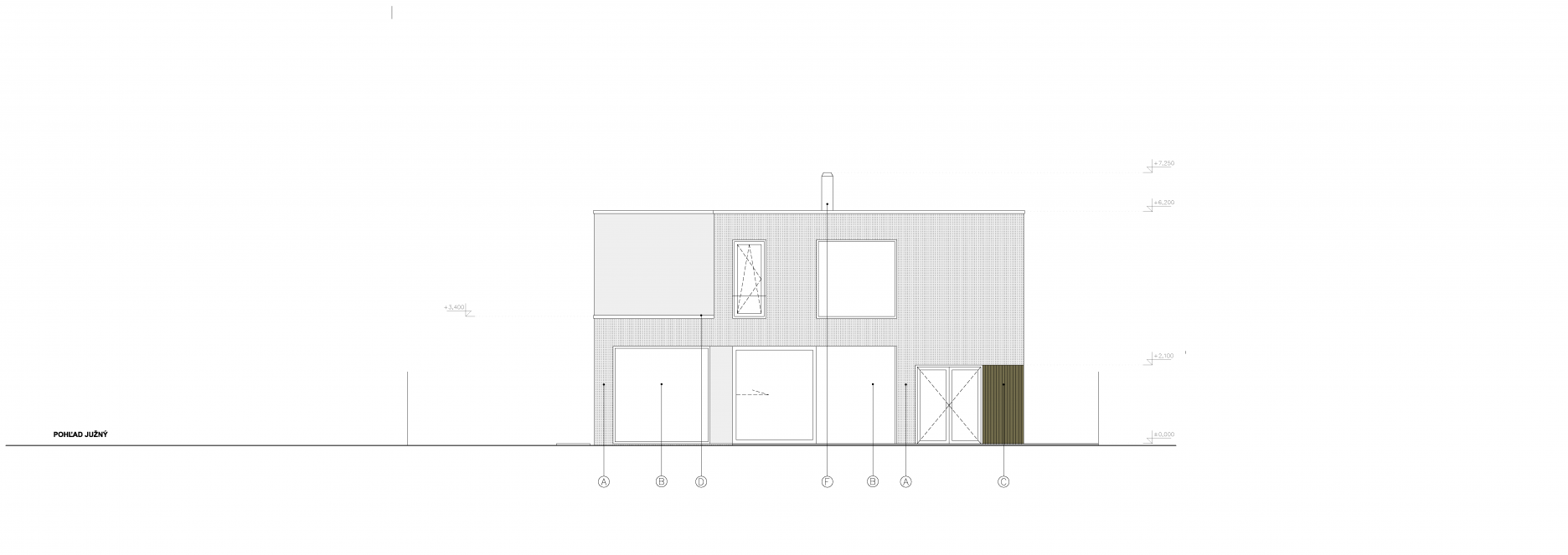 Základný tvar domu tvorí kváder osadený pozdĺžne na pozemku. Vybratím hmôt v nárožiach a perforovaním bočných stien sme vytvorili kompozíciu, ktorá zabezpečila otvorenosť a presvetlenie celého domu. Do ulice je orientované len jedno okno - kontrolný bod vo vstupnej chodbe. Vstup do domu je zapustený a podporený akcentom v podobe dreveného obkladu, ktorý sa opakuje aj v priestore terasy zo strany záhrady. Uličná kompozícia domu je podporená antracitovým obkladom Fundermax. Ten prechádza horizontálne na bočnú západnú stenu domu až do pátia s borovicou. Veľké presklenia na južnej a západnej fasáde vnášajú do interiéru rodinného domu ľahkosť a vymazávajú hranicu medzi interiérom a exteriérom.