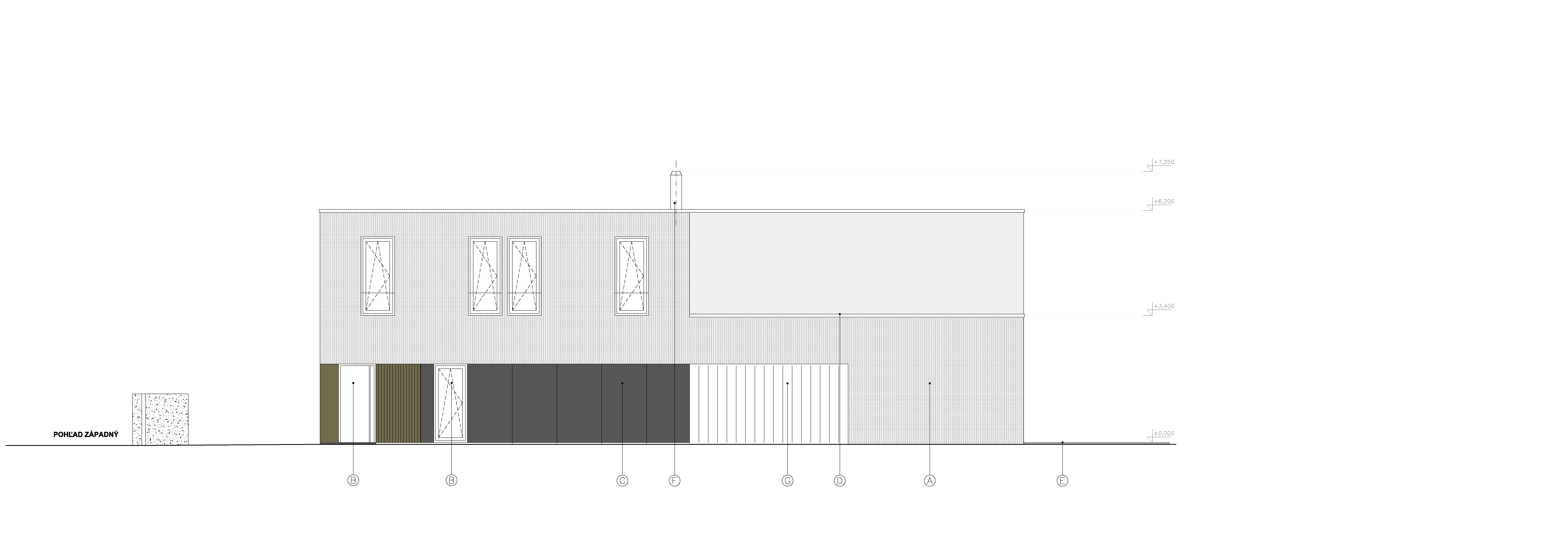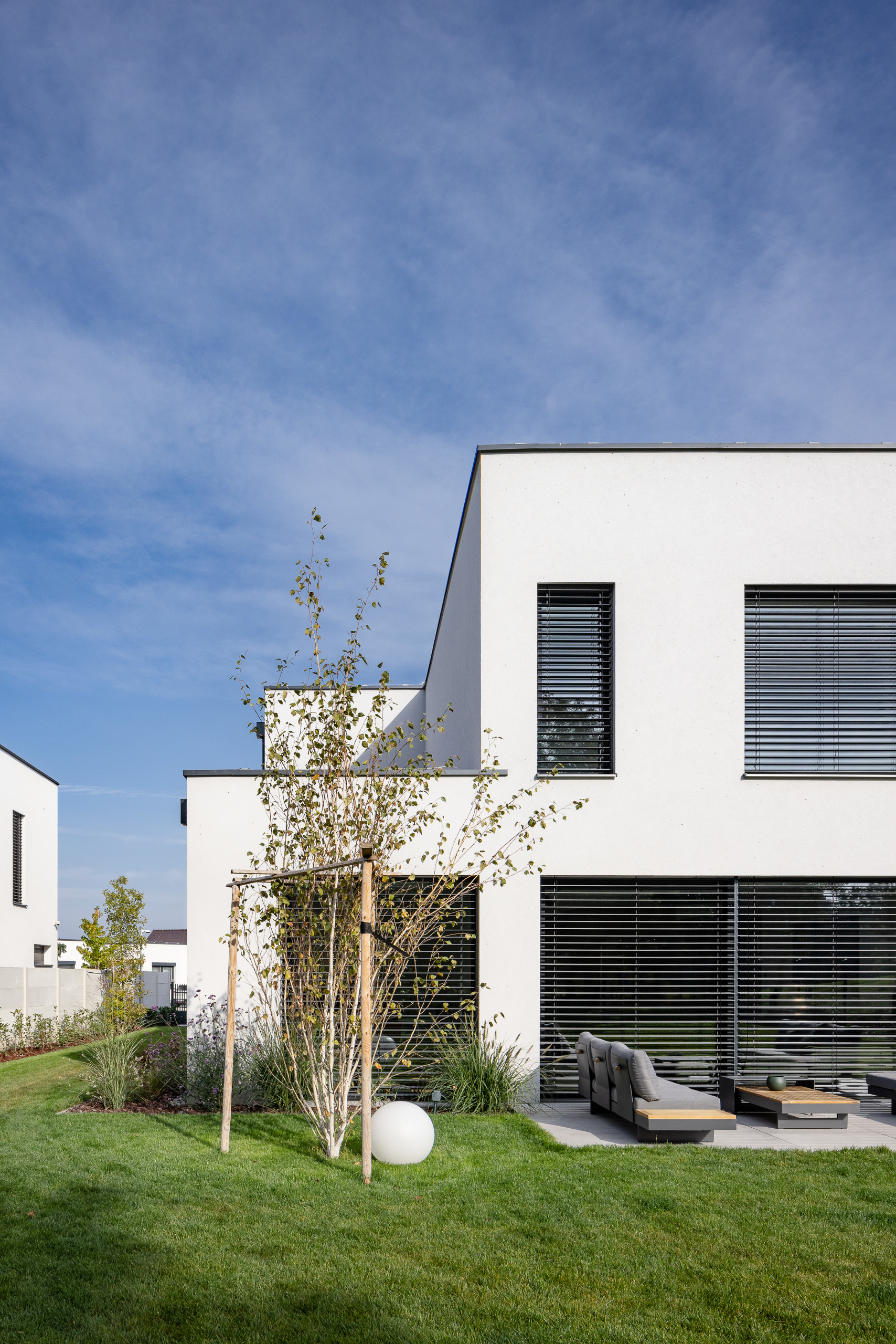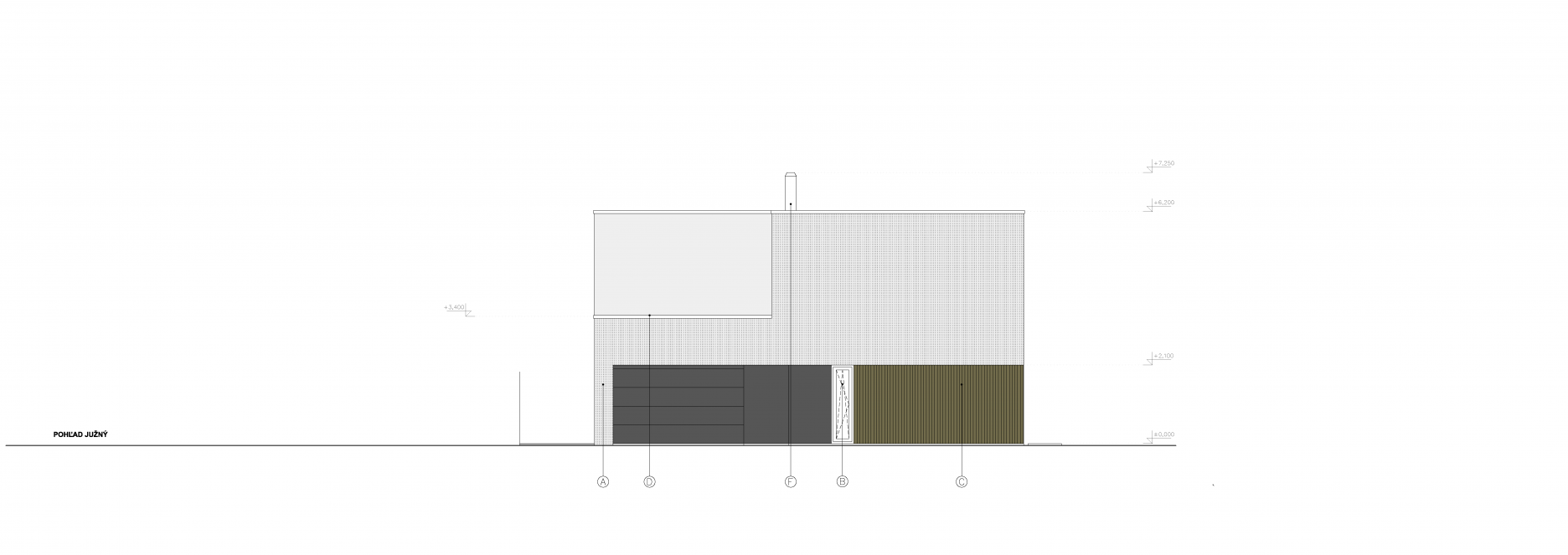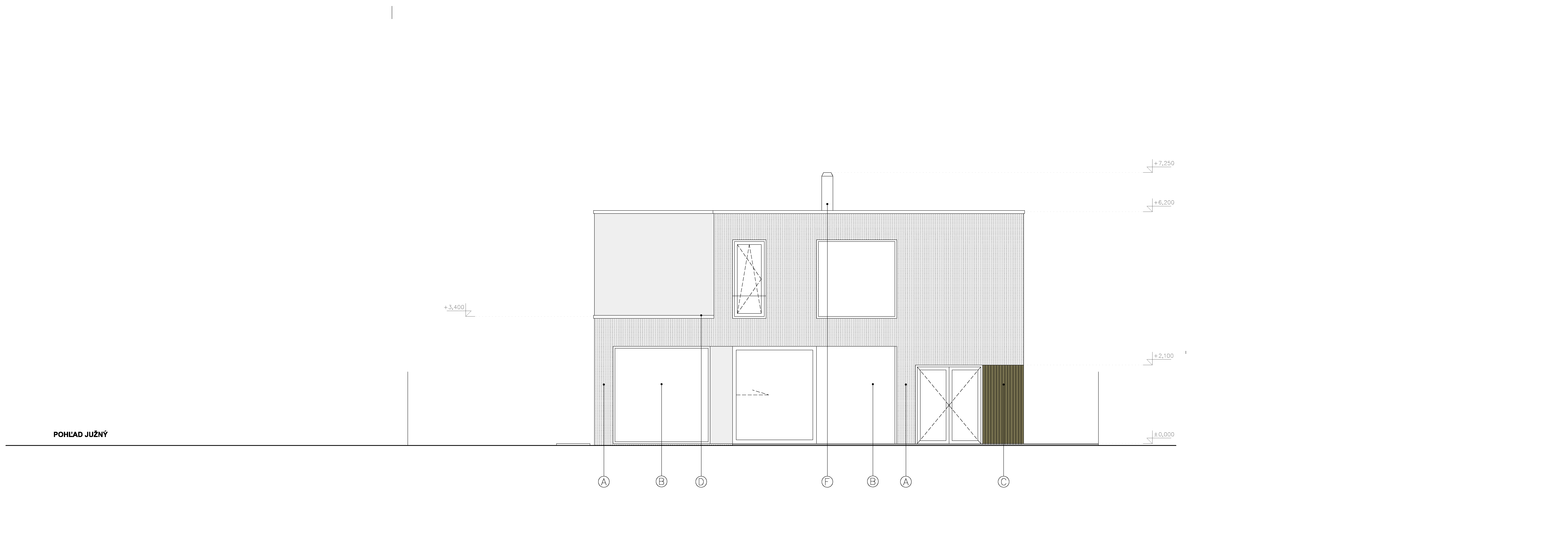 Základný tvar domu tvorí kváder osadený pozdĺžne na pozemku. Vybratím hmôt v nárožiach a perforovaním bočných stien sme vytvorili kompozíciu, ktorá zabezpečila otvorenosť a presvetlenie celého domu. Do ulice je orientované len jedno okno - kontrolný bod vo vstupnej chodbe. Vstup do domu je zapustený a podporený akcentom v podobe dreveného obkladu, ktorý sa opakuje aj v priestore terasy zo strany záhrady. Uličná kompozícia domu je podporená antracitovým obkladom Fundermax. Ten prechádza horizontálne na bočnú západnú stenu domu až do pátia s borovicou. Veľké presklenia na južnej a západnej fasáde vnášajú do interiéru rodinného domu ľahkosť a vymazávajú hranicu medzi interiérom a exteriérom.
