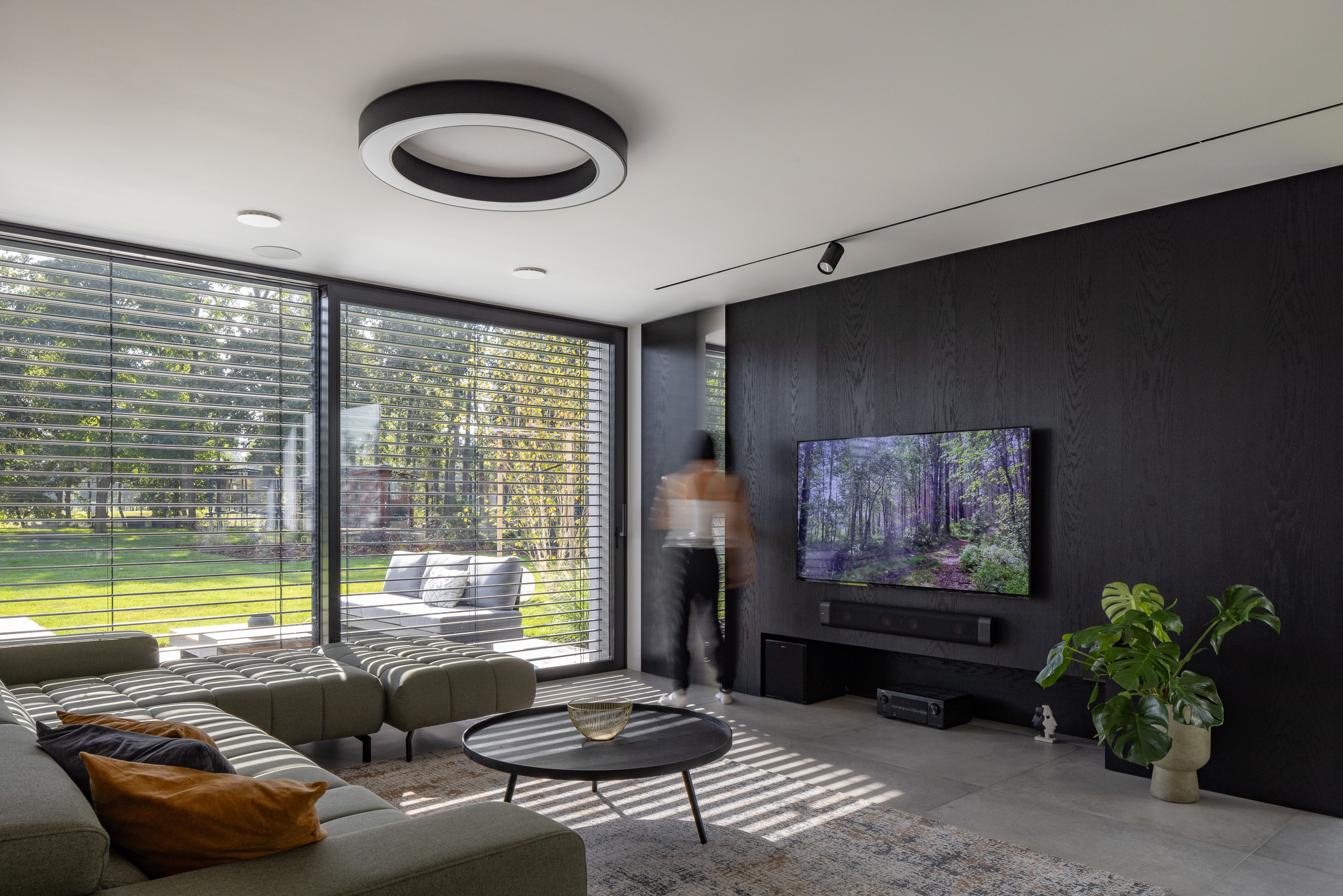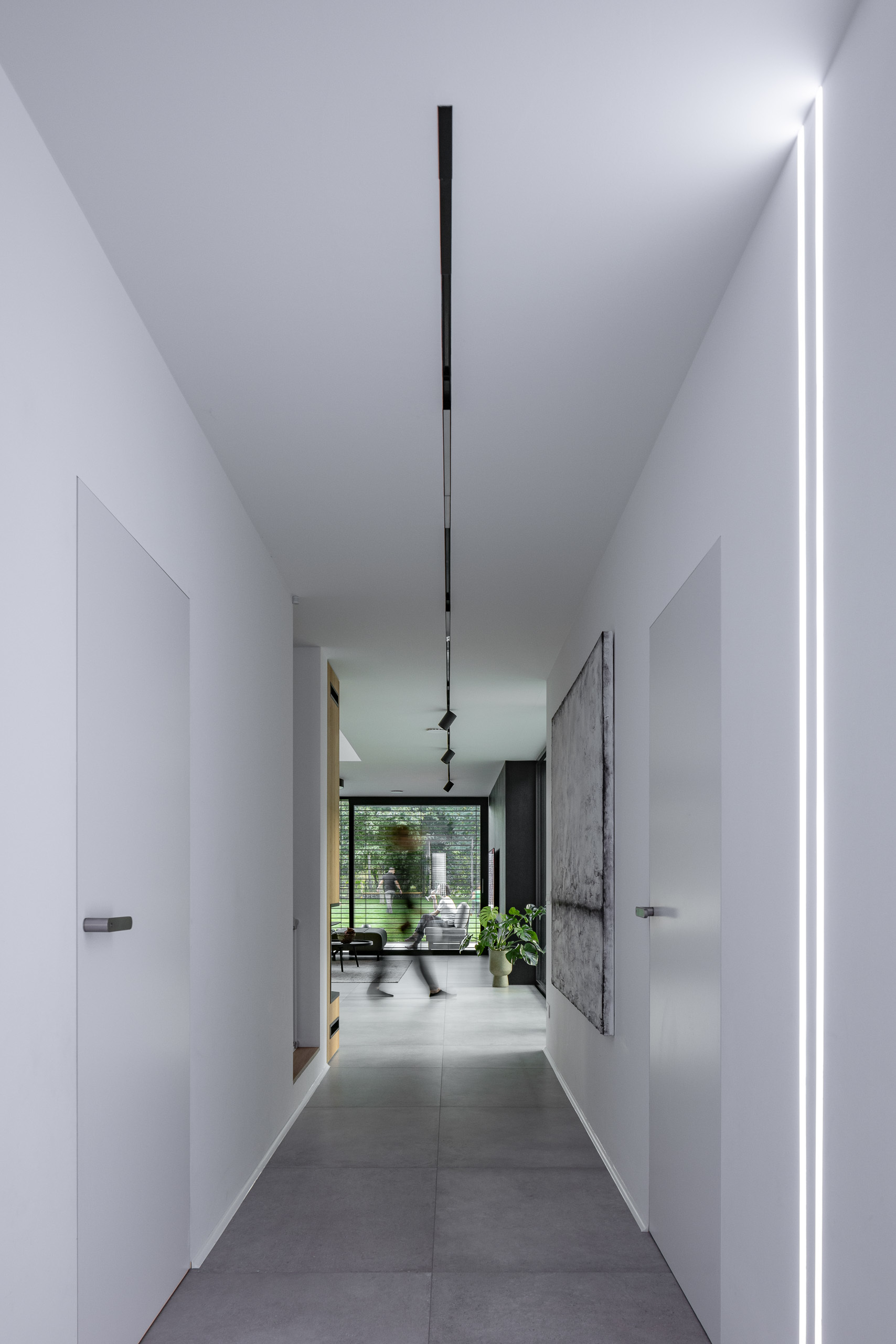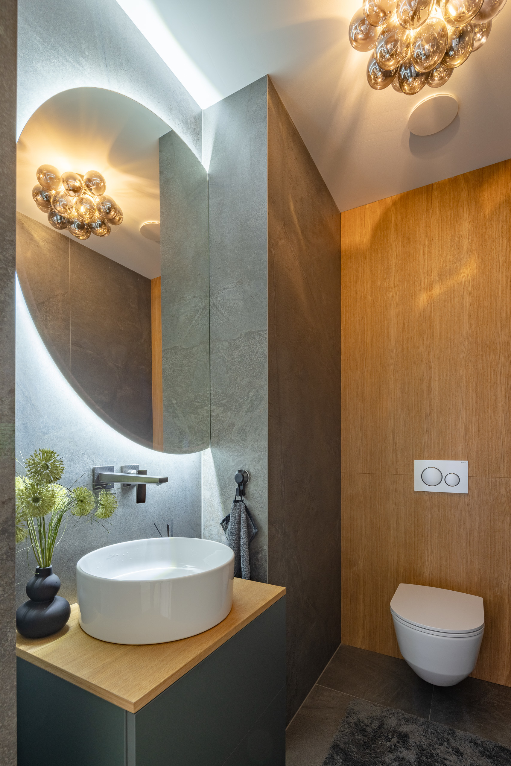 Tmavý keramický obklad a tlmené osvetlenie Kúpeľne a WC tvorí protiklad k svetlým priestorom chodby. Veľkoformátová sivá dlažba na prízemí plynulo prechádza na exteriérovú terasu. Na druhom podlaží je navrhnutá drevená podlaha. Osvetlenie vo väčšine priestorov je riešené zapusteným koľajnicovým systémom. Výnimku tvorí zavesené svietidlo je nad jedálenským stolom.