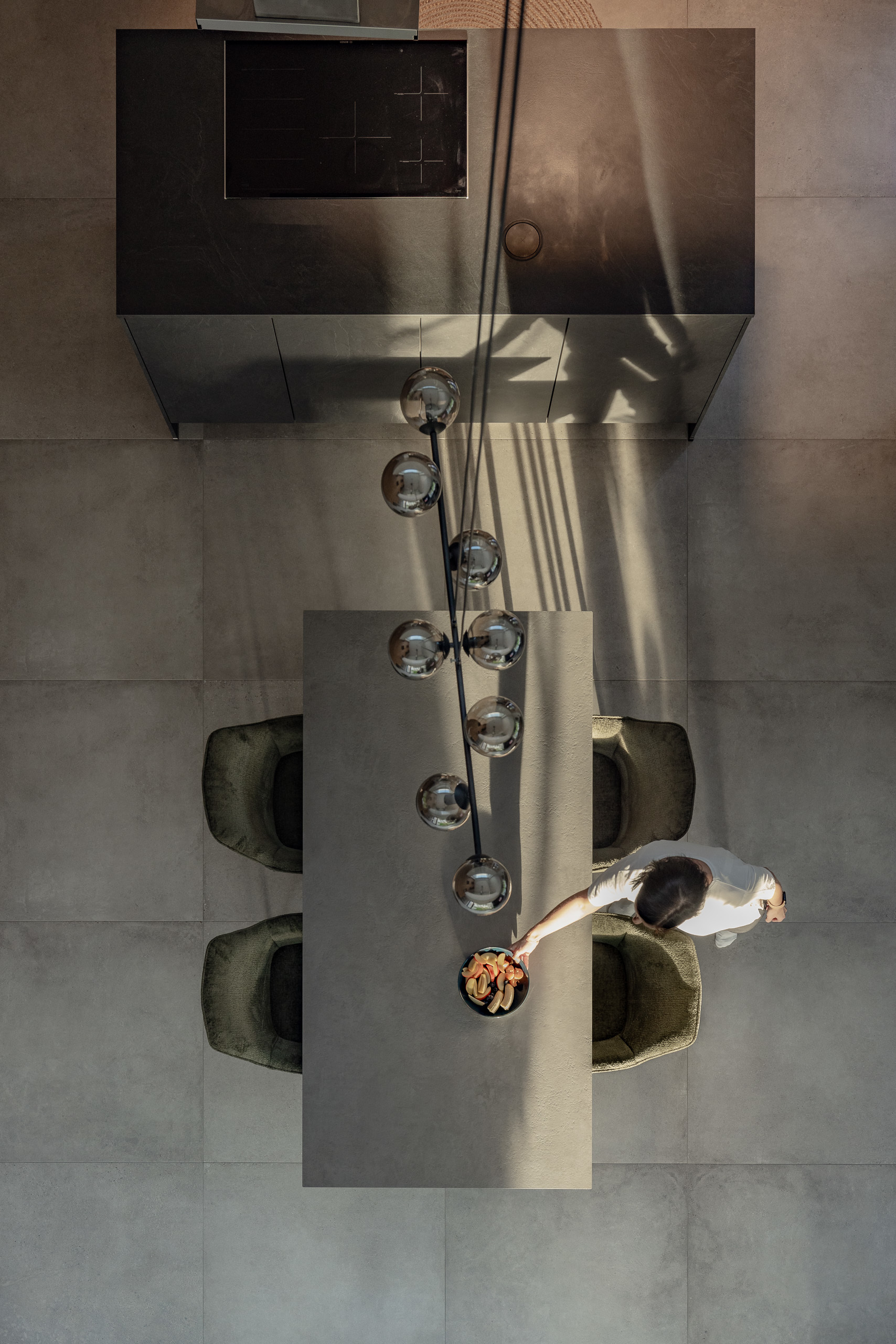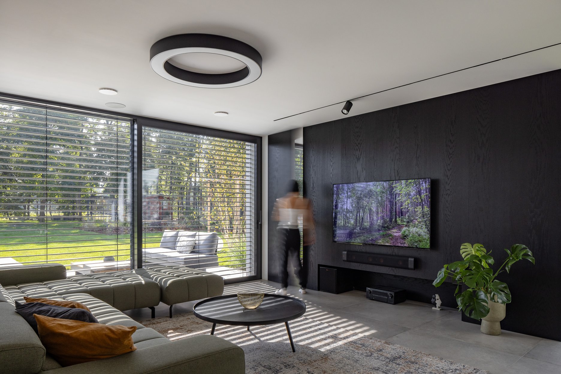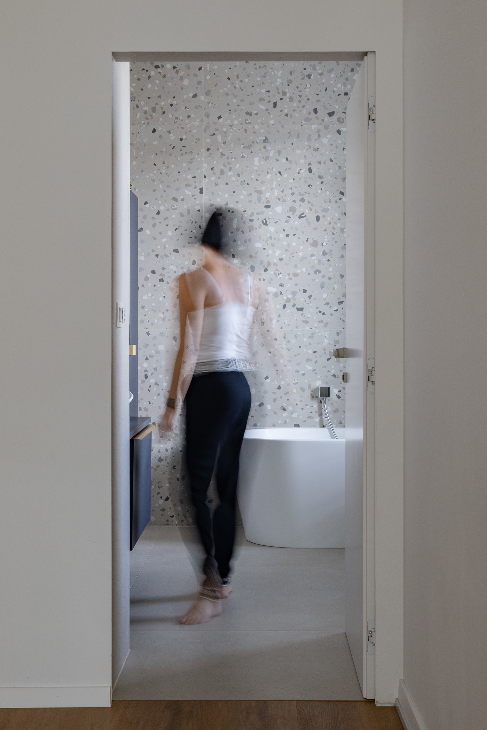 Tmavý keramický obklad a tlmené osvetlenie Kúpeľne a WC tvorí protiklad k svetlým priestorom chodby. Veľkoformátová sivá dlažba na prízemí plynulo prechádza na exteriérovú terasu. Na druhom podlaží je navrhnutá drevená podlaha. Osvetlenie vo väčšine priestorov je riešené zapusteným koľajnicovým systémom. Výnimku tvorí zavesené svietidlo je nad jedálenským stolom.