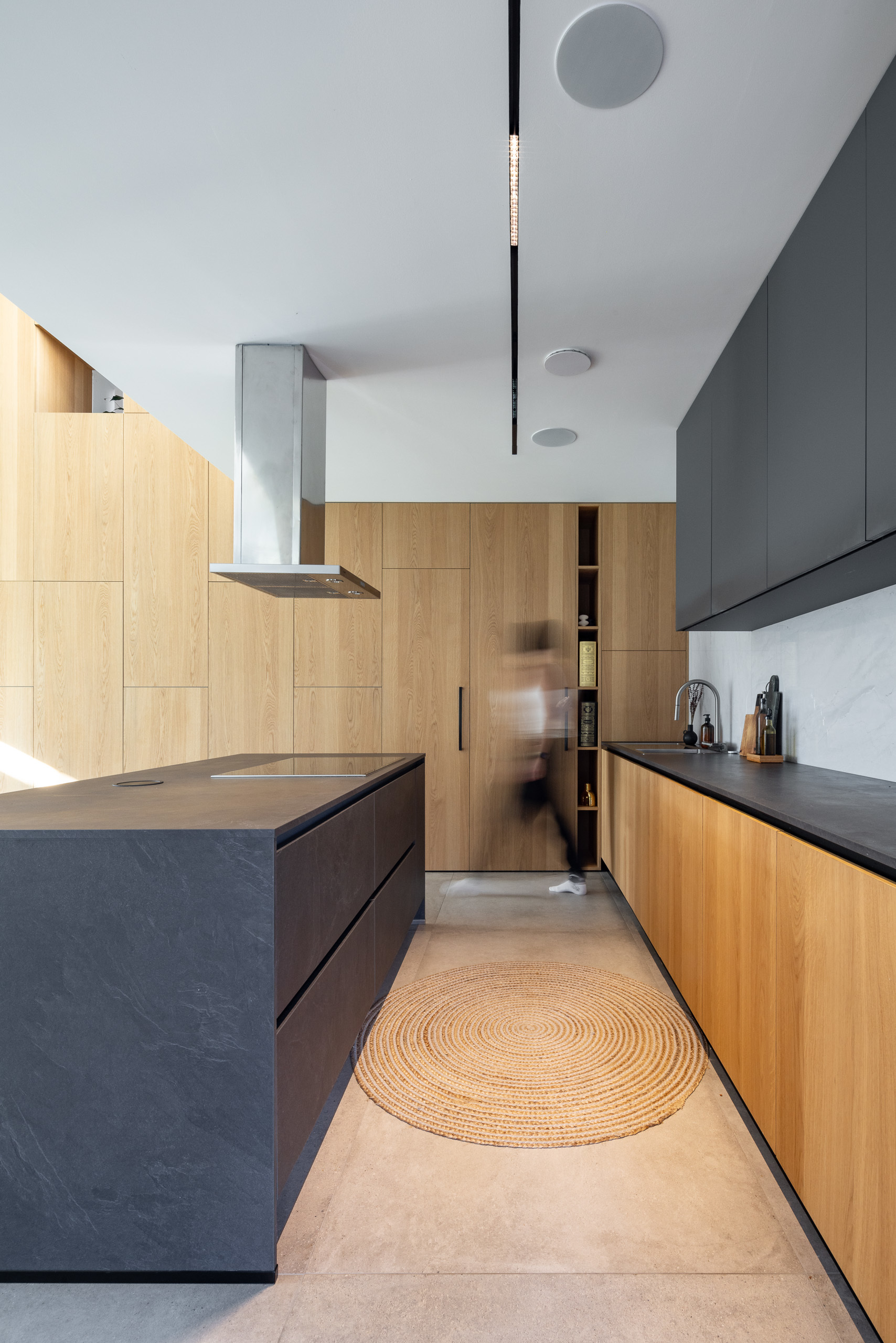 Prevládajúce monochromatické plochy v interiéri sa striedajú s akcentujúcimi štruktúrovanými materálmi v podobe prírodnej dyhy, veľkoformátového obkladu, alebo morenej čiernej dyhy. Zábradlie na poschodí tvoria biele lamely, ktoré v časti galérie prechádzahjú do skleného zábradlia.