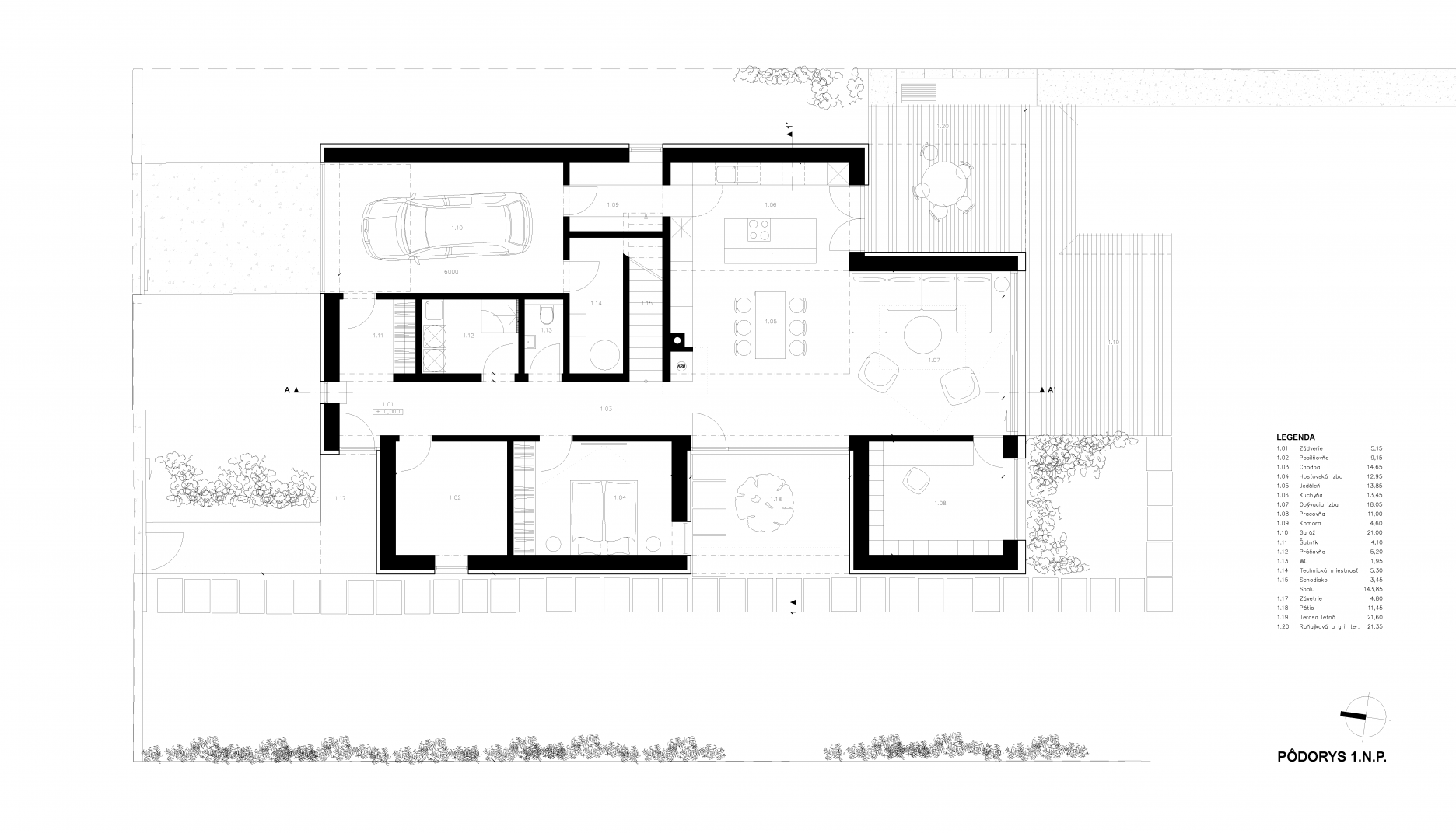 Na prízemí sa nachádza vstupná hala prepojená s garážou. Od vstupnej haly do dennej časti vedie chodba, ktorá sprístupňuje hygienické zázemie, pracovňu a hosťovskú izbu. Dennú zónu tvorí kontinuálny priestor kuchyne, jedálne a obývacej izby a “s tajnou” pracovňou ukrytou za televíznou stenou. Dominantným prvkom dennej časti je galéria na poschodí, presvetlená cez rozmerné okno. Podporená je vsadeným vertikálnym dreveným prvkom, ktorý prechádza cez dve podlažia a oddeľuje schodisko od jedálne a kuchyne. Drevená hmota na prvom podlaží poskytuje dostatok úložného priestoru, je v nej osadený krb, vstavaná chladnička a dvere do komory. Nábytkový blok odľahčujú perforácie, ktoré otvárajú priehľady do priestoru schodiska.