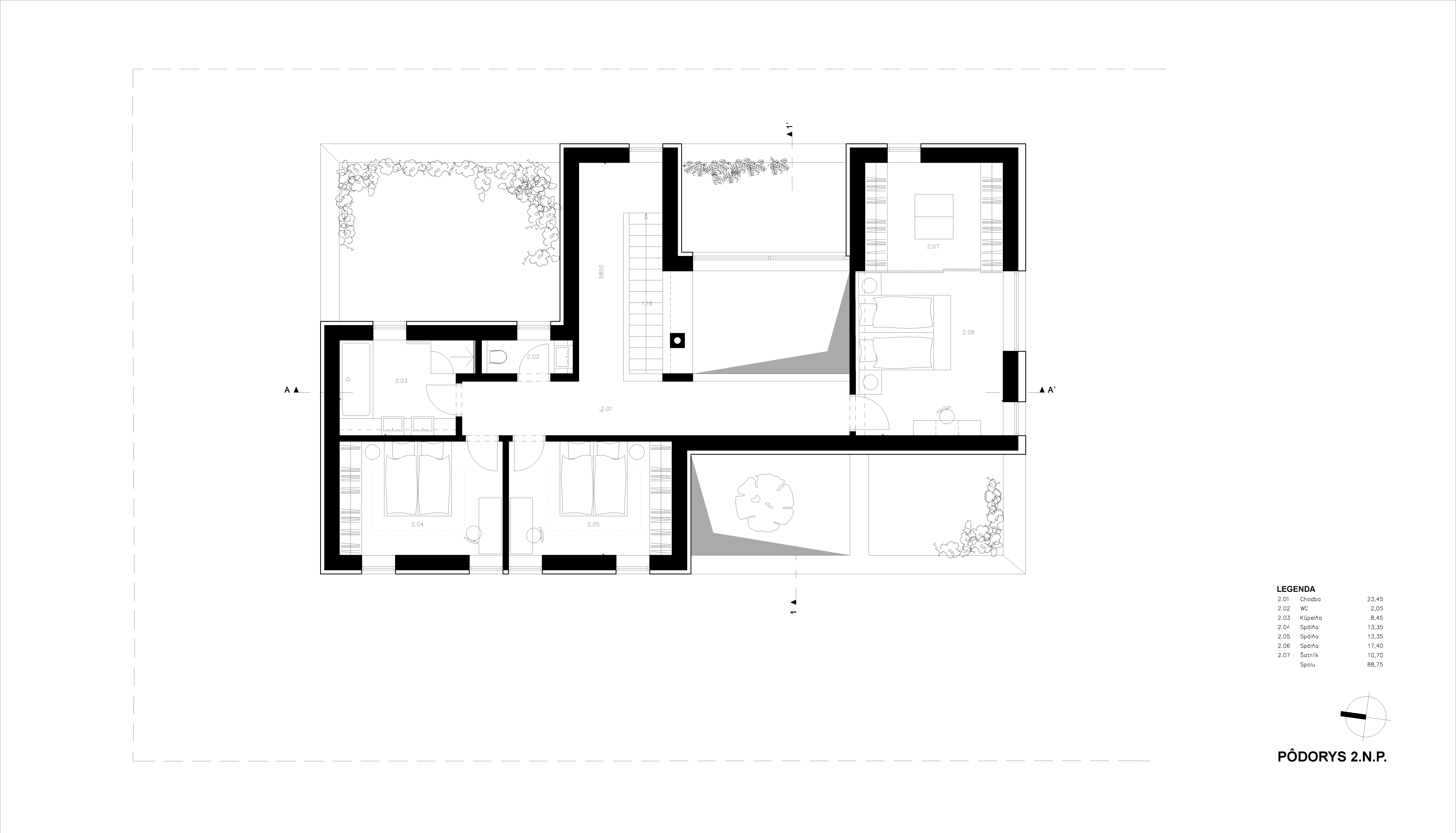 Na poschodí sa nachádzajú dve detské izby, spálňa so šatníkom a prislúchajúce hygienické zázemie. Z izieb na podlaží sú prístupné zelené strechy.