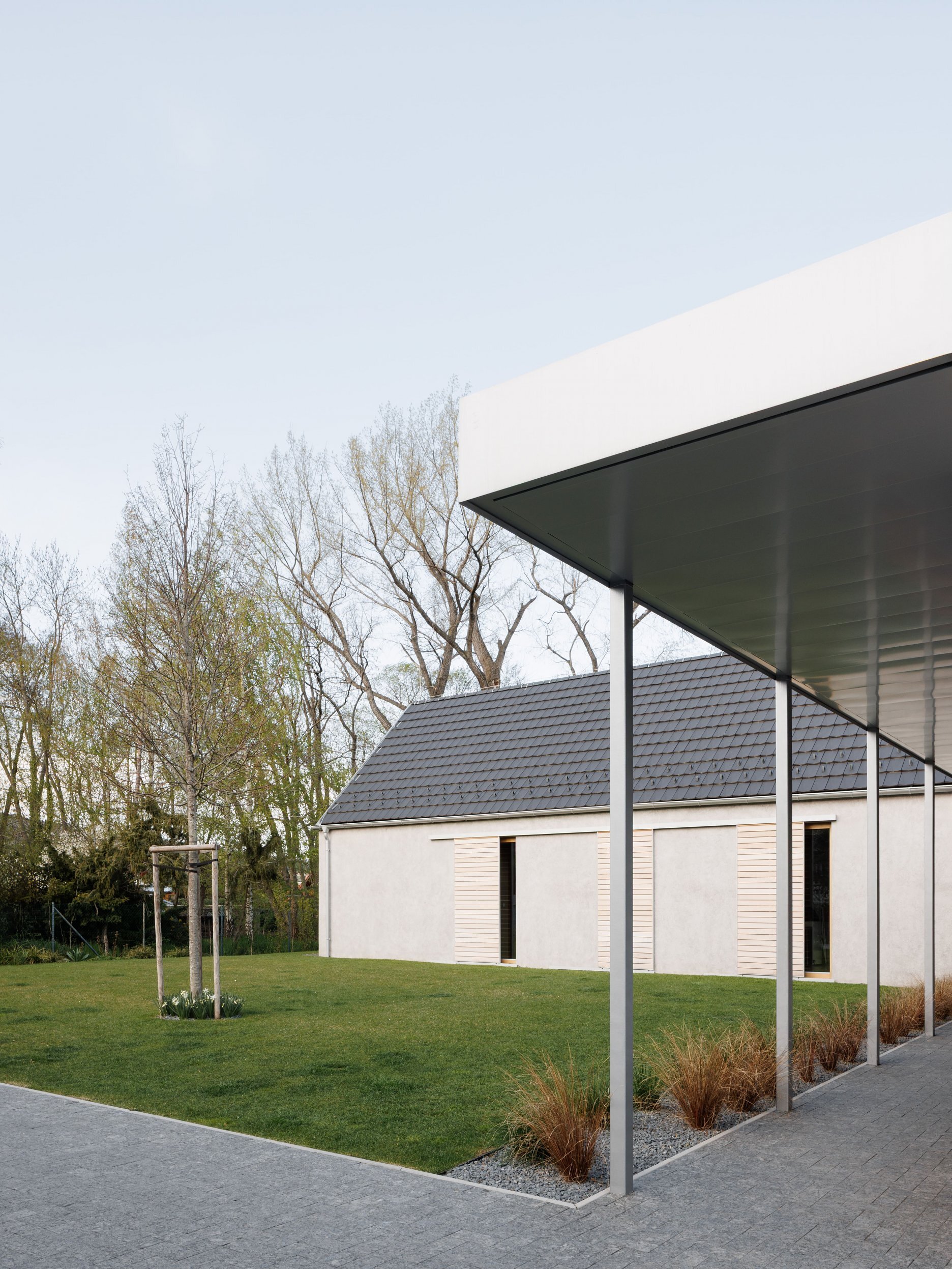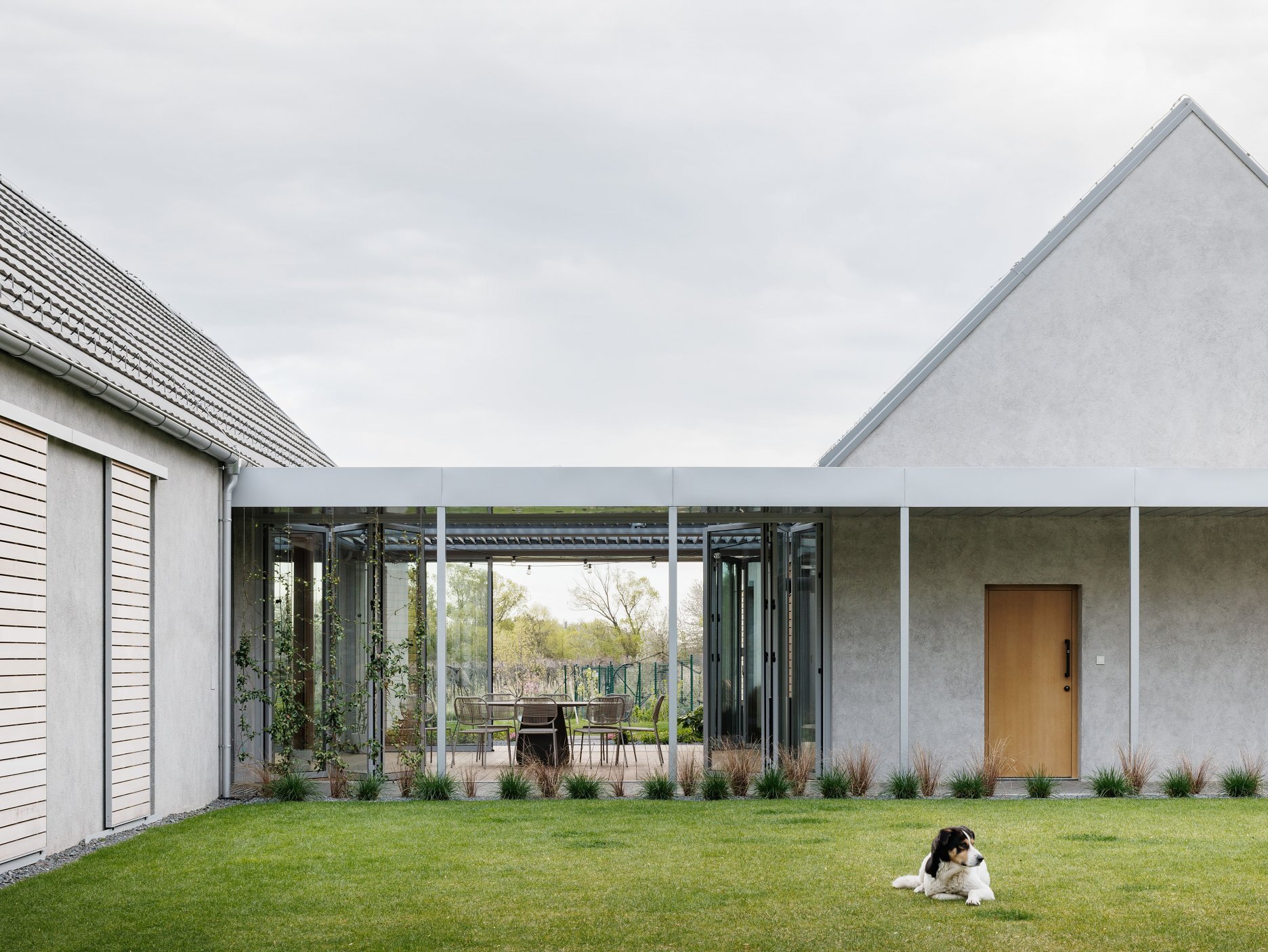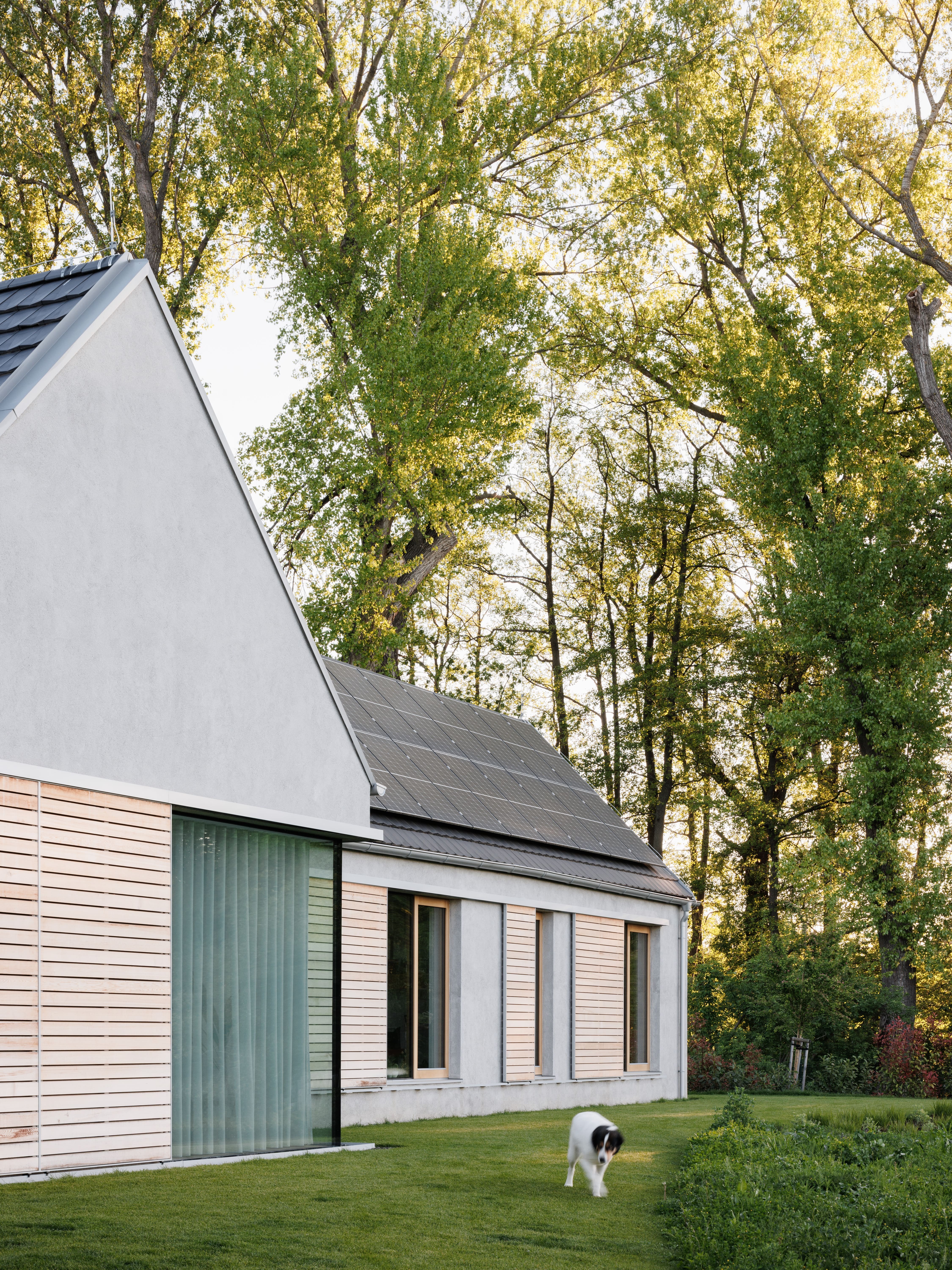 Pri výbere materiálov sme hľadali prirodzené riešenie, ktoré v tomto prostredí bude pôsobiť, akoby tu bolo odjakživa. Gánok, klasická škridla, šúchaná hrubozrnná omietka a posuvné drevené okenice dodávajú domu vidiecky ráz.