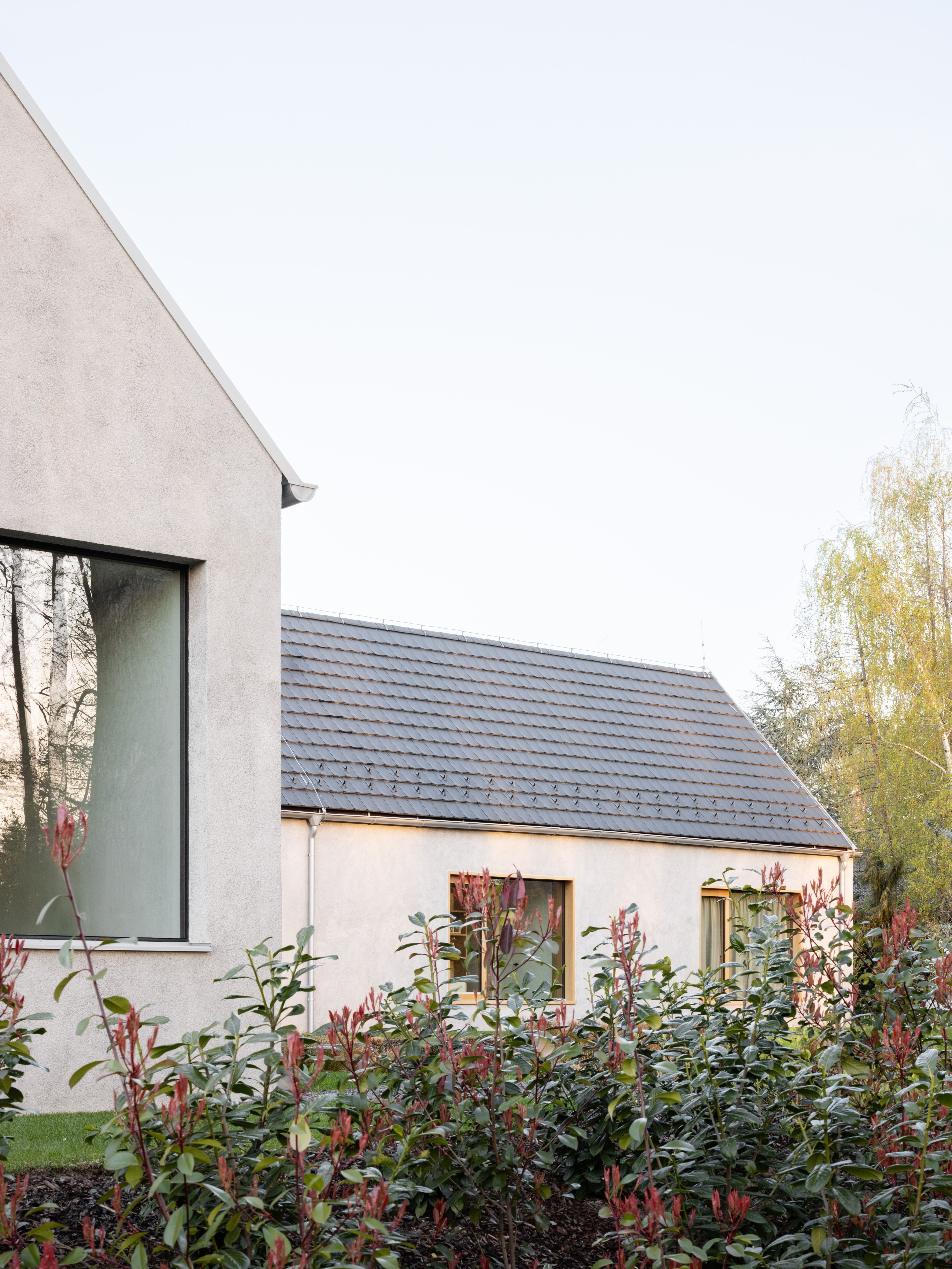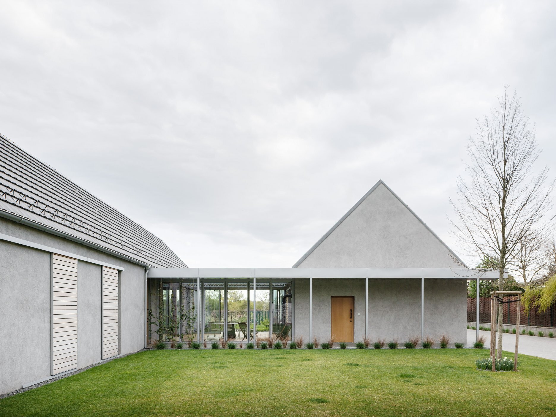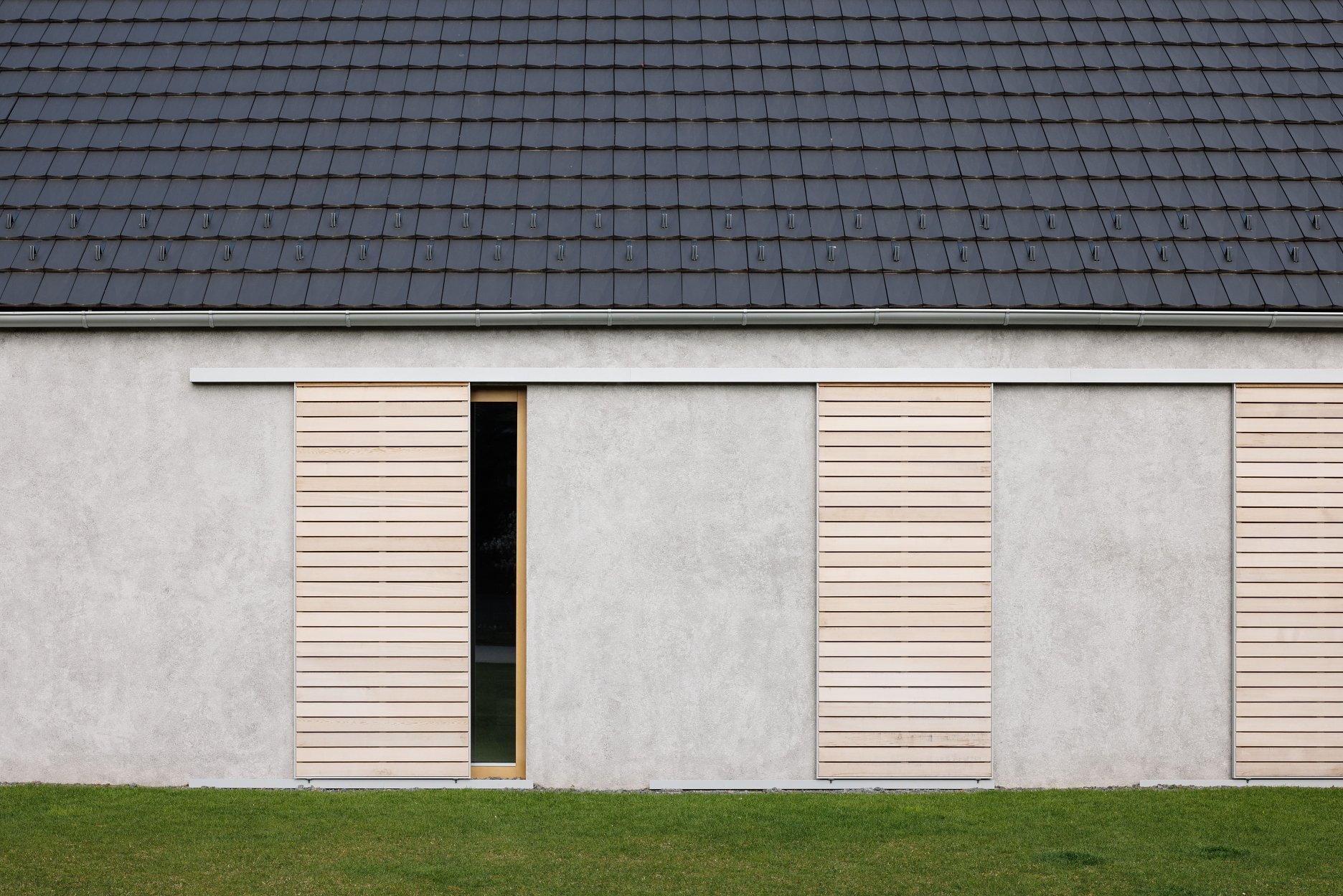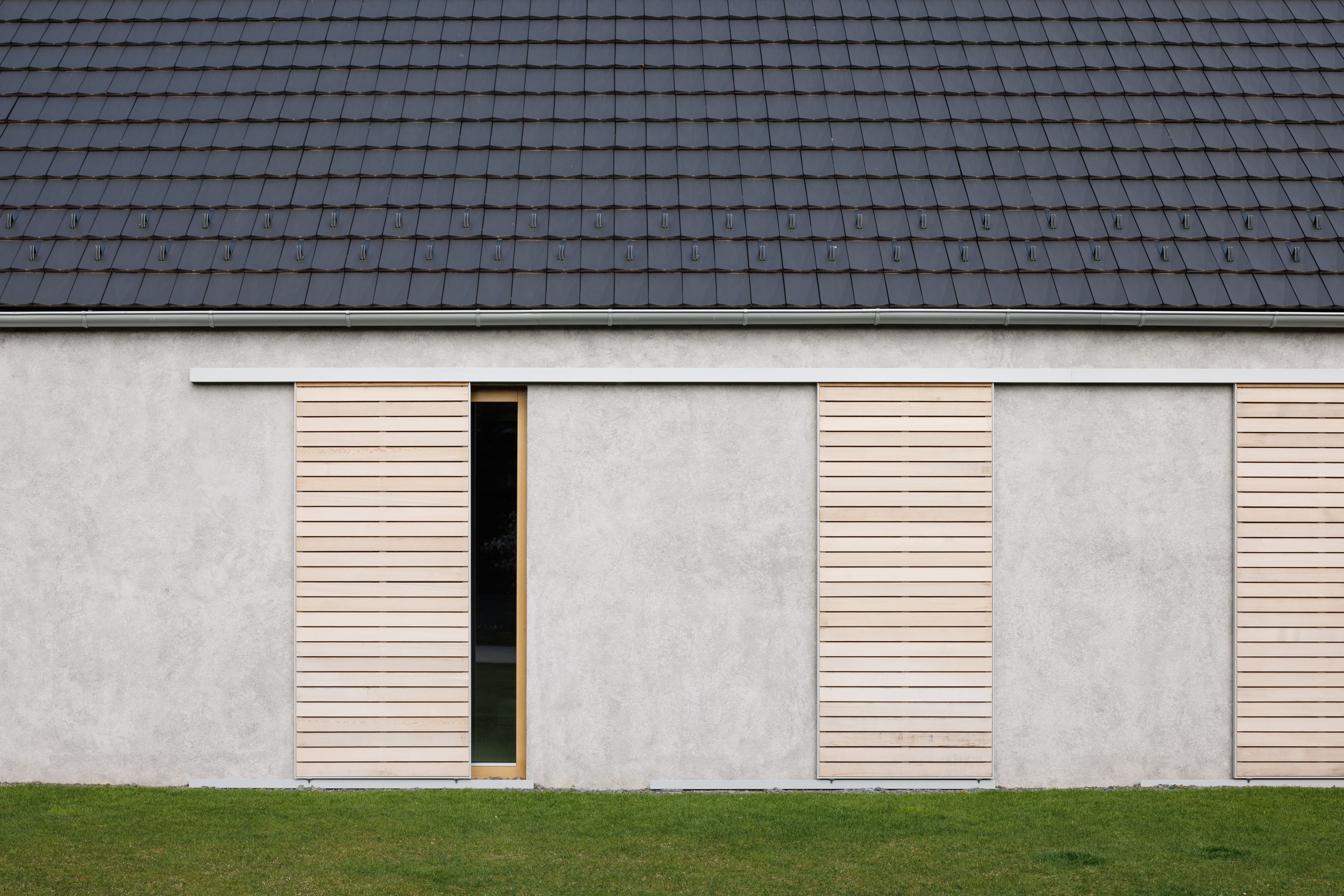 Pri výbere materiálov sme hľadali prirodzené riešenie, ktoré v tomto prostredí bude pôsobiť, akoby tu bolo odjakživa. Gánok, klasická škridla, šúchaná hrubozrnná omietka a posuvné drevené okenice dodávajú domu vidiecky ráz.