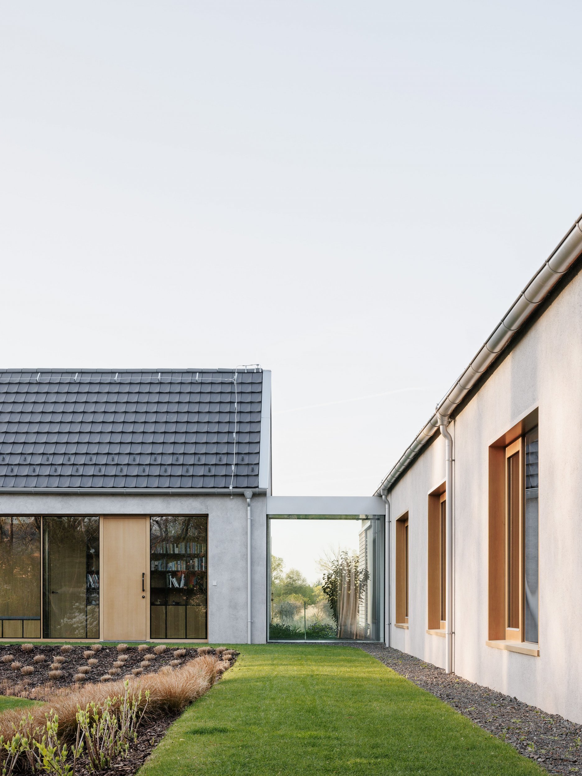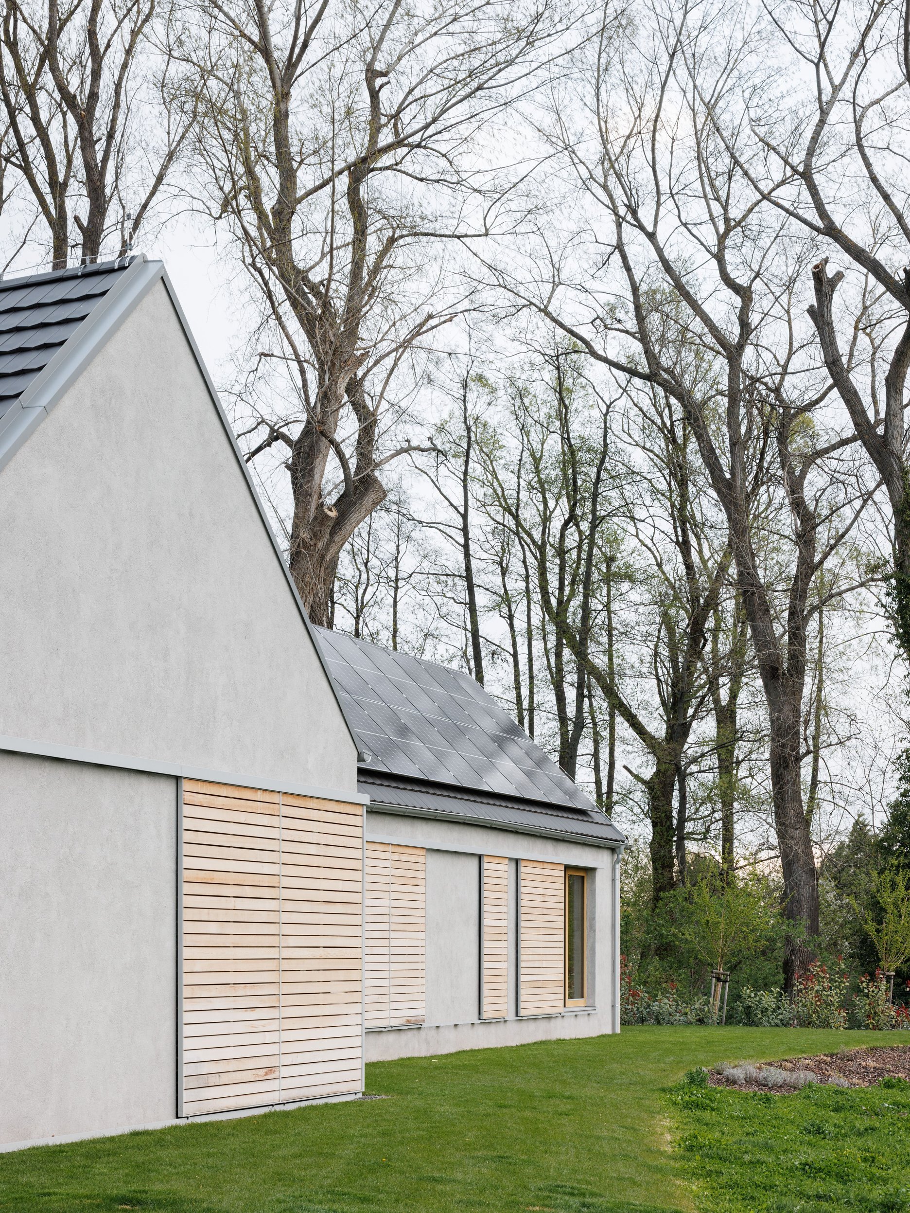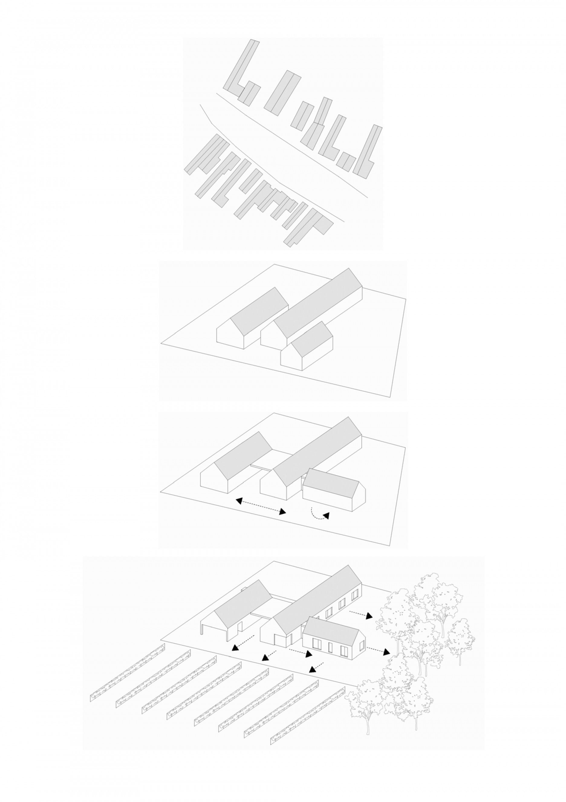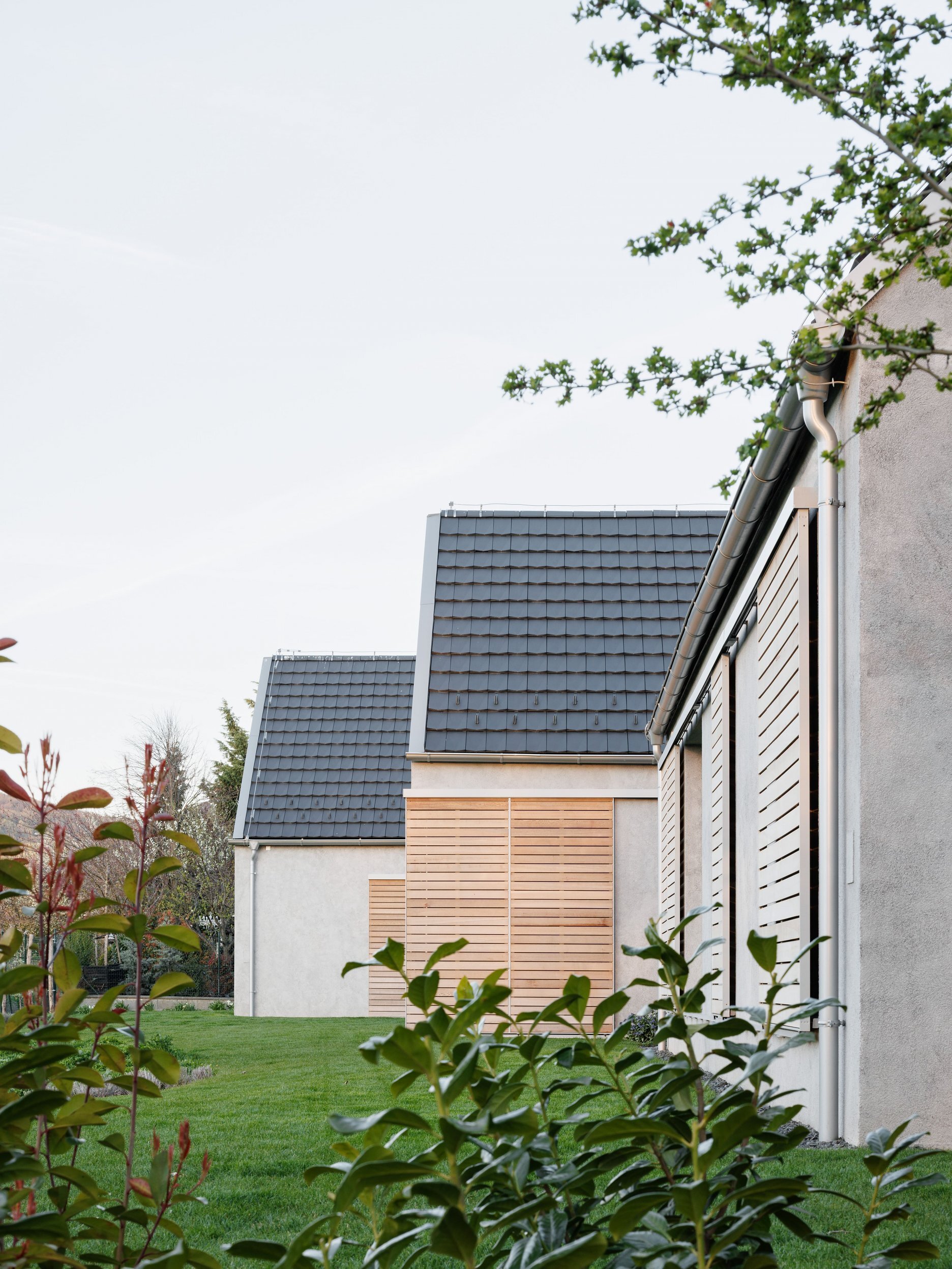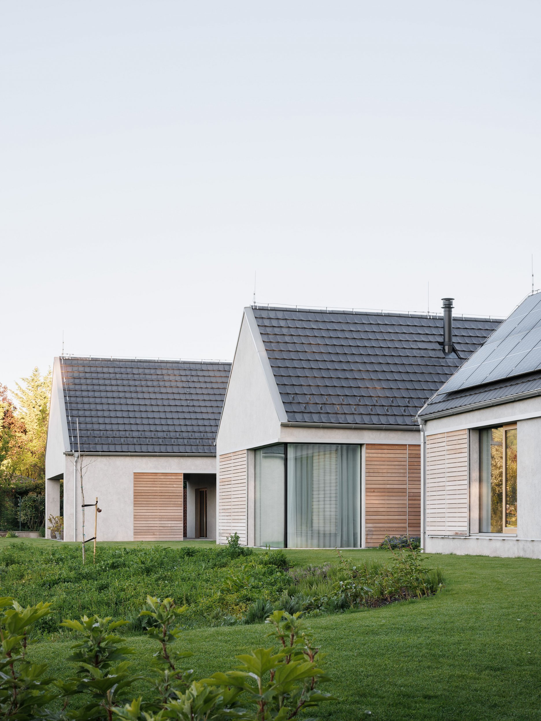 Tri pozdĺžne domy sme na pozemku rozohrali tak, aby sa výhľadmi otvárali do krásneho okolia. Kompozícia tak vytvára záhradné priestory s rôznymi atmosférami: južnú záhradu, ktorá je orientovaná do vinohradu, východnú záhradu s ranným slnkom a výhľadom na les a vstupný dvor s gánkom a krytou terasou. Dom rodičov, dom detí a hospodársky dom dnes tvoria jeden celok a slúžia jednej rodine, neskôr sa však môžu adaptovať na novú životnú situáciu a fungovať samostatne.