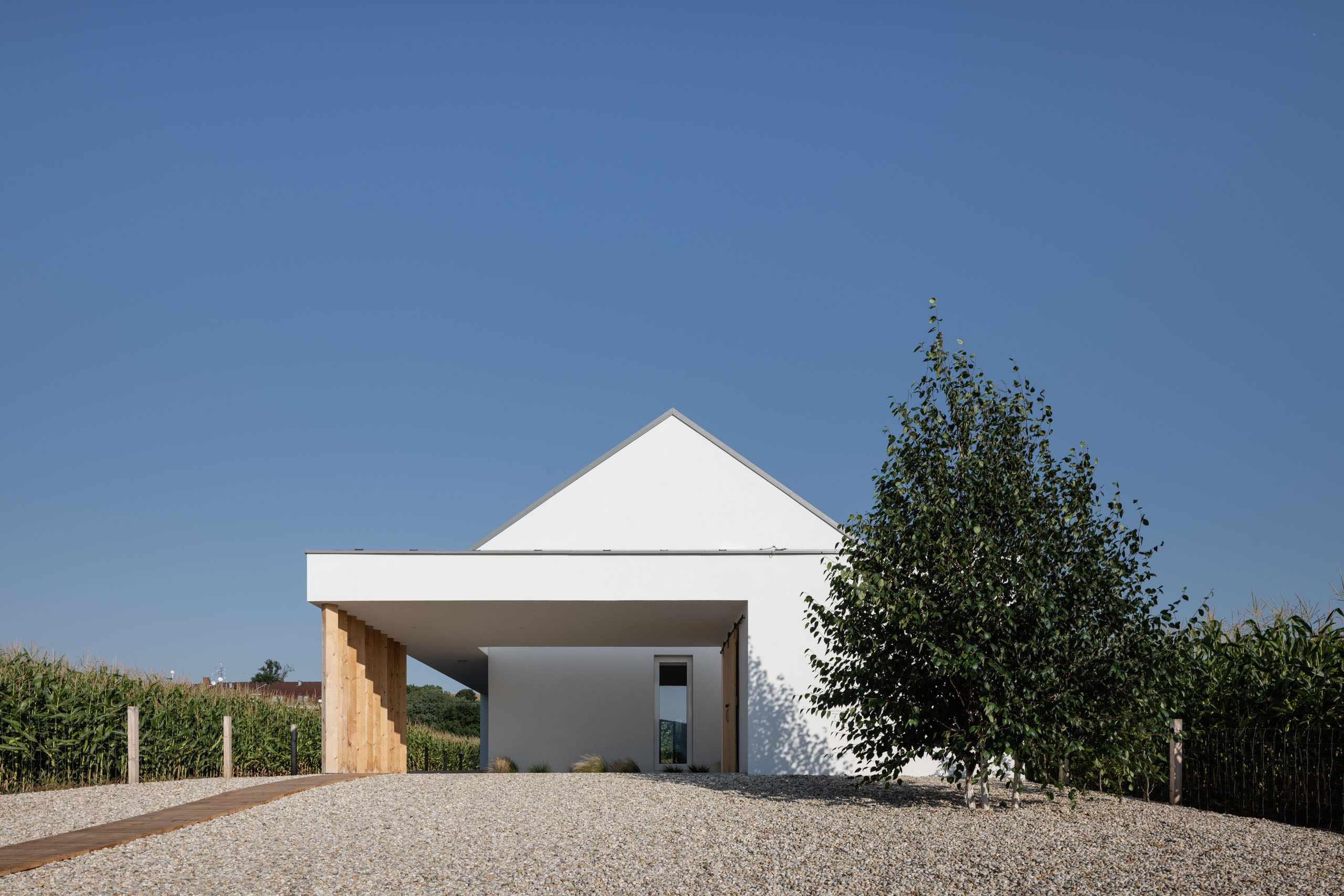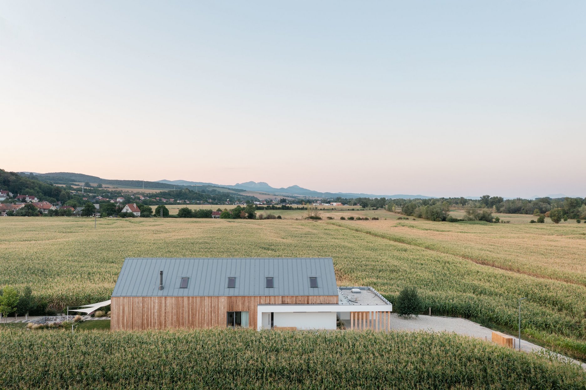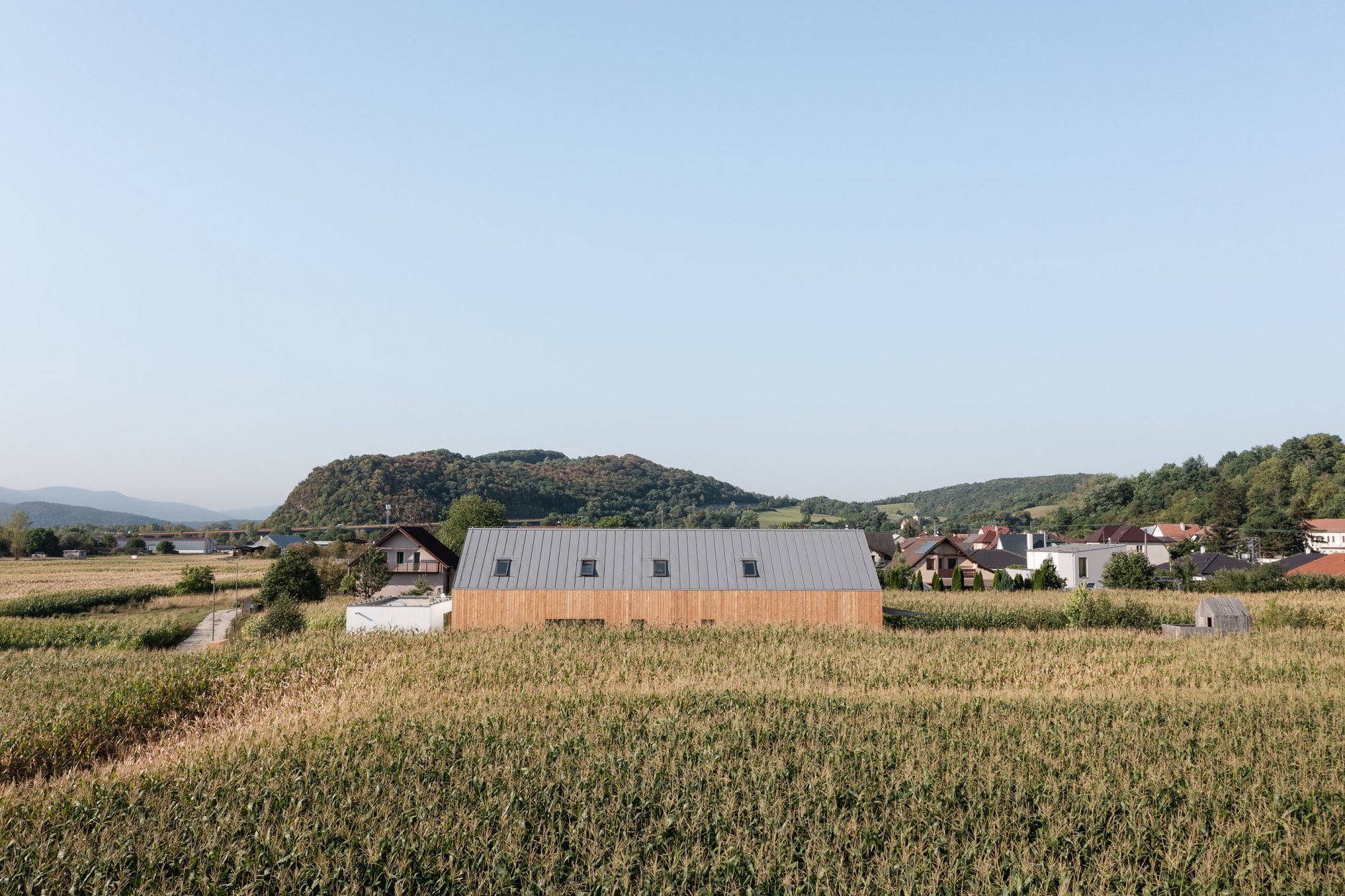 Stavba stojí na konci slepej ulice, v obklopení rozsiahlych polí. Základnú hmotu so sedlovou strechou dopĺňajú samostatne stojace skladové priestory a garážové státie, prepojené so vstupom suchou nohou.