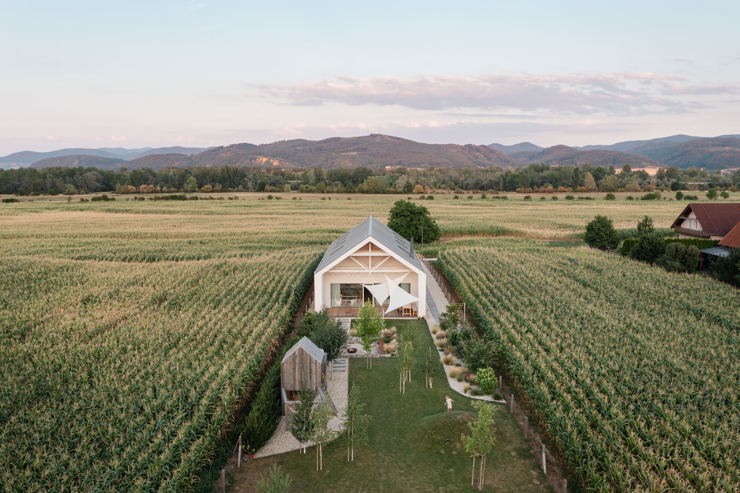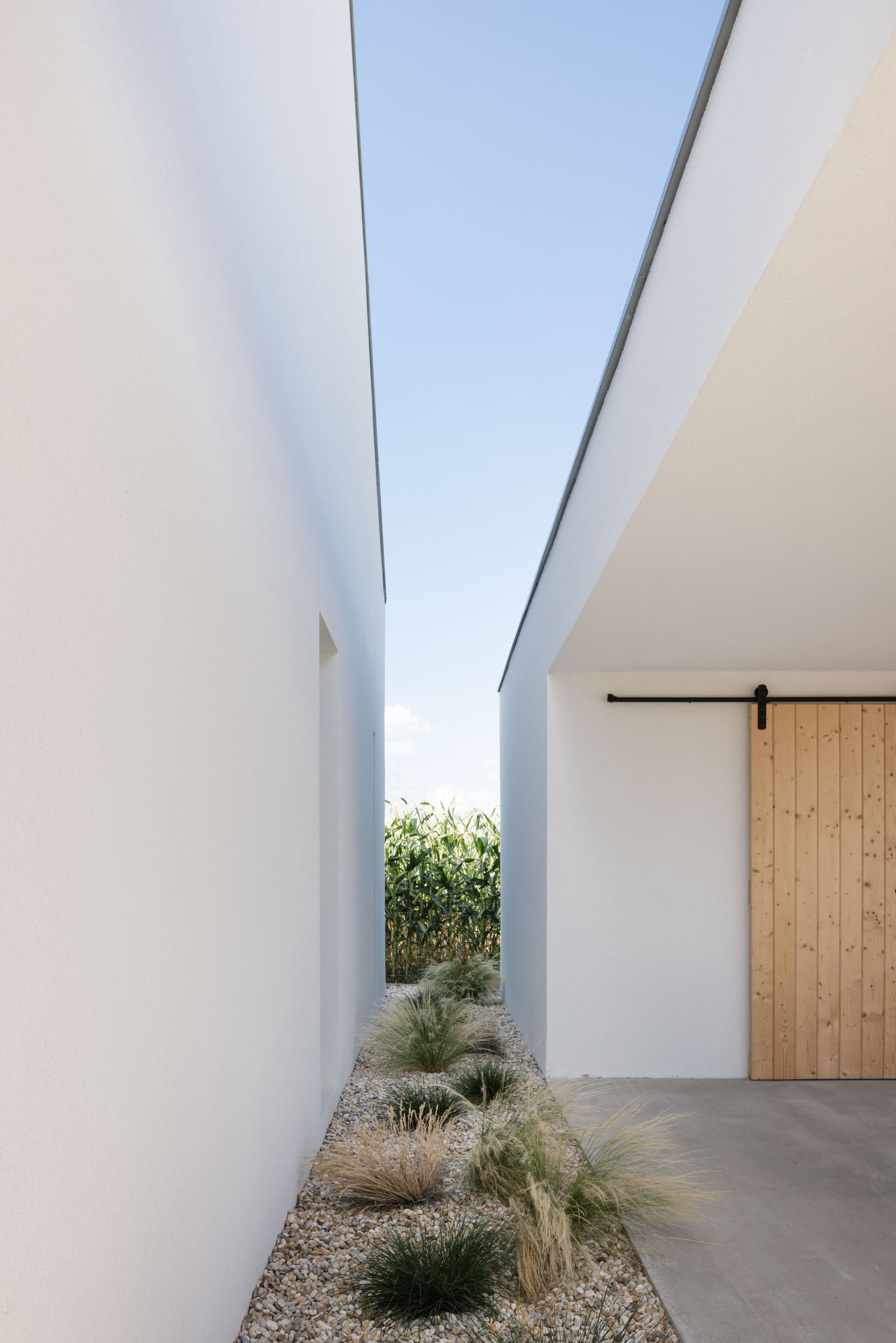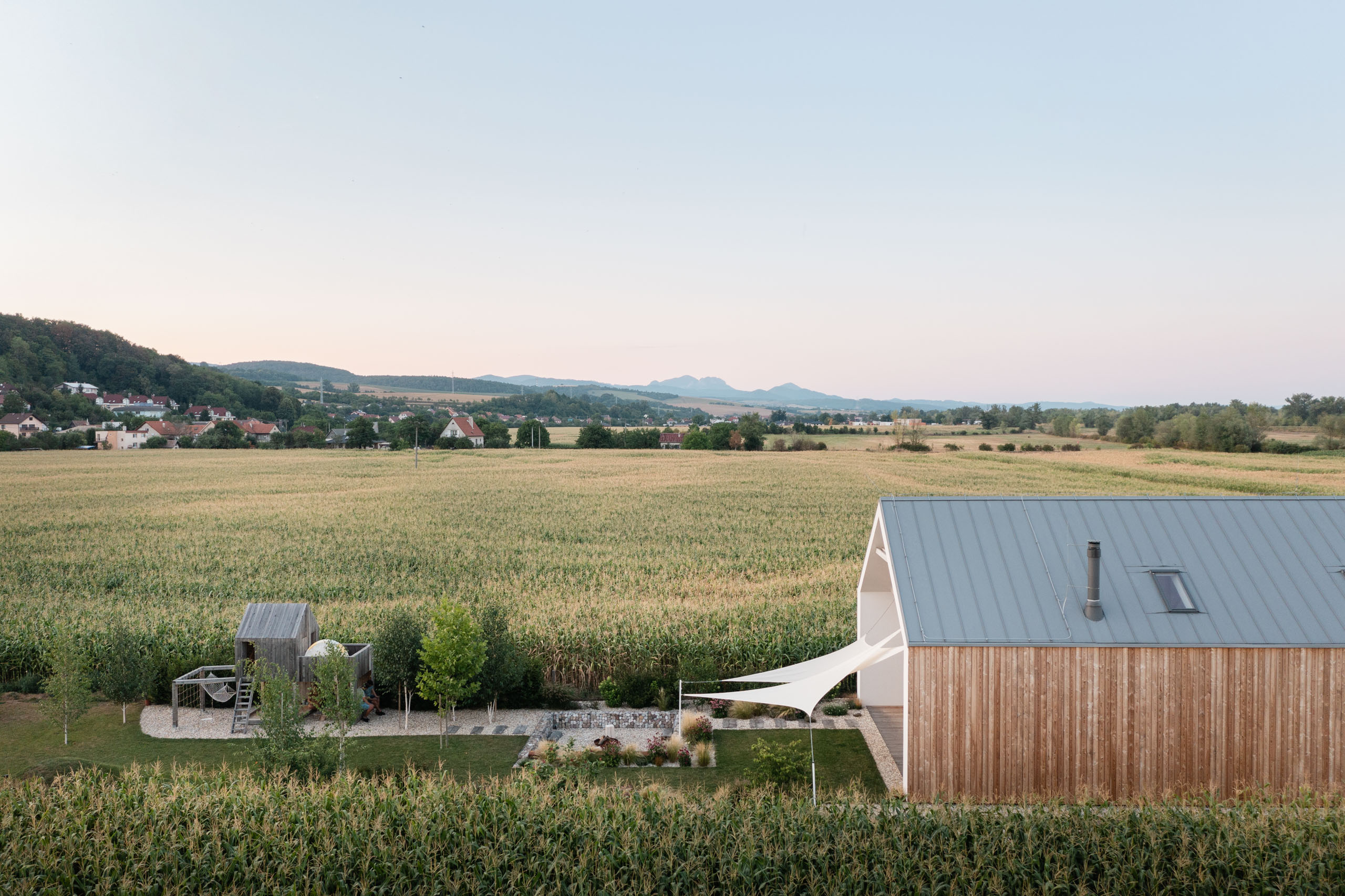 Stavba stojí na konci slepej ulice, v obklopení rozsiahlych polí. Základnú hmotu so sedlovou strechou dopĺňajú samostatne stojace skladové priestory a garážové státie, prepojené so vstupom suchou nohou.