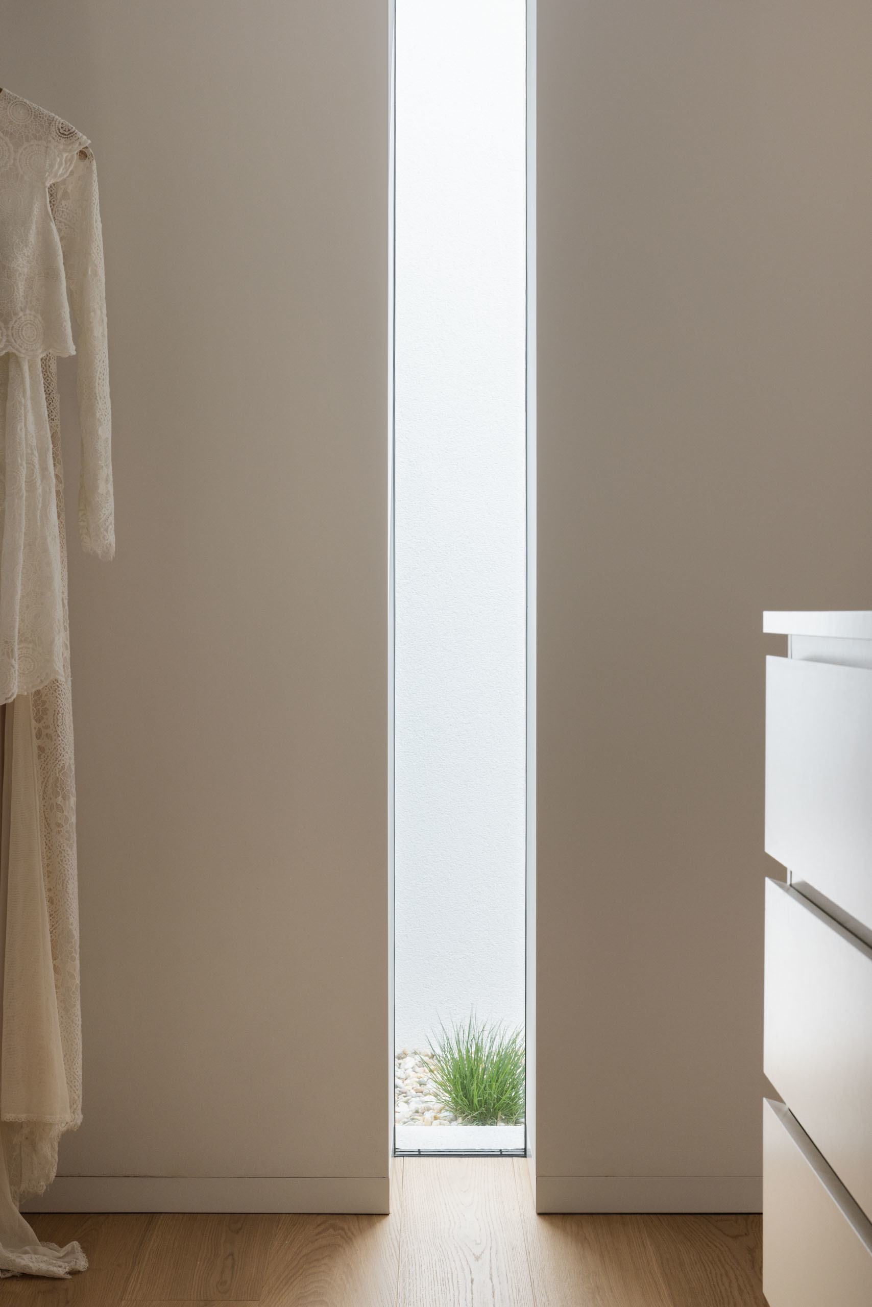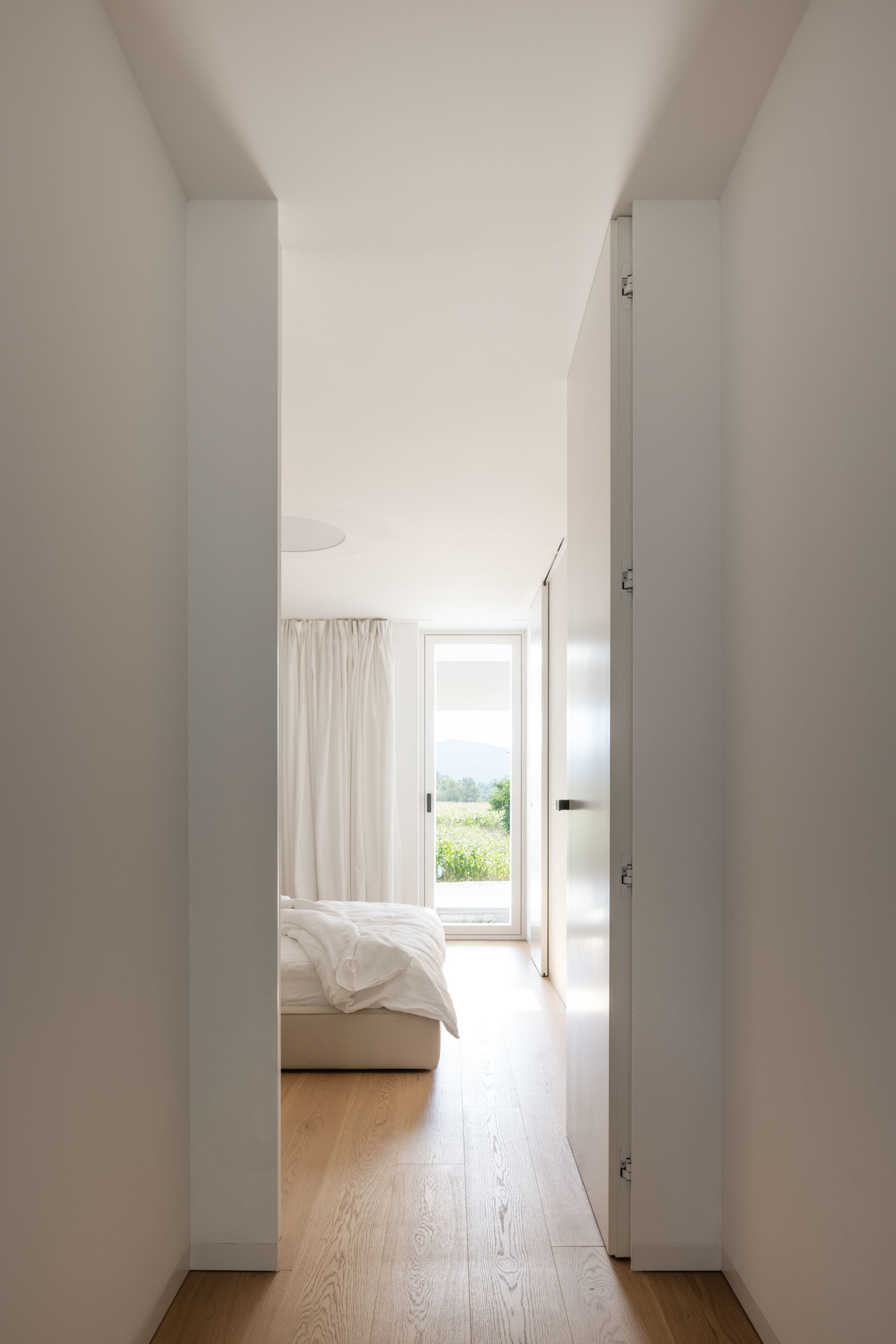 Do domu sa vstupuje z krytého závetria, prebiehajúceho pozdĺž juhovýchodnej fasády. Zádverie sprístupňuje technologický blok a vedie do hlavnej chodby na prízemí. Priamo oproti vstupnej časti je situovaná pracovňa, samostatné WC a vedľa kúpeľňa pre deti. Spálňu s vlastnou kúpeľňou a šatníkom situovali architekti v severovýchodnej časti pôdorysu.