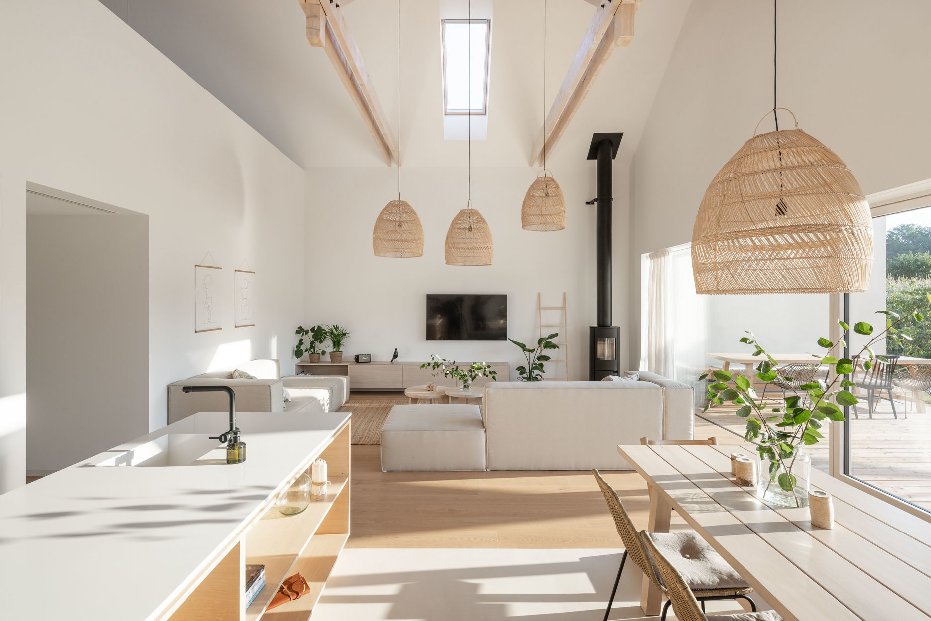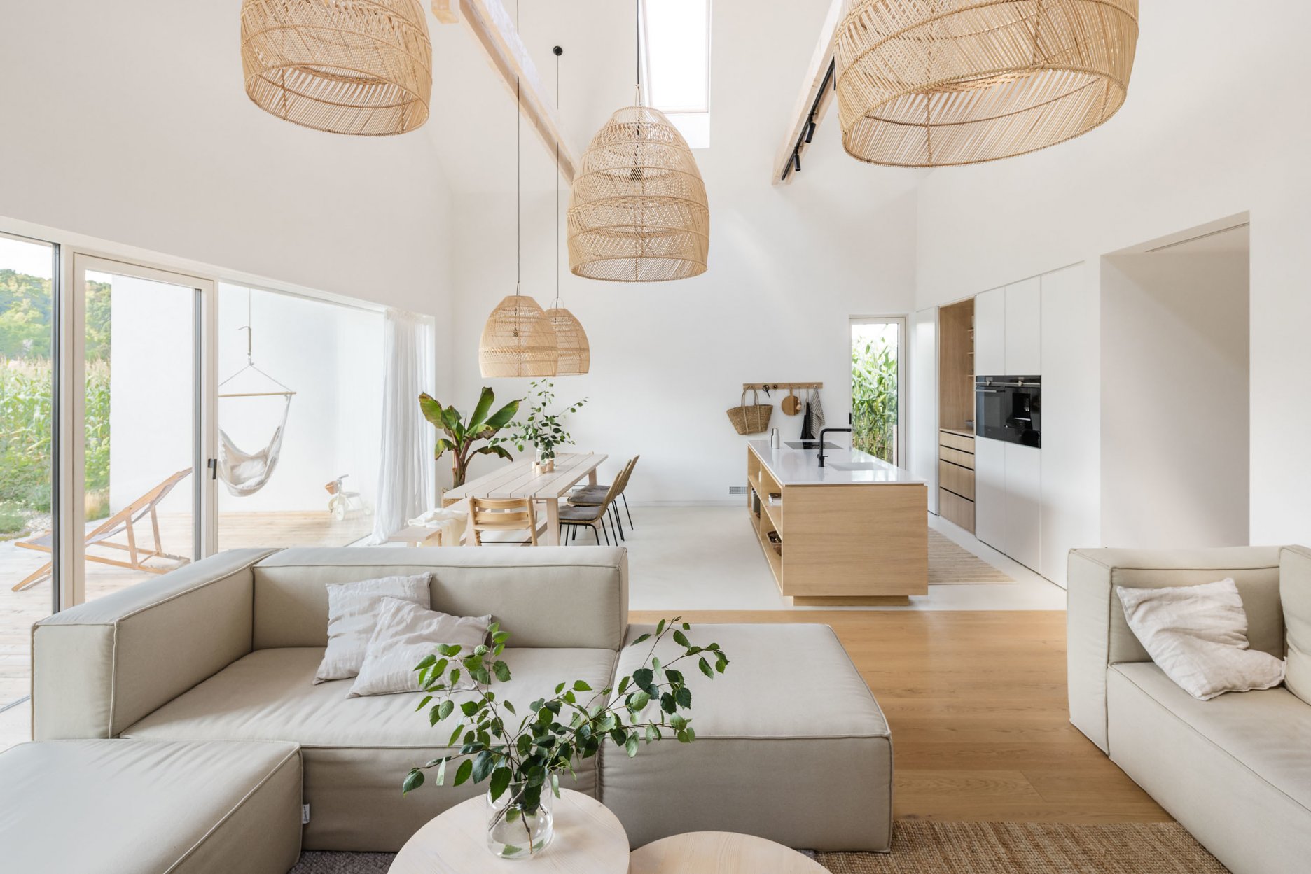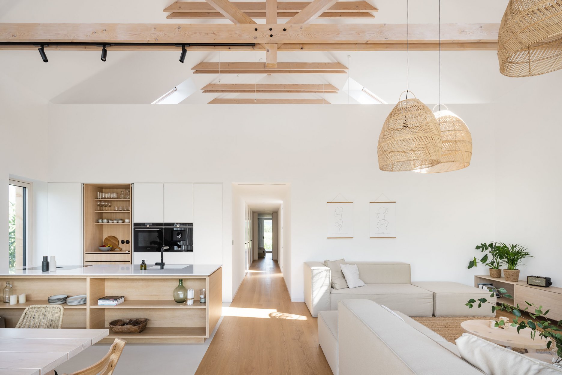 Interiér charakterizuje kombinácia dreva, bielej omietky a prírodných materiálov. Kompozíciu dopĺňajú čierne akcenty detailov.