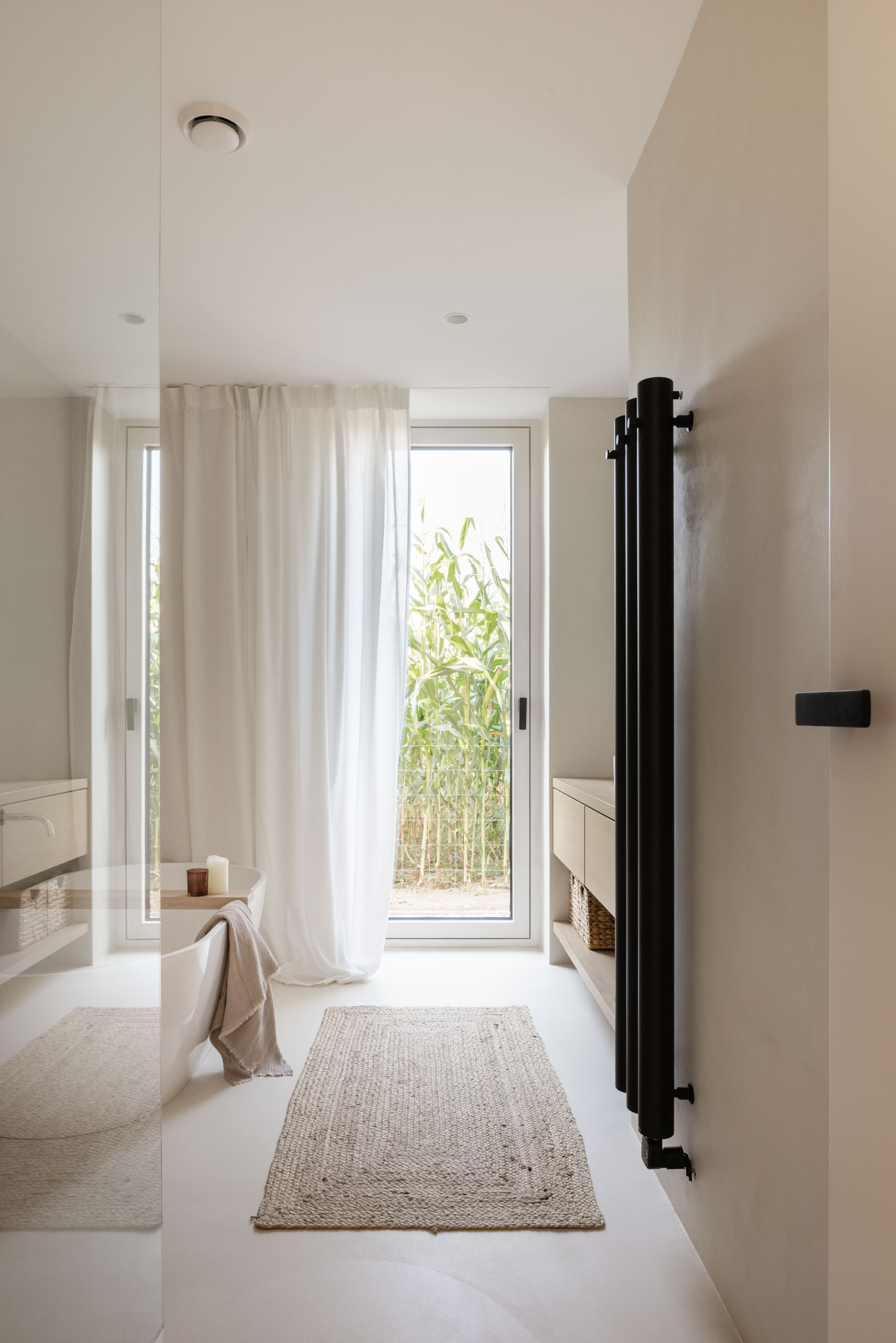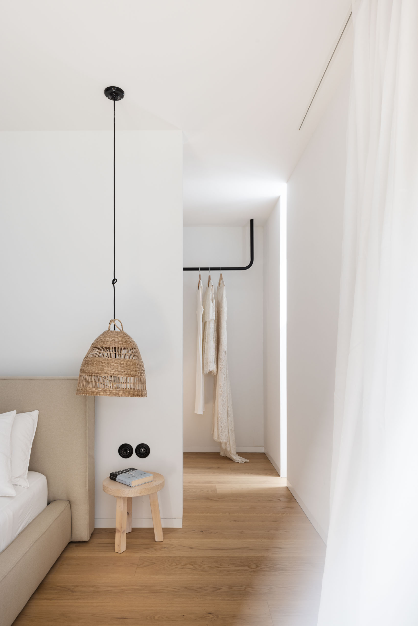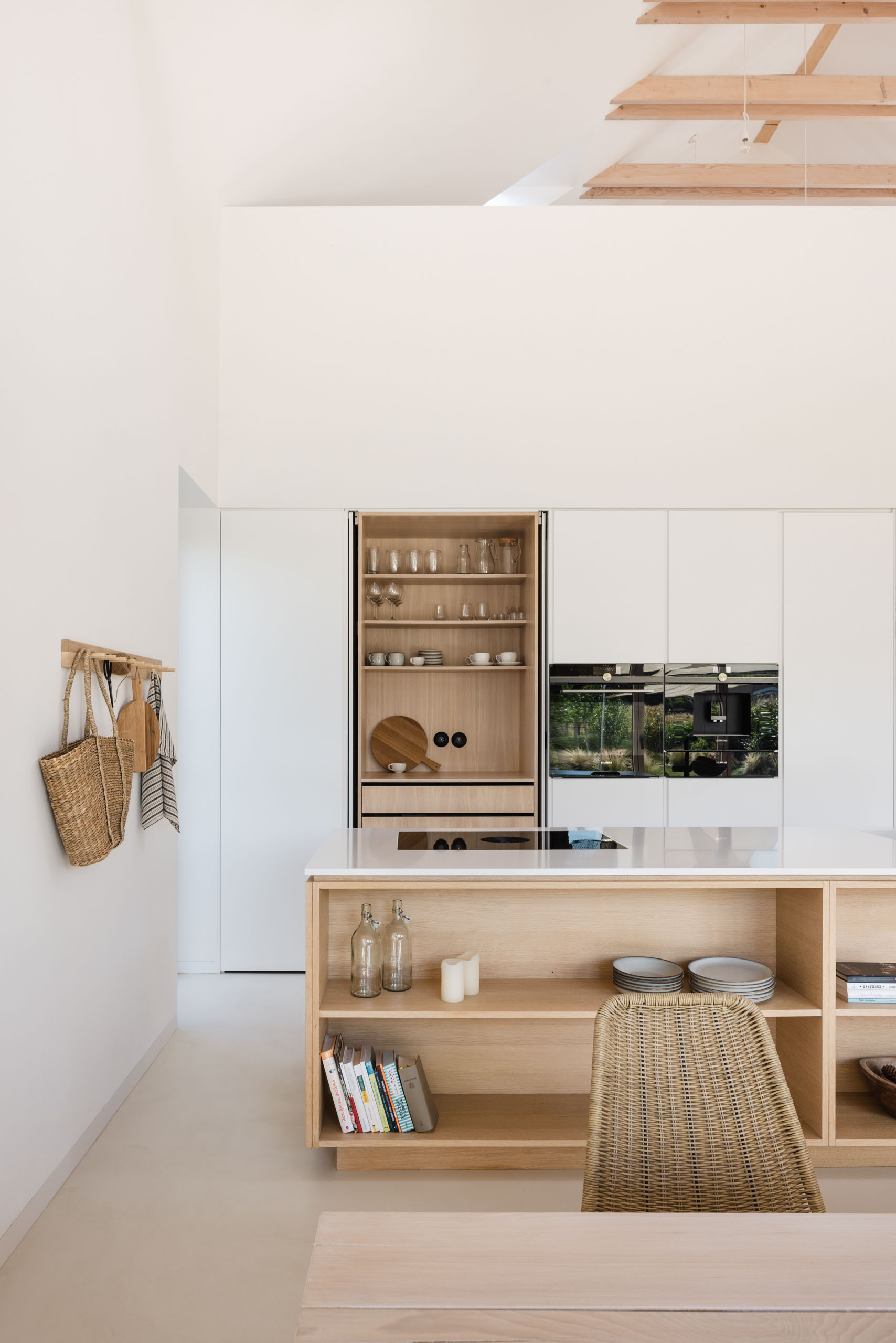 Interiér charakterizuje kombinácia dreva, bielej omietky a prírodných materiálov. Kompozíciu dopĺňajú čierne akcenty detailov.