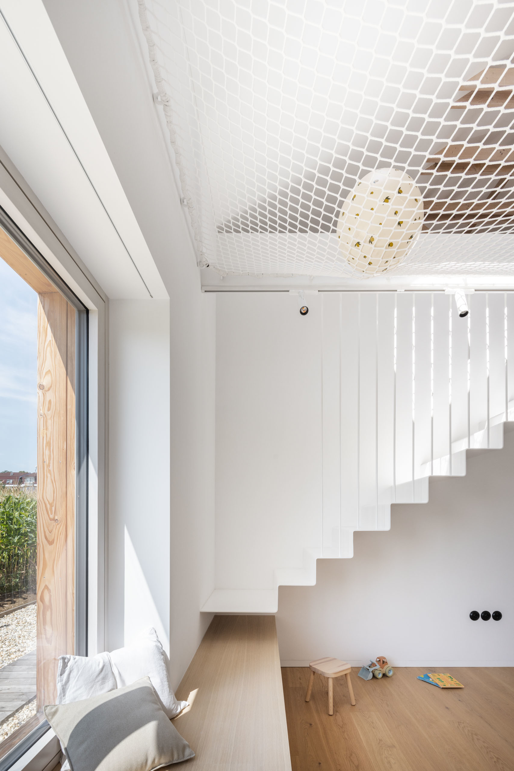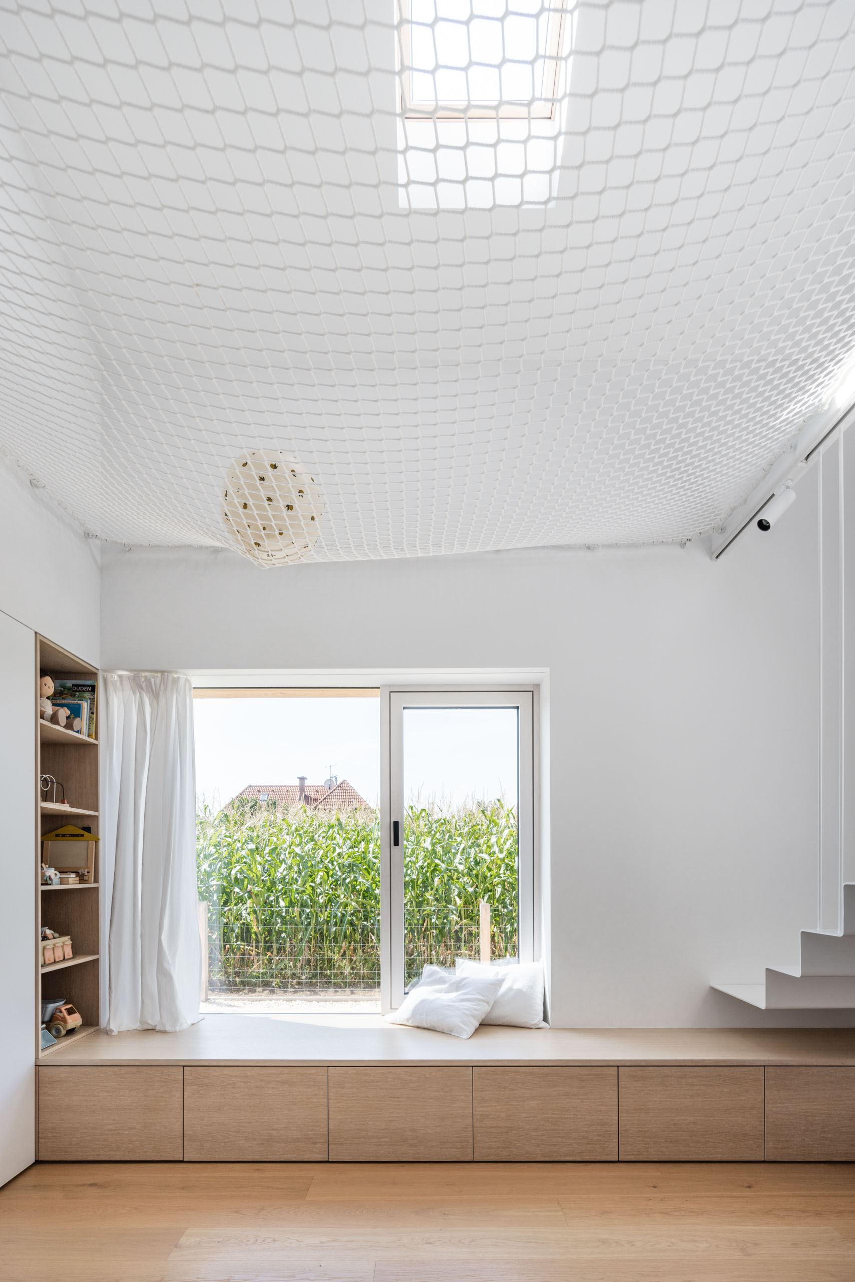 Do podkrovia vedie jednoramenné schodisko, prístupné z detskej izby, ktorej strop je otvorený a vyplnený pochôdznou sieťou. Tá rozširuje pobytovú plochu, pričom zachováva prepojenie zón detskej izby. Na poschodí sa nachádza galéria a samostatná izba - spacia časť pre deti.