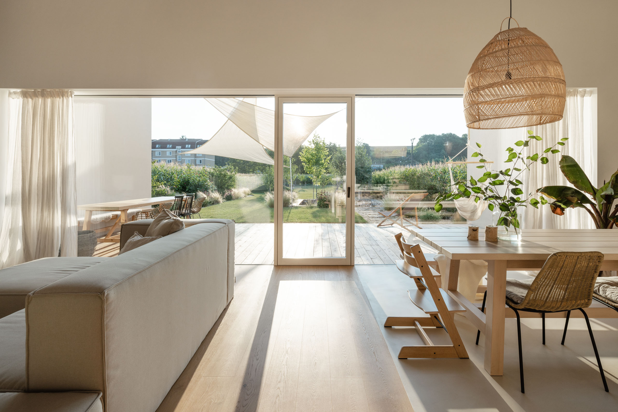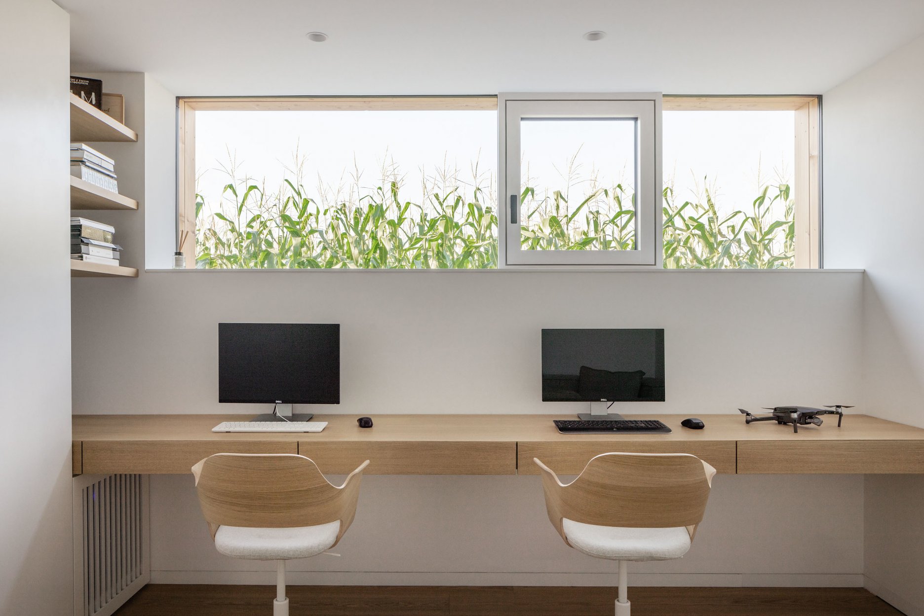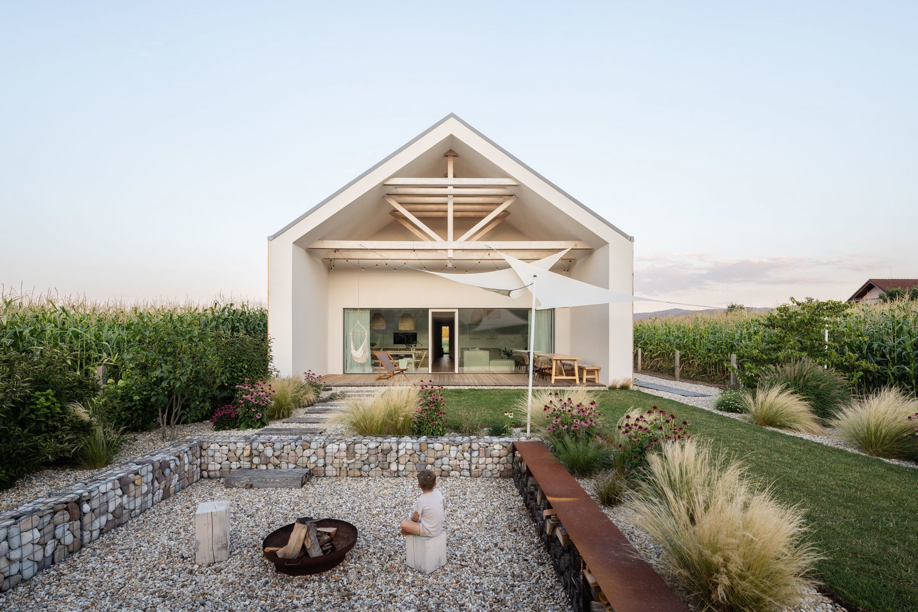 Denná zóna domu je otvorená cez dve podlažia až do krovu sedlovej strechy s priznanou konštrukciou. Presklenie, v takmer celej šírke štítovej steny, prepája obývačku, jedáleň a kuchyňu s rozsiahlou krytou terasou. Priestory na prízemí a poschodí prepája otvorená galéria.