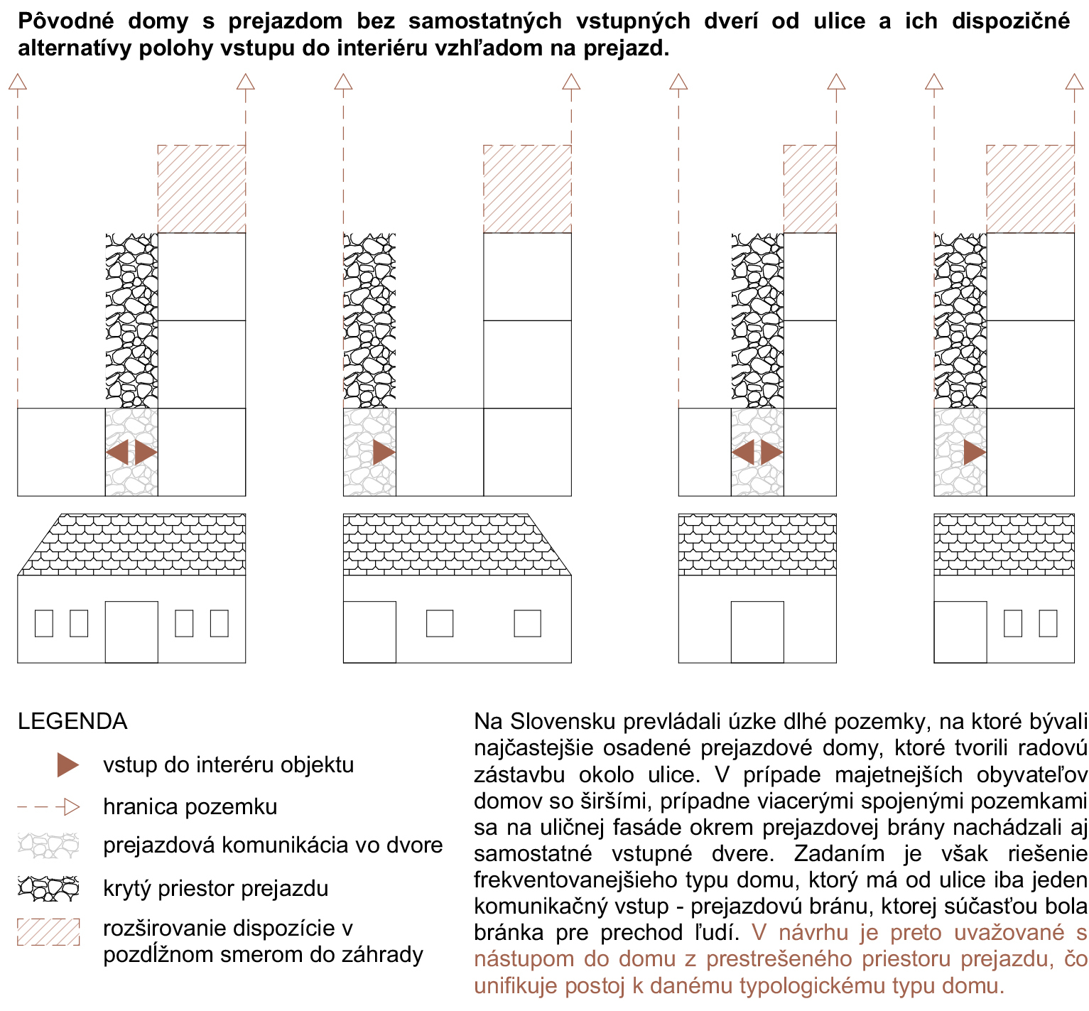 Na Slovensku v minulosti prevládali úzke dlhé pozemky, na ktoré bývali najčastejšie osadené práve prejazdové domy, ktoré tvorili radovú zástavbu okolo ulice. V prípade majetnejších obyvateľov domov so širšími, prípadne viacerými spojenými pozemkami sa na uličnej fasáde okrem prejazdovej brány nachádzali aj samostatné vstupné dvere. Zadaním je však riešenie frekventovanejšieho typu domu, ktorý má od ulice iba jeden komunikačný vstup - prejazdovú bránu, ktorej súčasťou bola bránka pre prechod ľudí. V návrhu je preto uvažované s nástupom do domu z prestrešeného priestoru prejazdu, čo unifikuje postoj k danému typologickému typu domu.