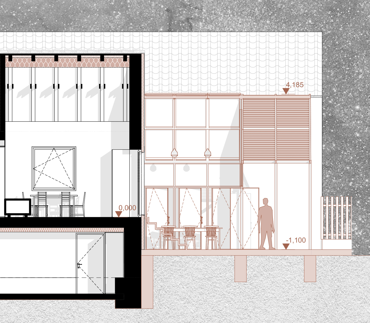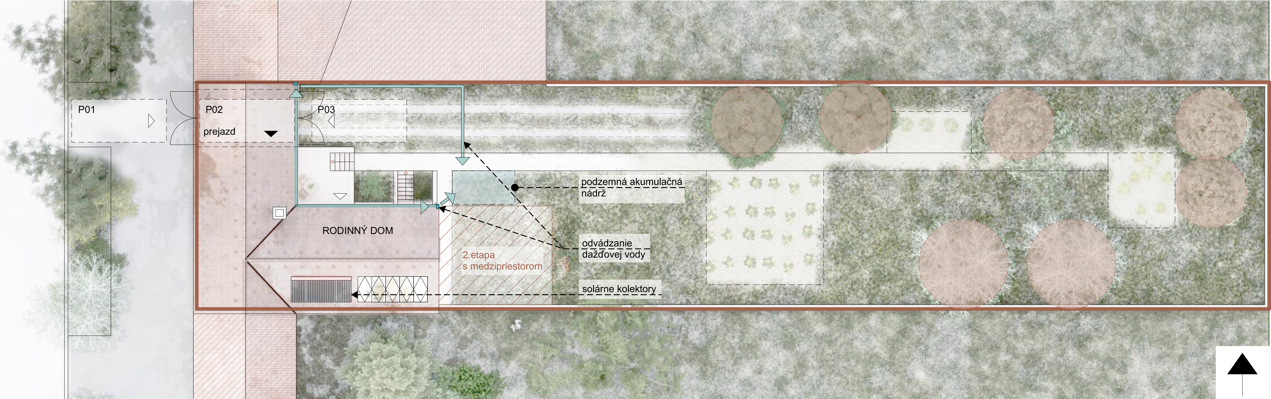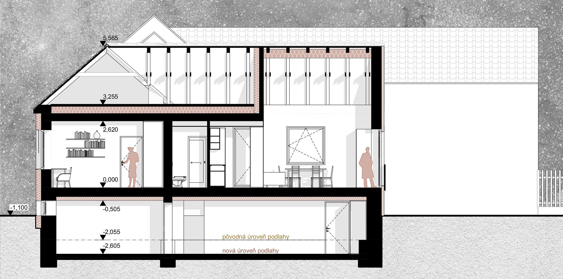 Okrem dispozičných a prevádzkových vzťahov je potrebné vyriešiť aj vyhovujúce napojenie exteriéru na existujúci suterén, nakoľko v pôvodnom stave existujúce schodisko nemá dostatočné dimenzie na manipulovanie s technológiou, ktorá je tam v návrhu umiestnená. Rovnako je nevyhovujúce aj pre užívateľa pri bežnej manipulácií a skladovaní potravín, záhradného nábytku a ostatných užívateľských potrieb.