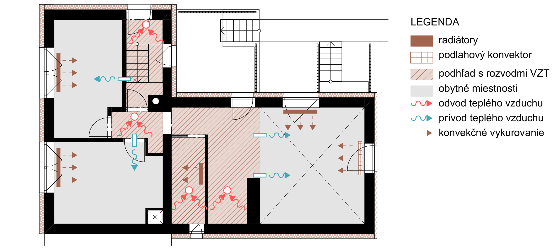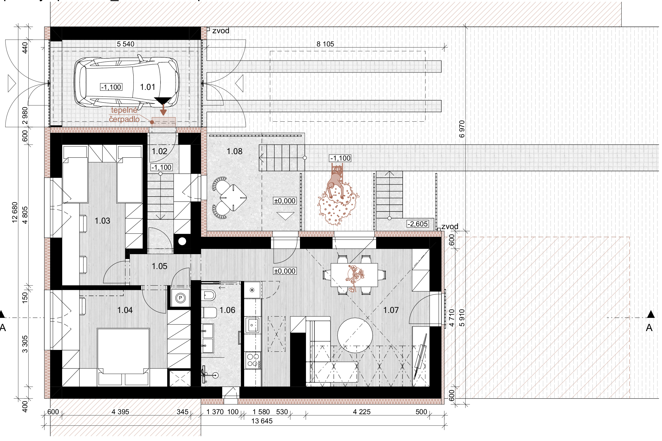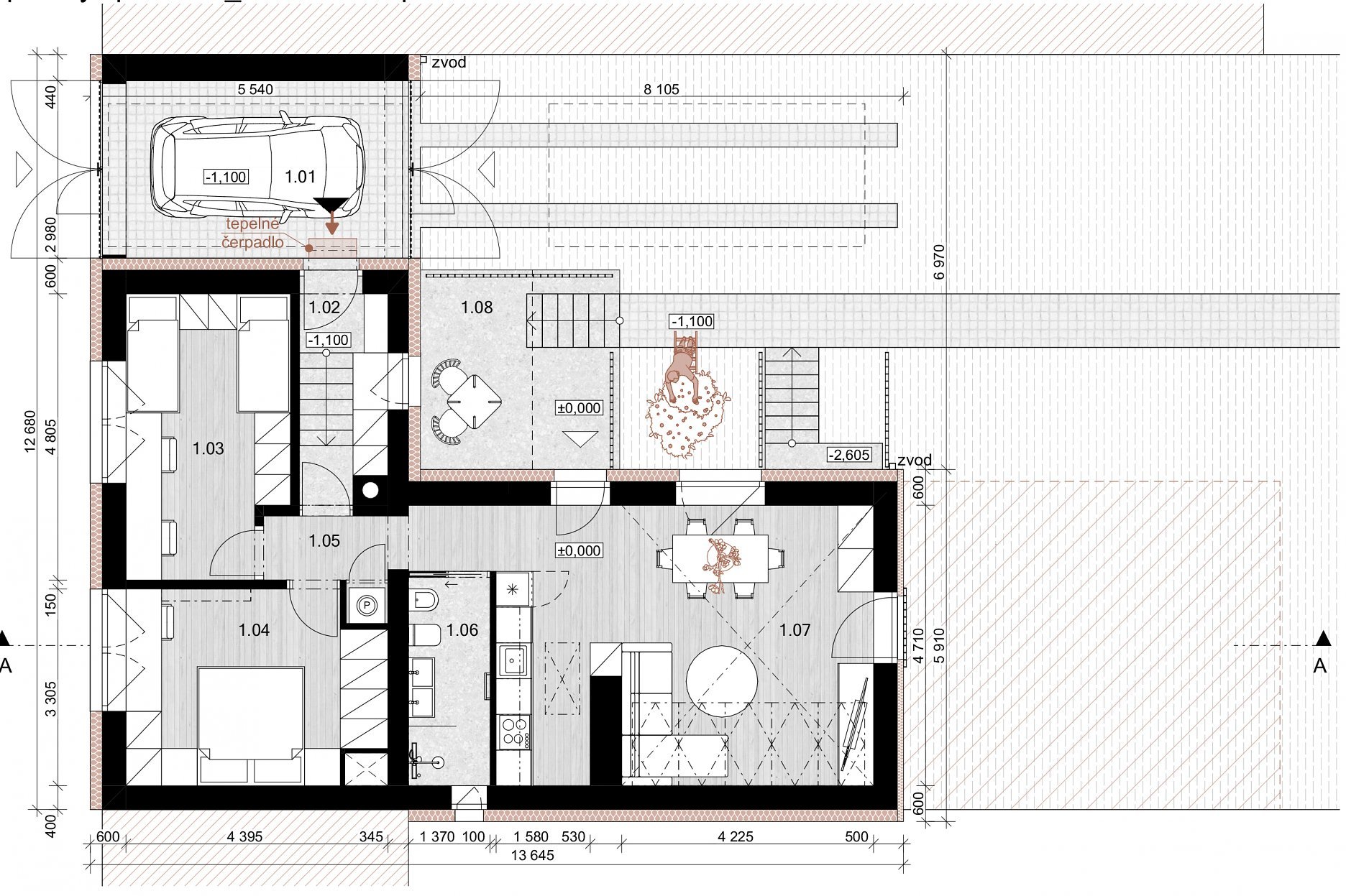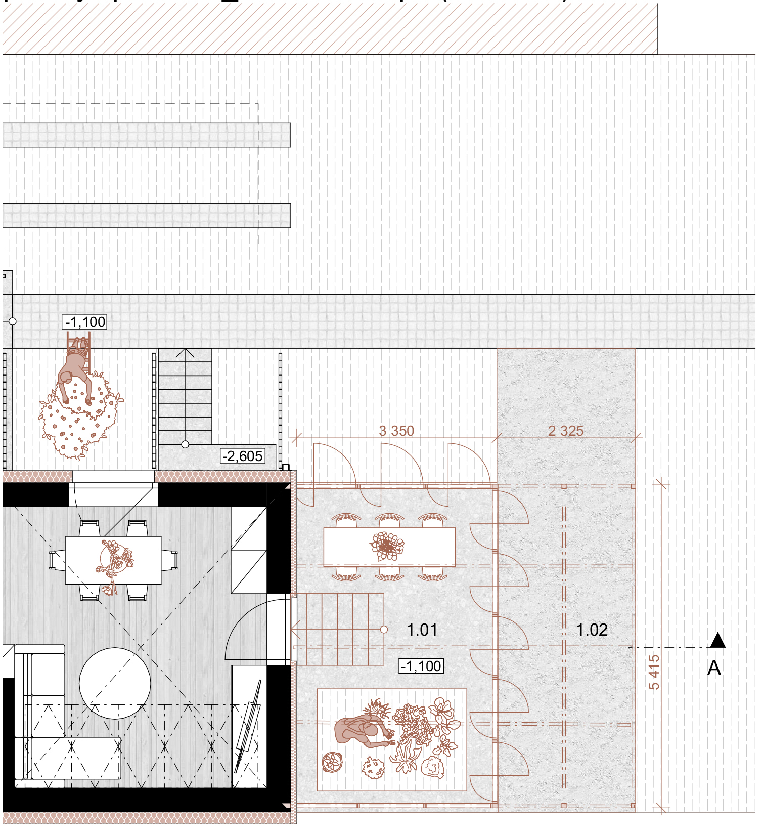 Okrem dispozičných a prevádzkových vzťahov je potrebné vyriešiť aj vyhovujúce napojenie exteriéru na existujúci suterén, nakoľko v pôvodnom stave existujúce schodisko nemá dostatočné dimenzie na manipulovanie s technológiou, ktorá je tam v návrhu umiestnená. Rovnako je nevyhovujúce aj pre užívateľa pri bežnej manipulácií a skladovaní potravín, záhradného nábytku a ostatných užívateľských potrieb.