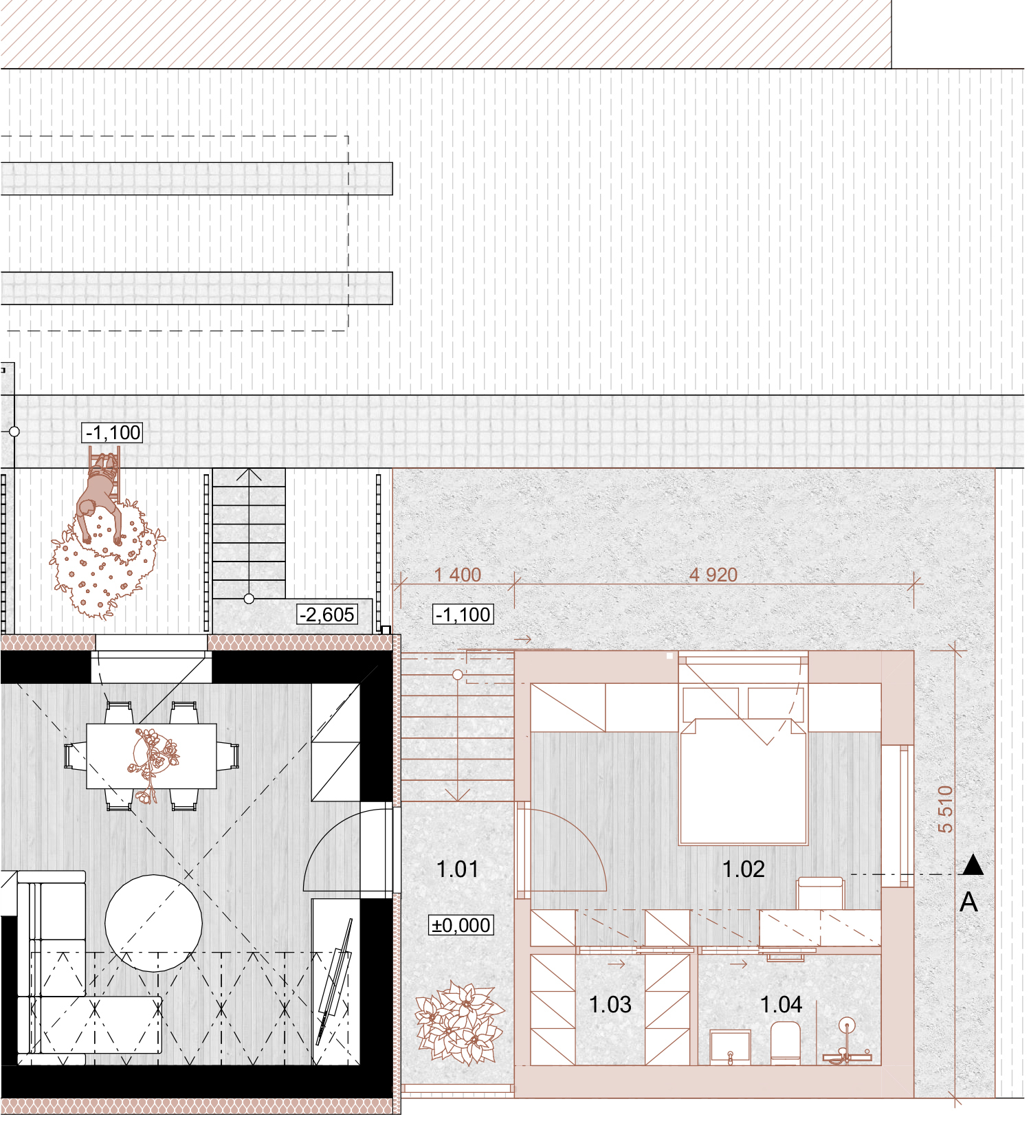 Scenár A – k pôvodnému objektu je pristavaná samostatná súkromná jednotka, ktorá je okrem spoločenskej zóny prístupná aj samostatným vchodom zo záhrady. Skladá sa zo šatníka, kúpeľne a spálne a v tejto podobe môže predstavovať hosťovskú zónu, spálňu starých rodičov pri viacgeneračnom bývaní, prípadne spálňu rodičov pri potrebe adaptácie pôvodnej spálňe na ďalšiu detskú izbu.
