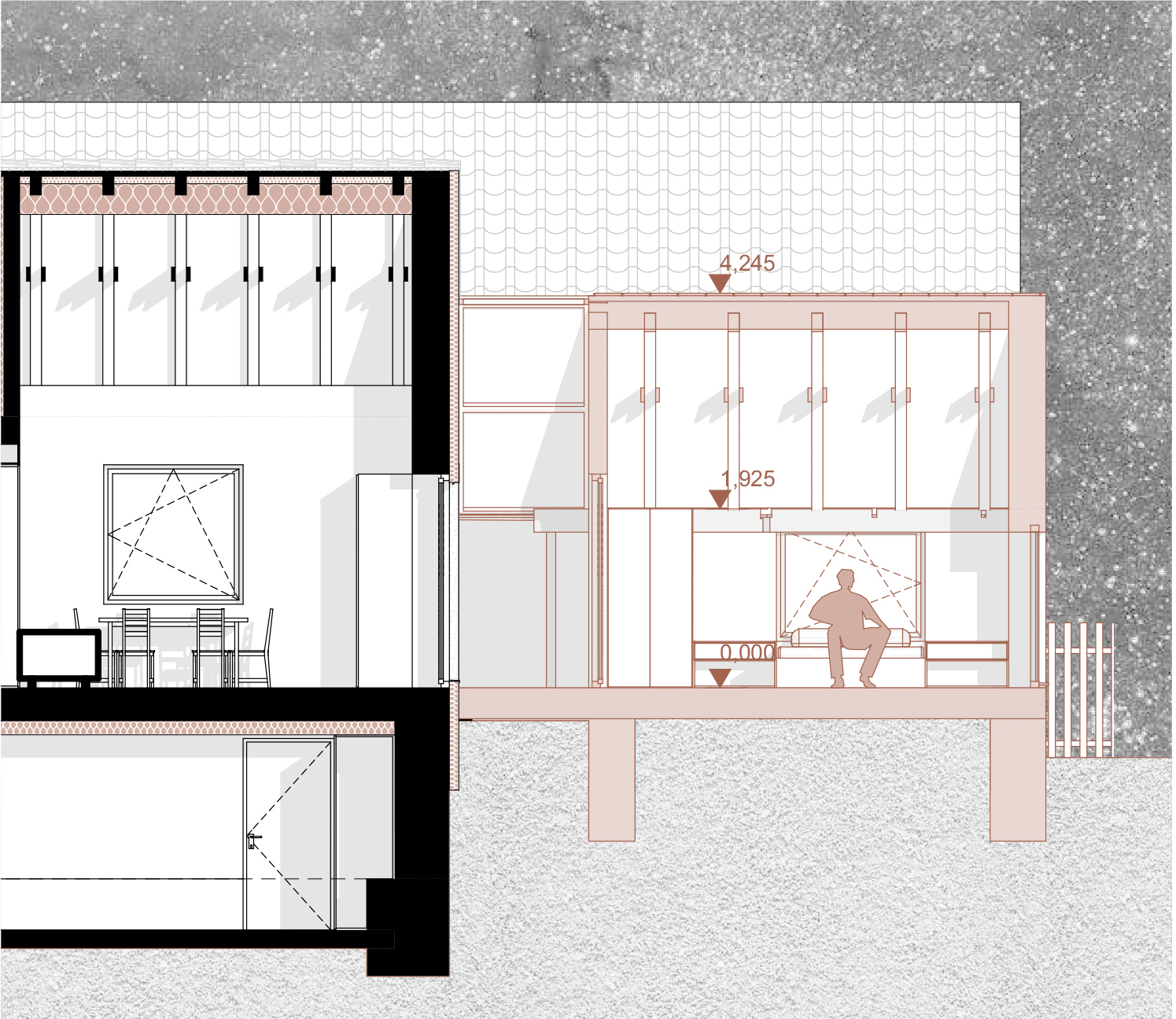 Táto samostatná jednotka je od pôvodného objemu oddelená presvetlovacím medzipriestorom, ktorý zabezpečí difúzne presvetlenie obývačky cez nové dvere v mieste pôvodného okna. Okrem toho ho možno vnímať aj ako energeticky efektívny medzipriestor – nárazníková zóna, vďaka ktorému sa neeliminujú solárne zisky z pôvodného okna.