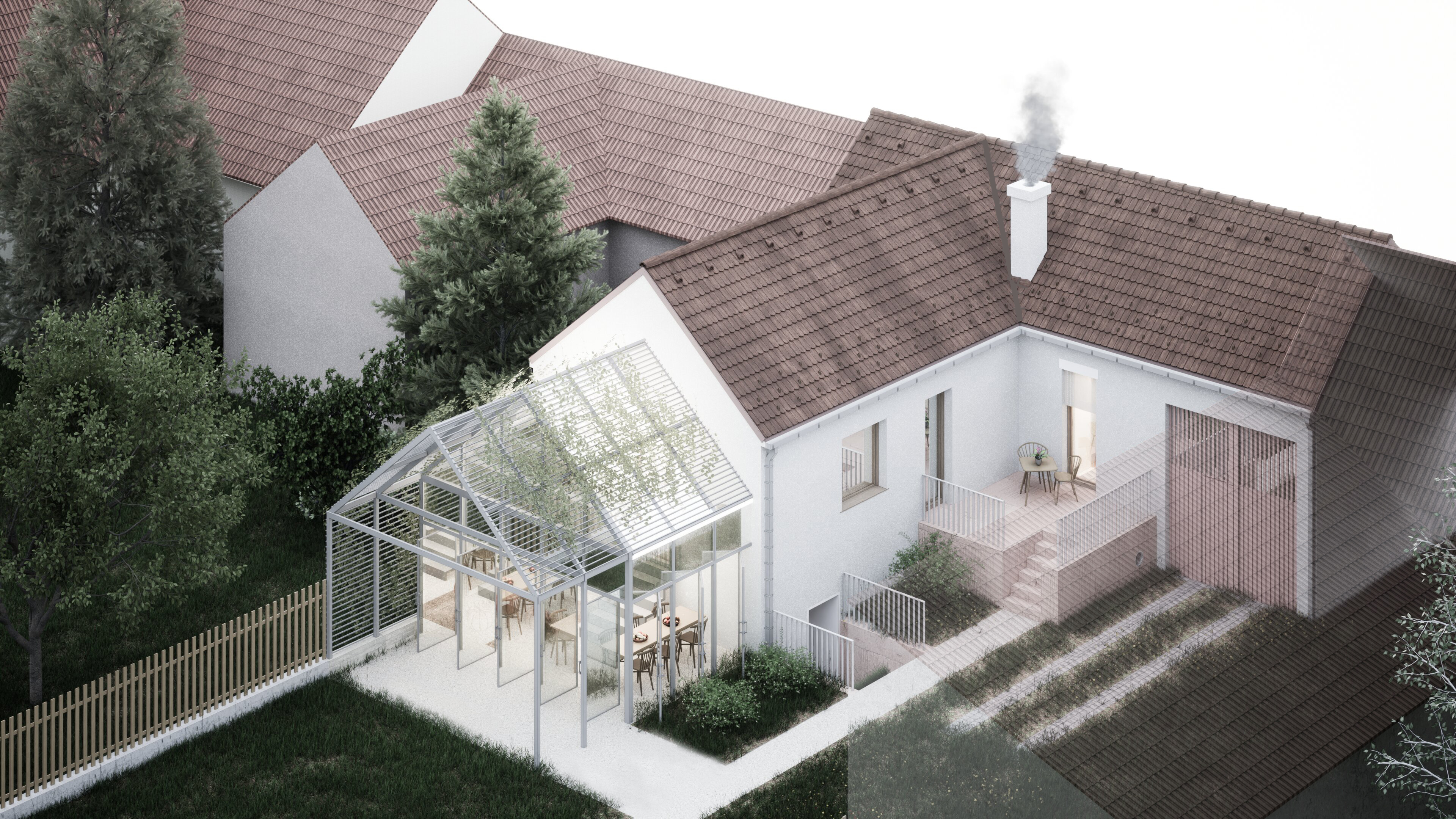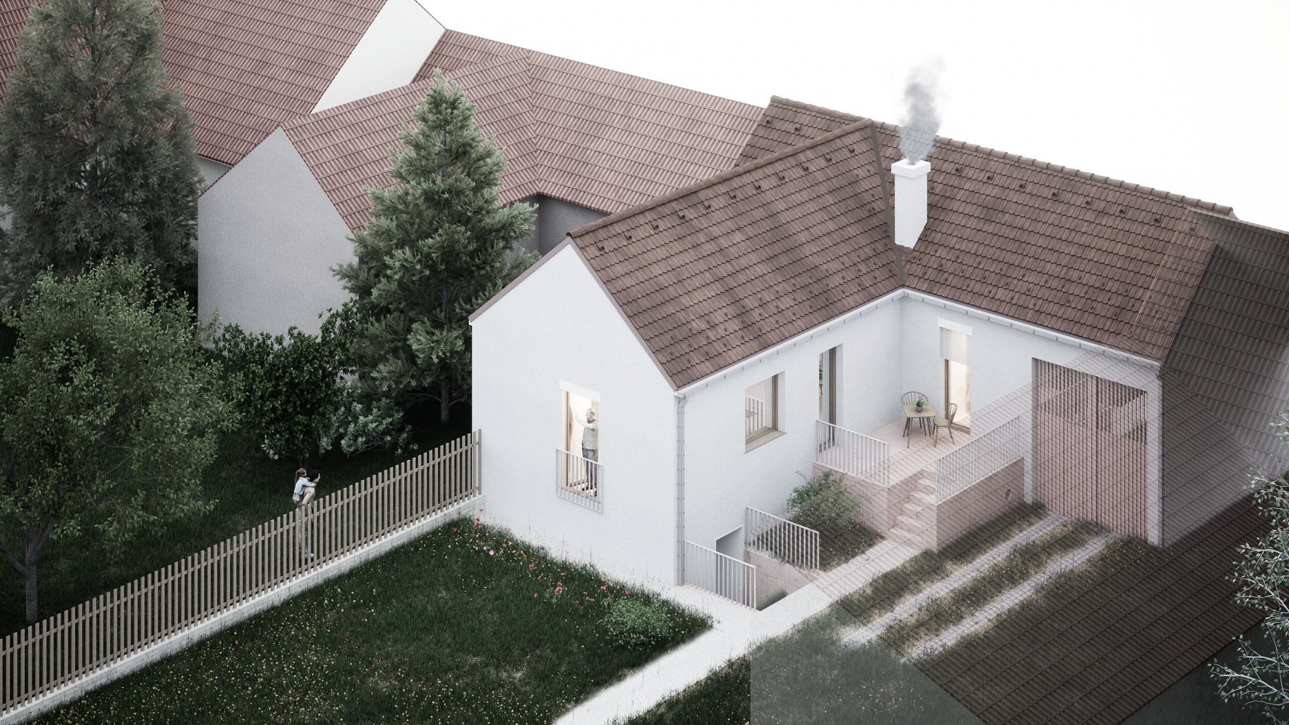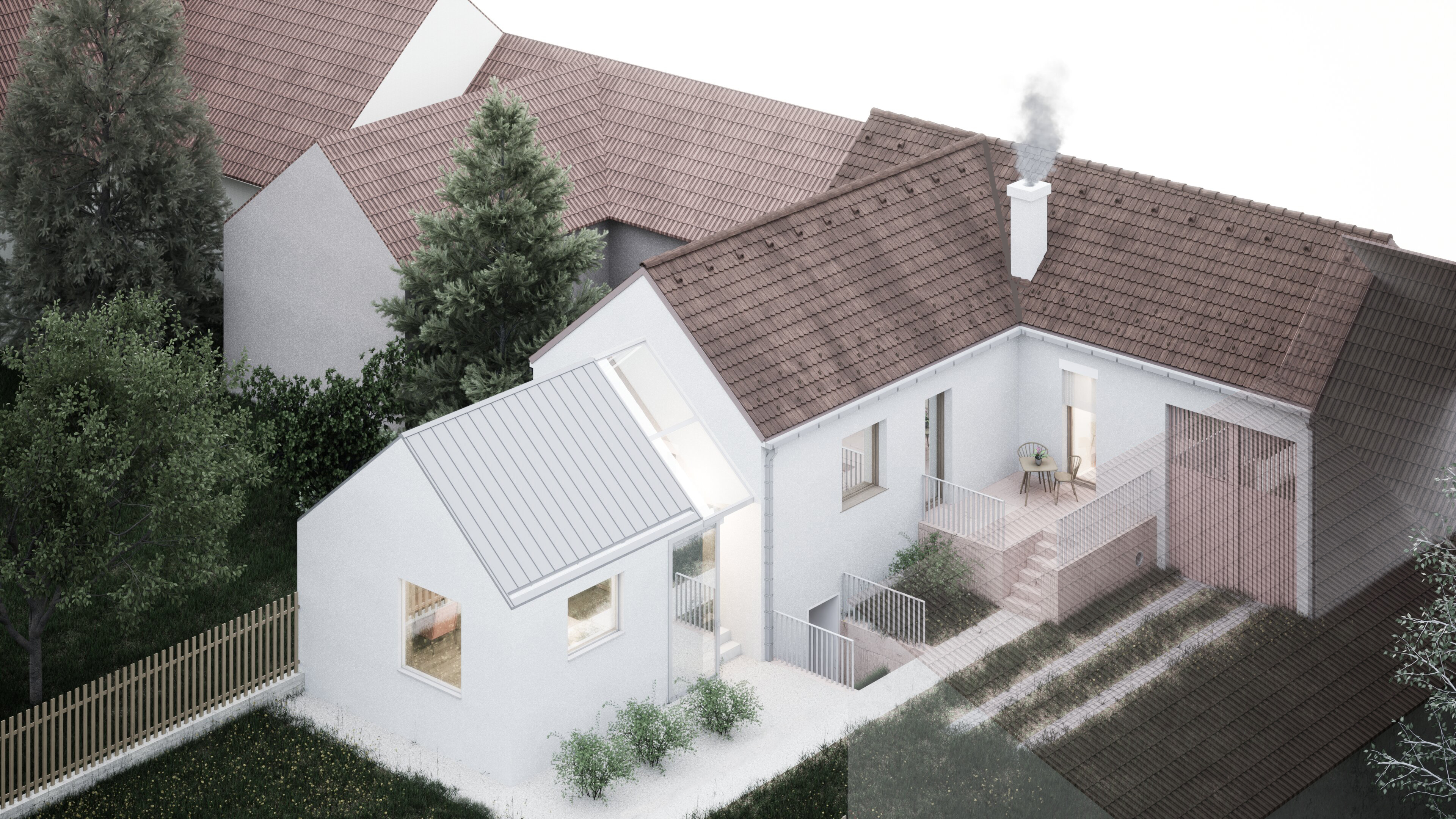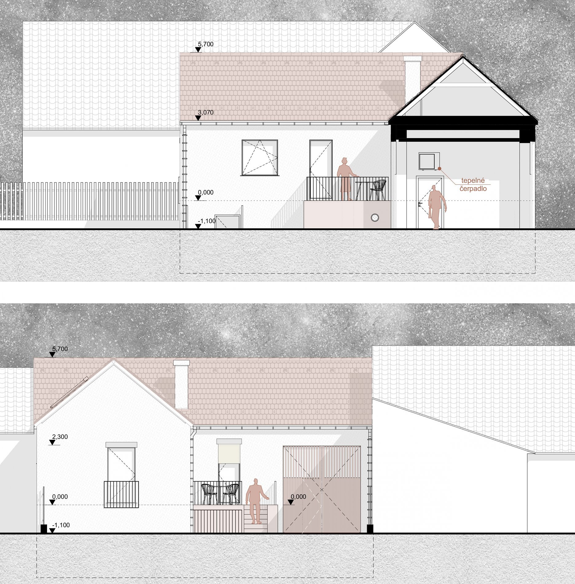 Toto základné usporiadanie umožňuje jednoduchú etapizáciu v prípade potreby ďalších obytných kapacít. Existujúce okno na štítovej fasáde zo strany dvora bude nahradené dverami a je tak zabezpečený prístup do novej časti domu priamo zo spoločenskej zóny. V návrhu vykresľujeme dva scenáre dostavby (z množstva iných alternatív, ktoré je možné prispôsobiť konkrétnym požiadavkám užívateľa vďaka dosiahnutiu variabilnosti dostavby vzhľadom na navrhované riešenie pôvodného objektu).