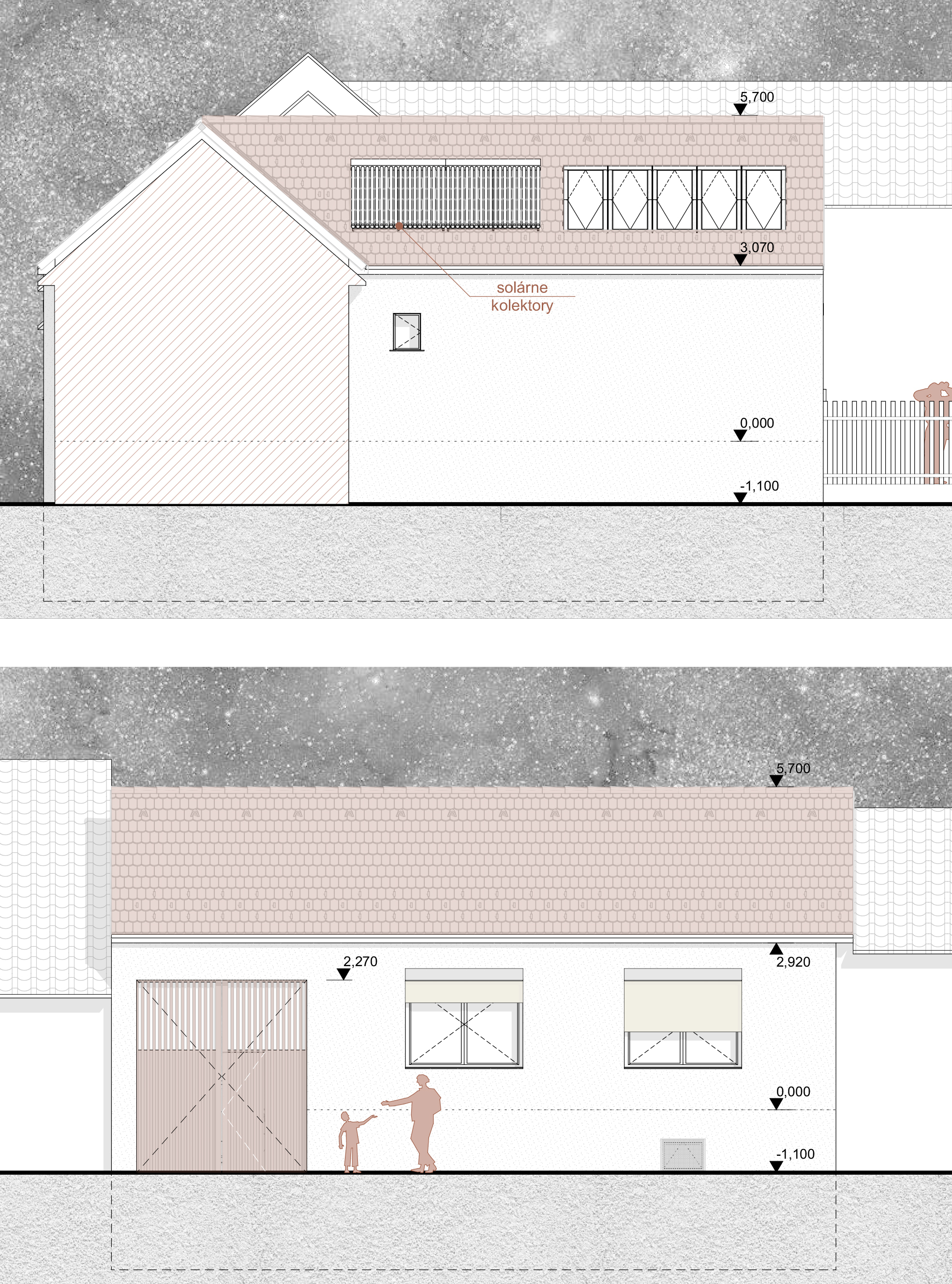 Samotný objekt nie je orientovaný práve najvhodnejšie. Z dôvodu severného nádvoria a okien, ktoré sú orientované do tohto priestoru sú straty príliš vysoké a solárne zisky nízke. Nové okná na južnej fasáde nie sú možné zrealizovať, nakoľko sa tu objekt nachádza na hranici pozemku. Aj z tohto dôvodu bolo do strešnej roviny navrhnutých 5 strešných okien, ktoré zabezpečia dostatočné presvetlenie obývacej miestnosti, zvýšia solárne zisky v objekte a tým sa zlepší aj vnútorné prostredie domu.