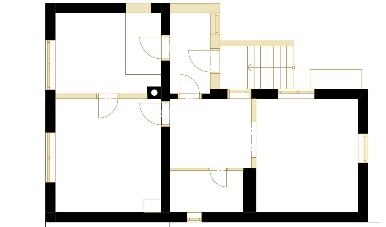 Dom je navrhovaný tak, aby bola jeho dispozícia plne funkčná a vyhovujúca najmä v prípade, že nedôjde k navyšovaniu stavebnej hmoty. V tomto základnom objeme sa skladá z vstupného priestoru, dvoch samostatných nepriechodných spální (čo je prínosom oproti pôvodnej dispozícii), kúpeľne s WC a spoločenskej zóny (kuchyňa + jedáleň + obývacia izba). Strop pôvodného suterénu, ktorý sa nachádzal pod odstráneným „prílepkom“ je využitý ako terasa a je z obývačky priamo prístupná. V rámci spoločenskej zóny je navrhnuté otvorenie stropu a vytvorenie galérie. Do strešnej roviny sú v tomto mieste navrhnuté nové svetlíky, ktoré zabezpečia dostatočné presvetlenie spoločenskej zóny – zvýšia sa solárne zisky aj z južnej strany, ktoré pri tomto dome absentujú.