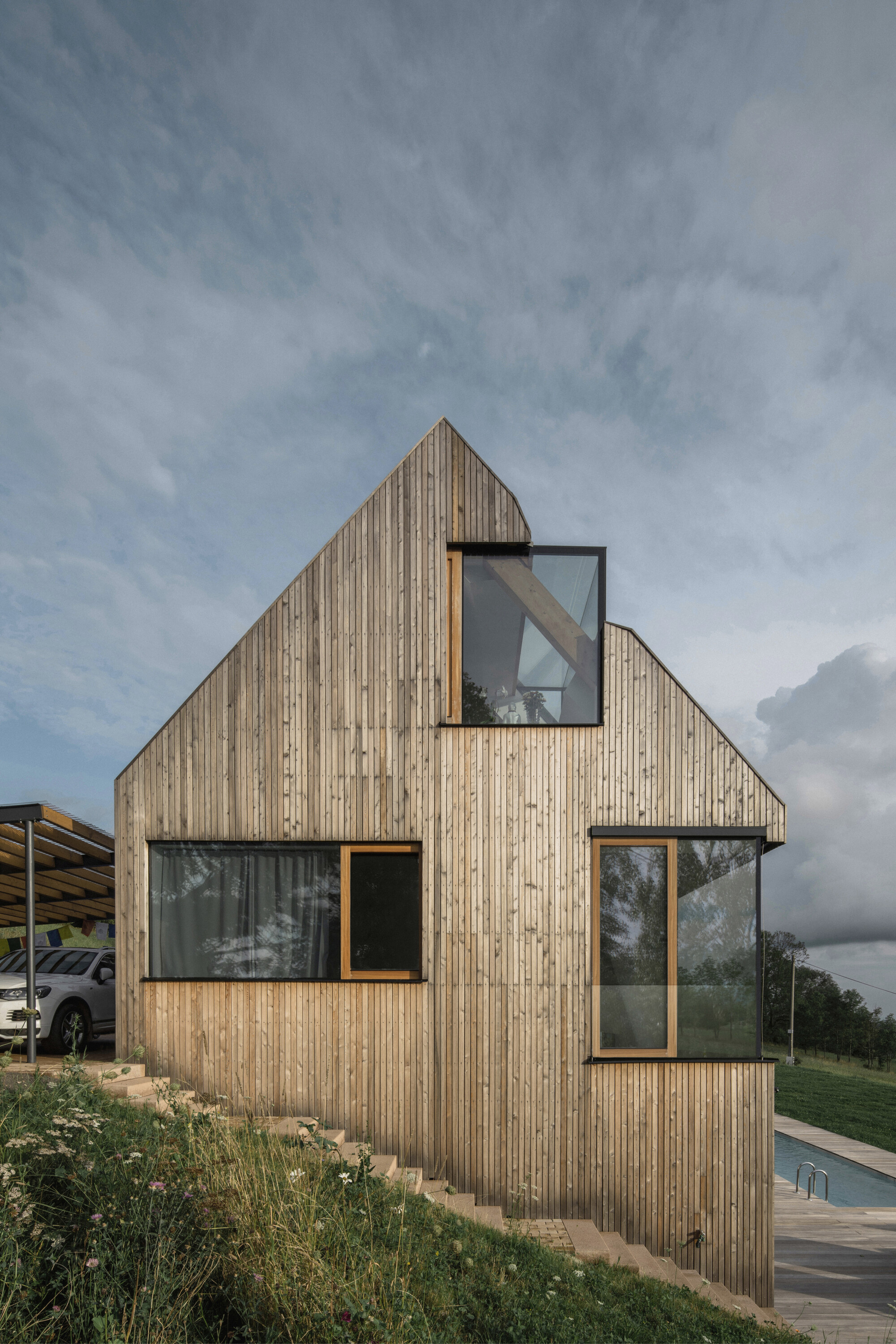 Bezrámové okná, ktoré podčiarkujú architektonickú kompozíciu, dopĺňajú pohyblivé krídla so smrekovcovými rámami. Prírodné drevo korešponduje s obkladom fasád.