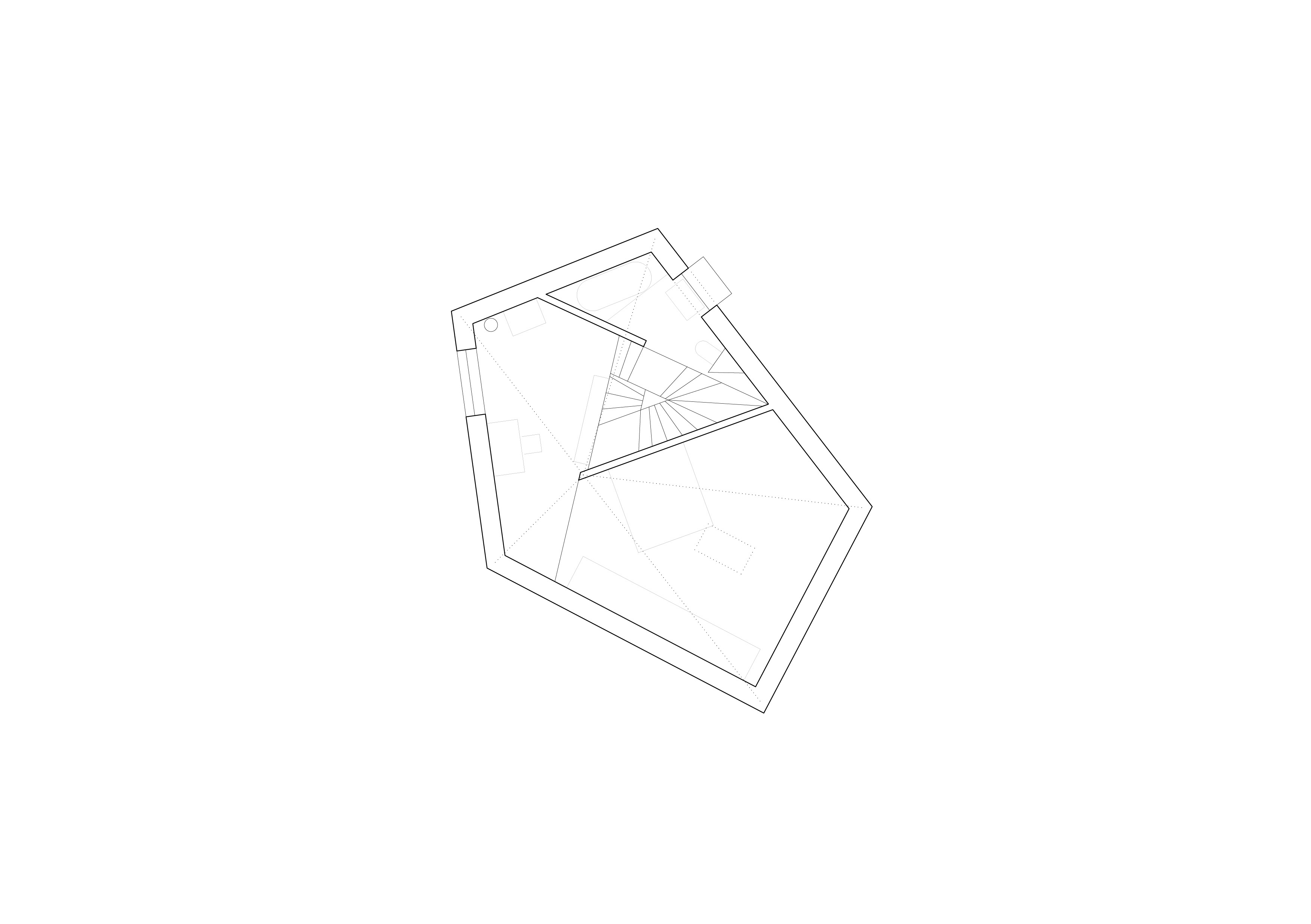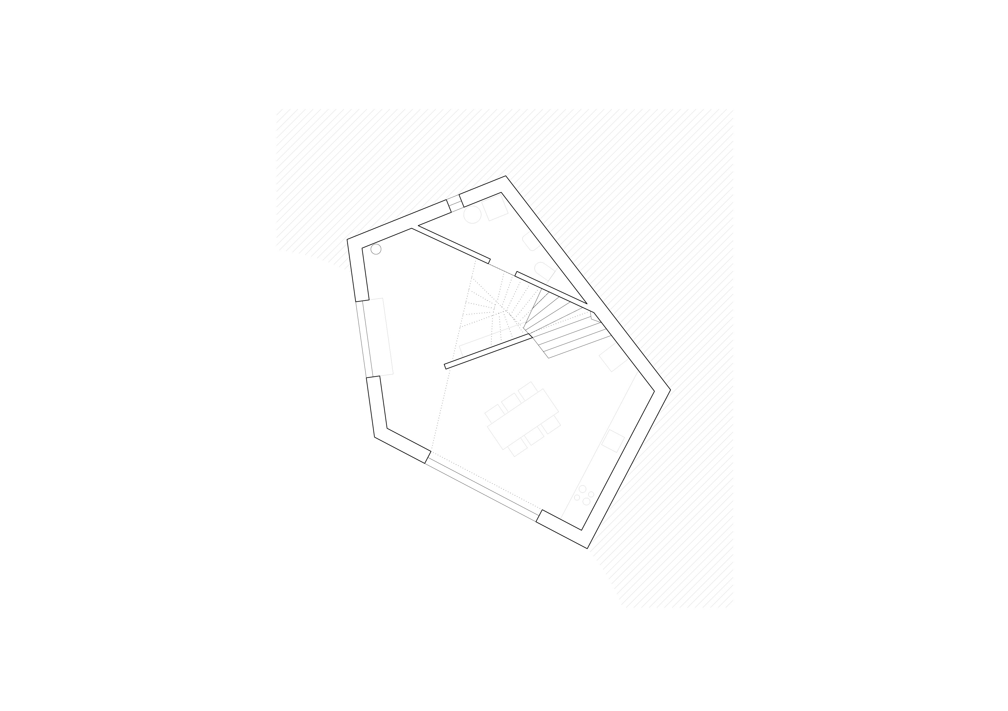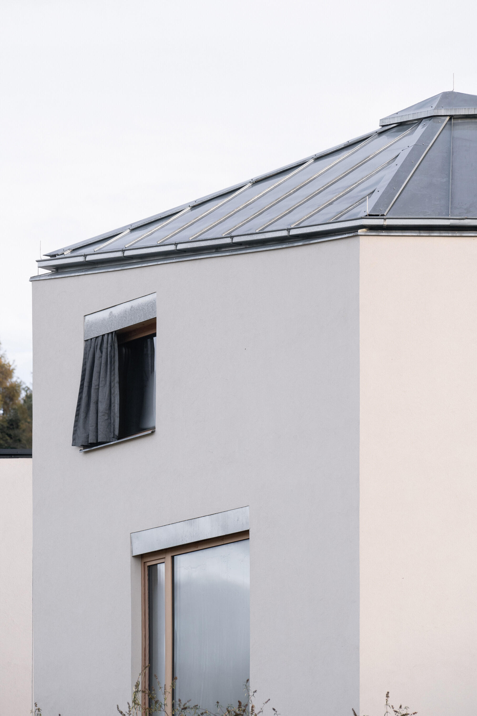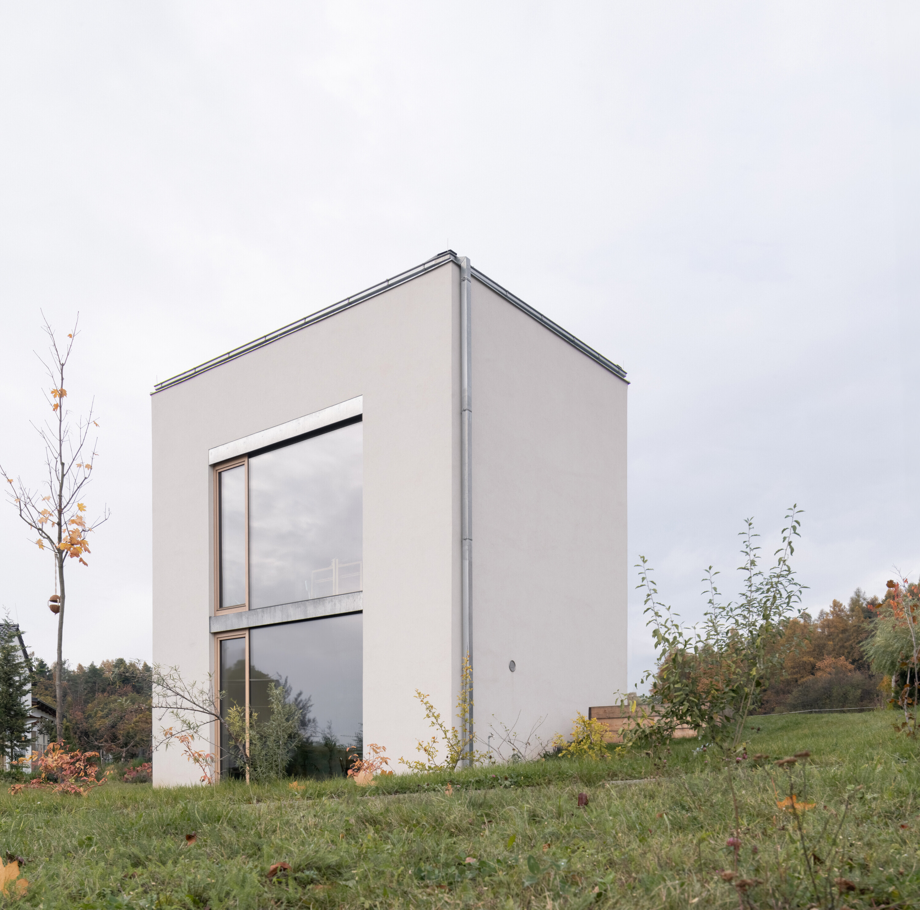 Dom sa nachádza na svahovitom pozemku s výhľadmi do okolitej krajiny. Nepravidelný päťuholníkový pôdorys so zastavanou plochou približne 63 m² umožňuje efektívne využitie menšej parcely a necháva voľný priestor pre záhradu. Vonkajšie architektonické stvárnenie vychádza najmä z vnútorného priestorového konceptu. “Přístup spočívá v rozdělení prostoru na různé úrovně, z nichž každá nabízí odlišné světelné podmínky, výhledy a úroveň intimity. Díky tomu je vytvořen pocit prostornosti a neustálého pohybu - každý roh nebo průchod v domě přináší nový pohled na vnější prostředí nebo do dalších částí interiéru. Použití závěsů umožňuje variabilně měnit světelné podmínky a intimitu jednotlivých místností, což vytváří atmosféru, kterou lze snadno přizpůsobit různým momentům dne,” vysvetľujú svoj zámer architekti.